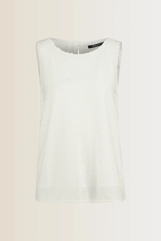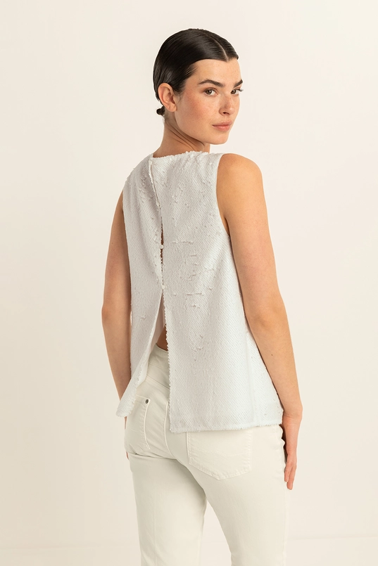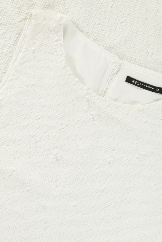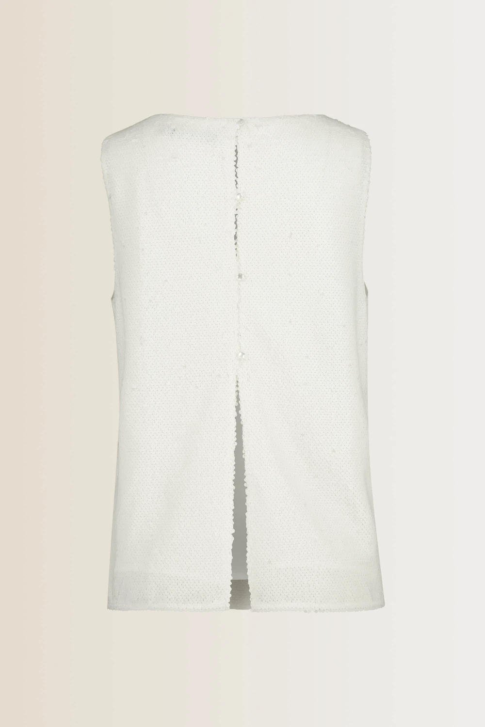 Witte mouwloze top – paillettenstof. Recht & relaxed, ronde hals. All-over bestikt met pailletten, gevoerd: prikt niet op de huid. Everyday glamour met een cleane, frisse twist. Dress up met hakken en de bijpassende kokerrok, dress down met een casual (coloured) denim.