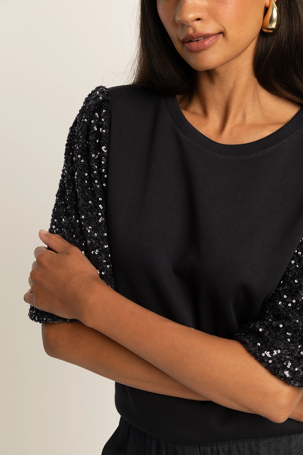Zwarte top – met paillettenmouwen. Een stijlvolle basic met een glamoureuze twist. De korte pofmouwen zijn rijkelijk bezet met glanzende pailletten en geven deze top een feestelijke uitstraling. De soepelvallende kwaliteit zorgt voor ultiem draagcomfort, terwijl de sprankelende details het item direct partyproof maken. Perfect voor een diner of avondje uit.