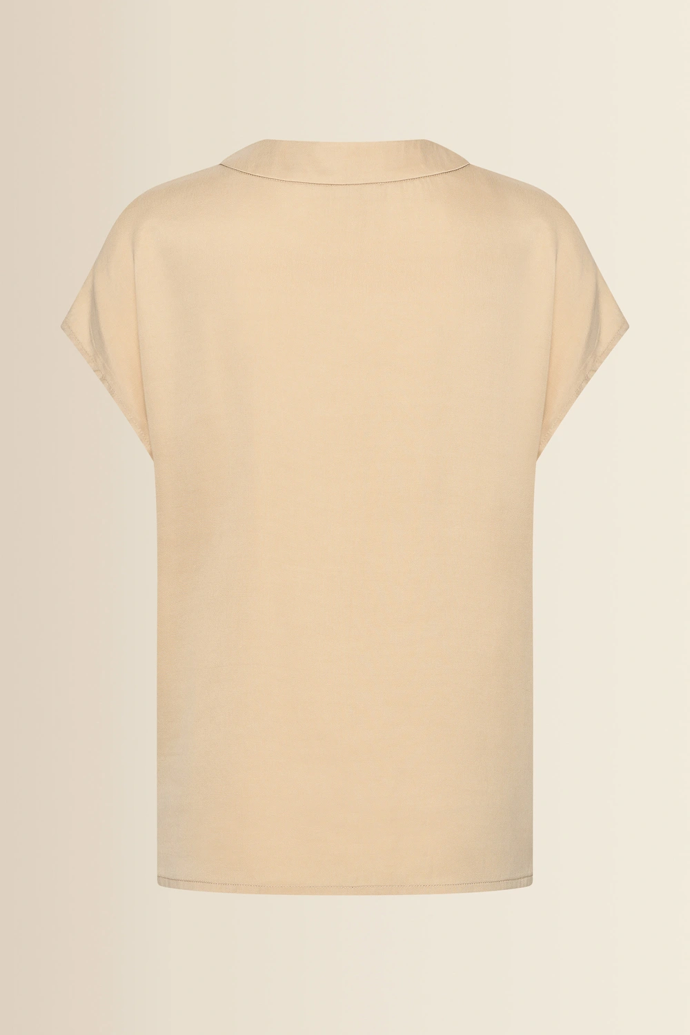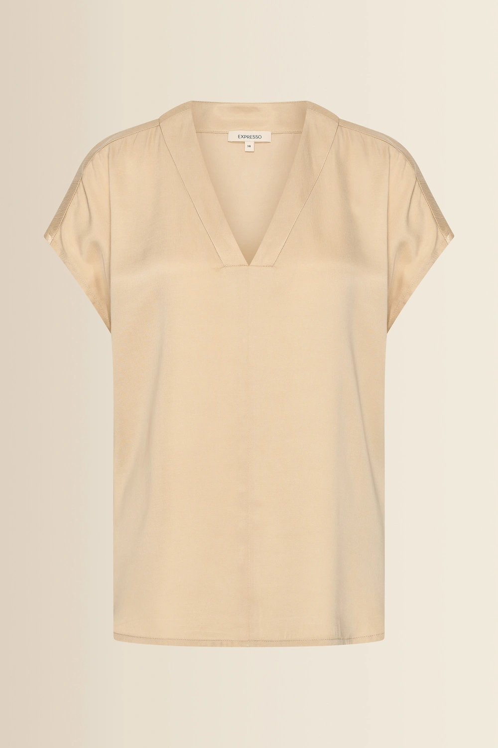 Blouse met V-hals – soepele, licht glanzende kwaliteit met een elegante uitstraling. Vrouwelijk en verfijnd, uitgevoerd met een flatterende V-hals en korte, losvallende mouwen. De zachte stof valt mooi om het lichaam en voelt heerlijk licht aan, waardoor deze blouse perfect is voor zowel casual als meer geklede momenten. Een stijlvolle essential die moeiteloos combineert met een pantalon, rok of denim.