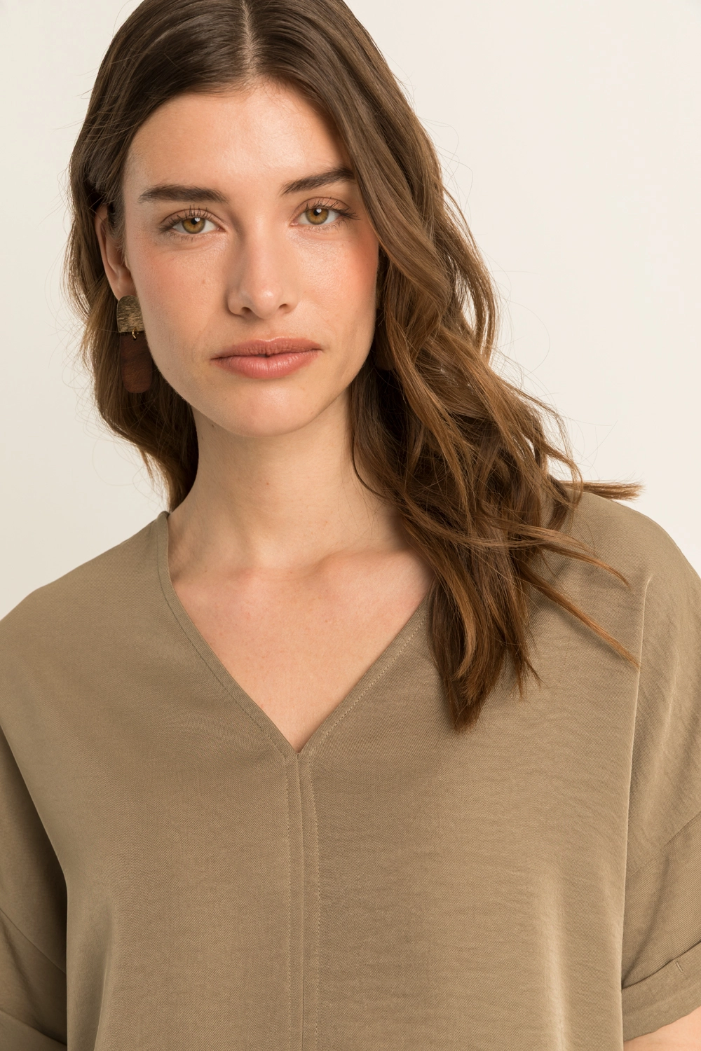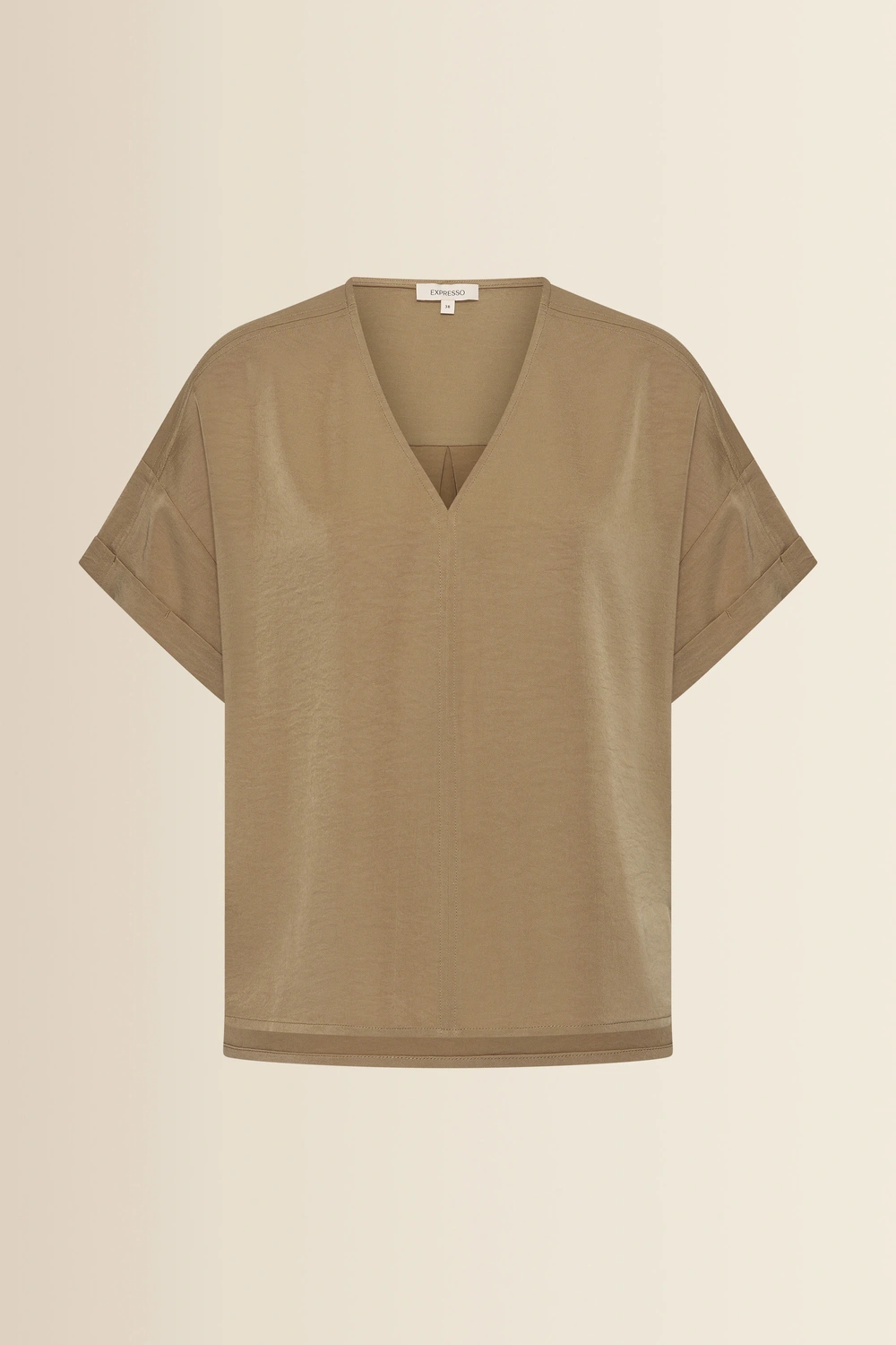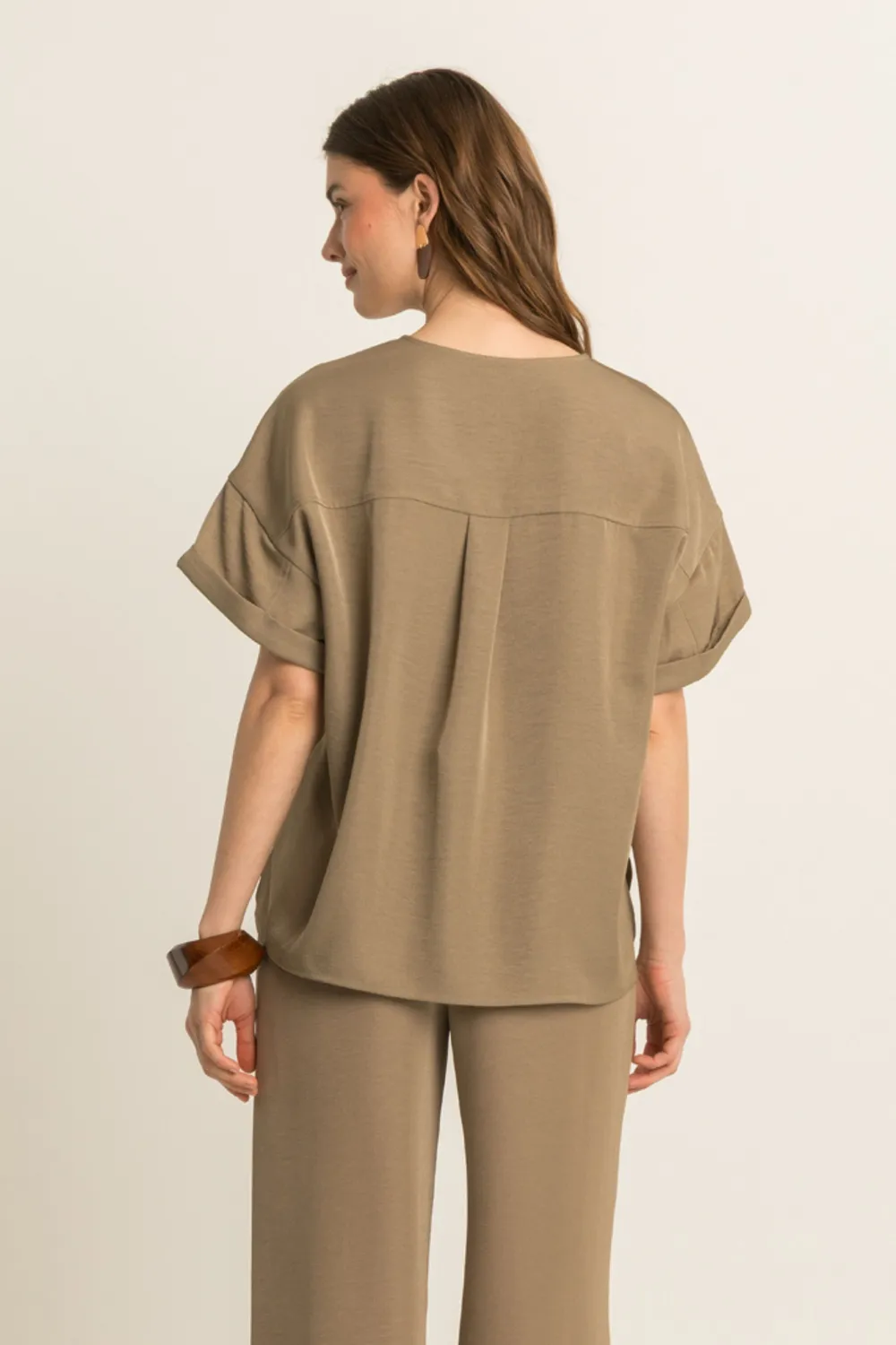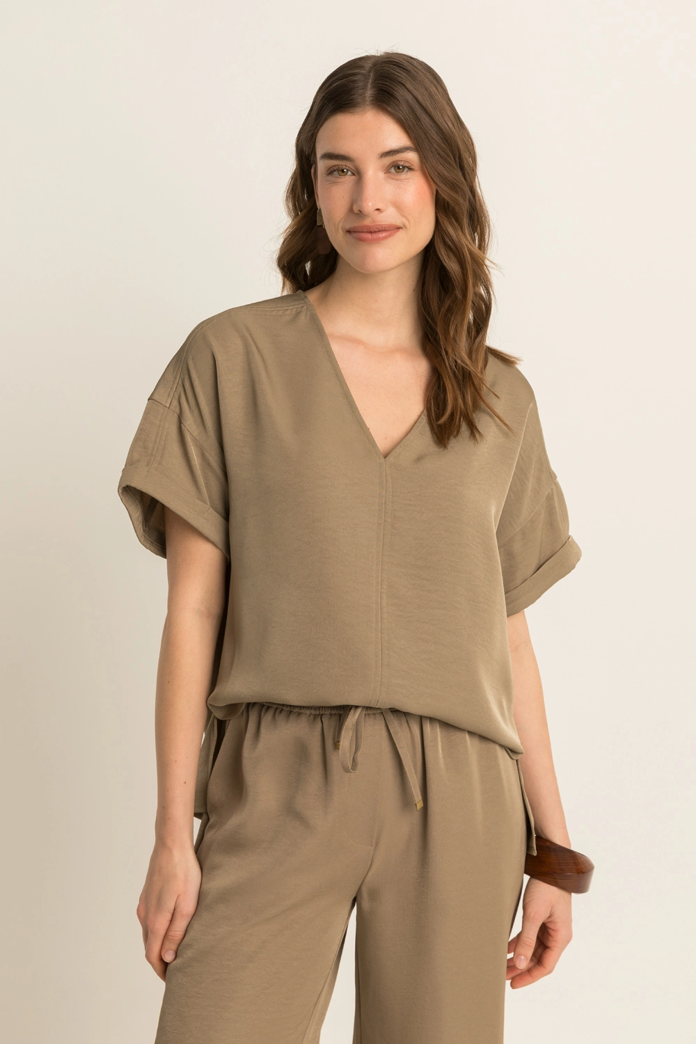 Top met V-hals – soepelvallende kwaliteit met een verfijnde, licht glanzende uitstraling. Relaxed en rechtvallend, met een V-hals en korte mouwen met omslag. De subtiele glans en luchtige feel geven deze top een elegante, moderne uitstraling, terwijl de comfortabele pasvorm moeiteloos draagt. Een stijlvol item dat elke look direct een verfijnde touch geeft.