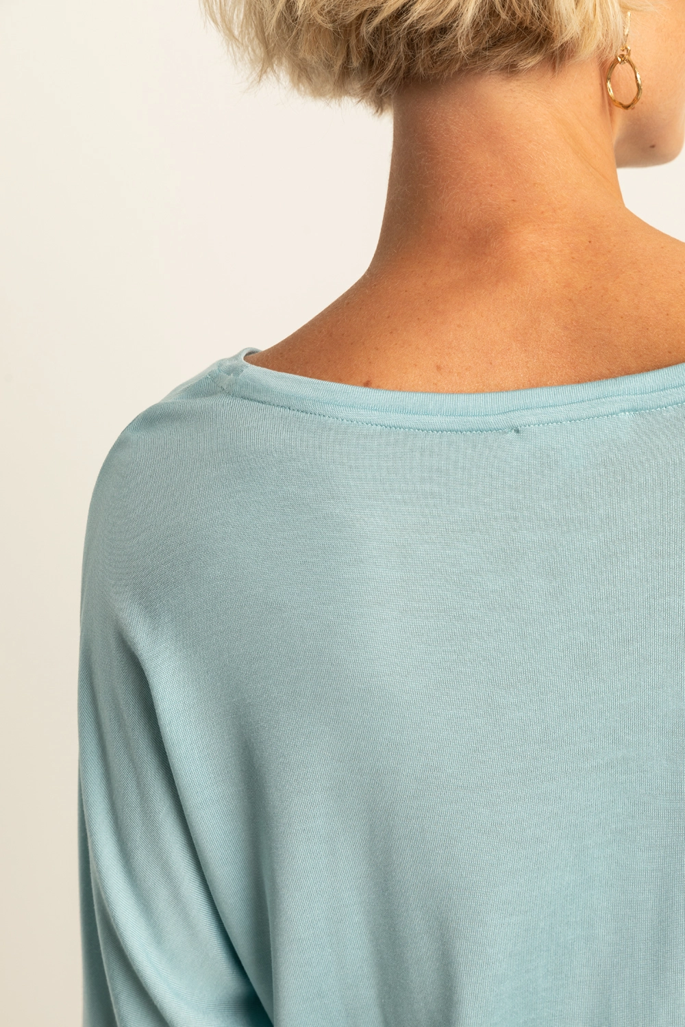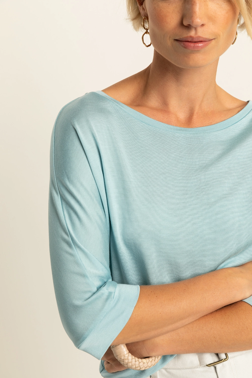 Blauwe top – soepelvallende jersey top met een comfortabele, moderne uitstraling. Recht en licht losvallend, met een wijde ronde hals, korte mouwen en een brede zoomboord die zorgt voor een mooie, zachte belijning. De soepele kwaliteit draagt prettig en geeft deze top een effortless feel die perfect past bij elke dag. Een ideale basic met nét dat beetje extra comfort en stijl.