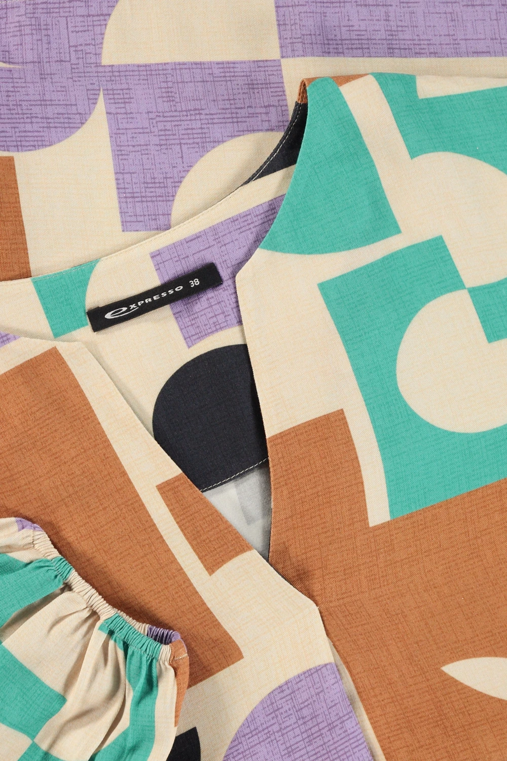 Blousetop met multicolour print – viscose. Ruimvallend, ronde hals met split, bloezende driekwartmouwen. Soepele satijngeweven stof, zachte peach finish. Vrouwelijke eyecatcher, past bij alle kleuren uit het thema ‘Street Style Edge’.