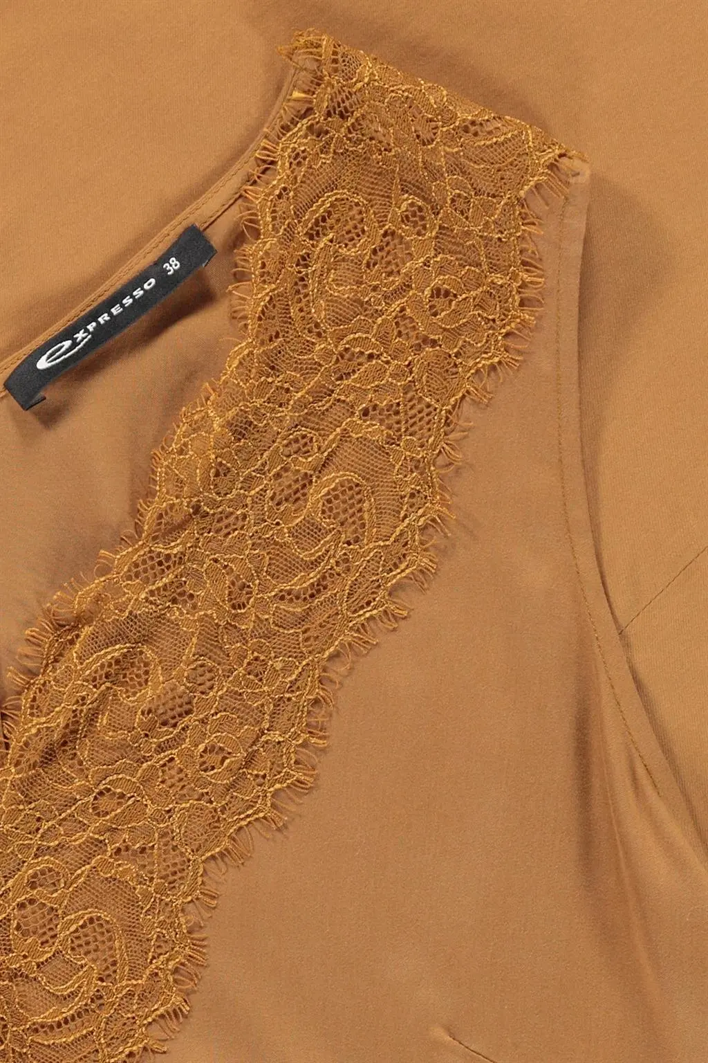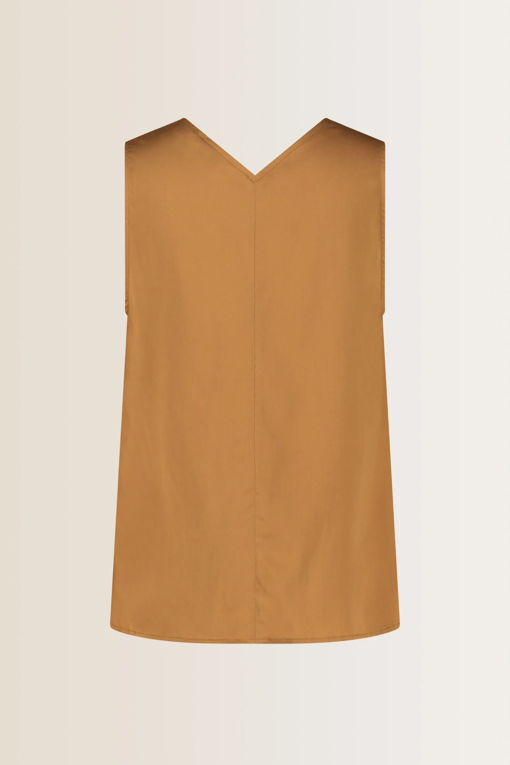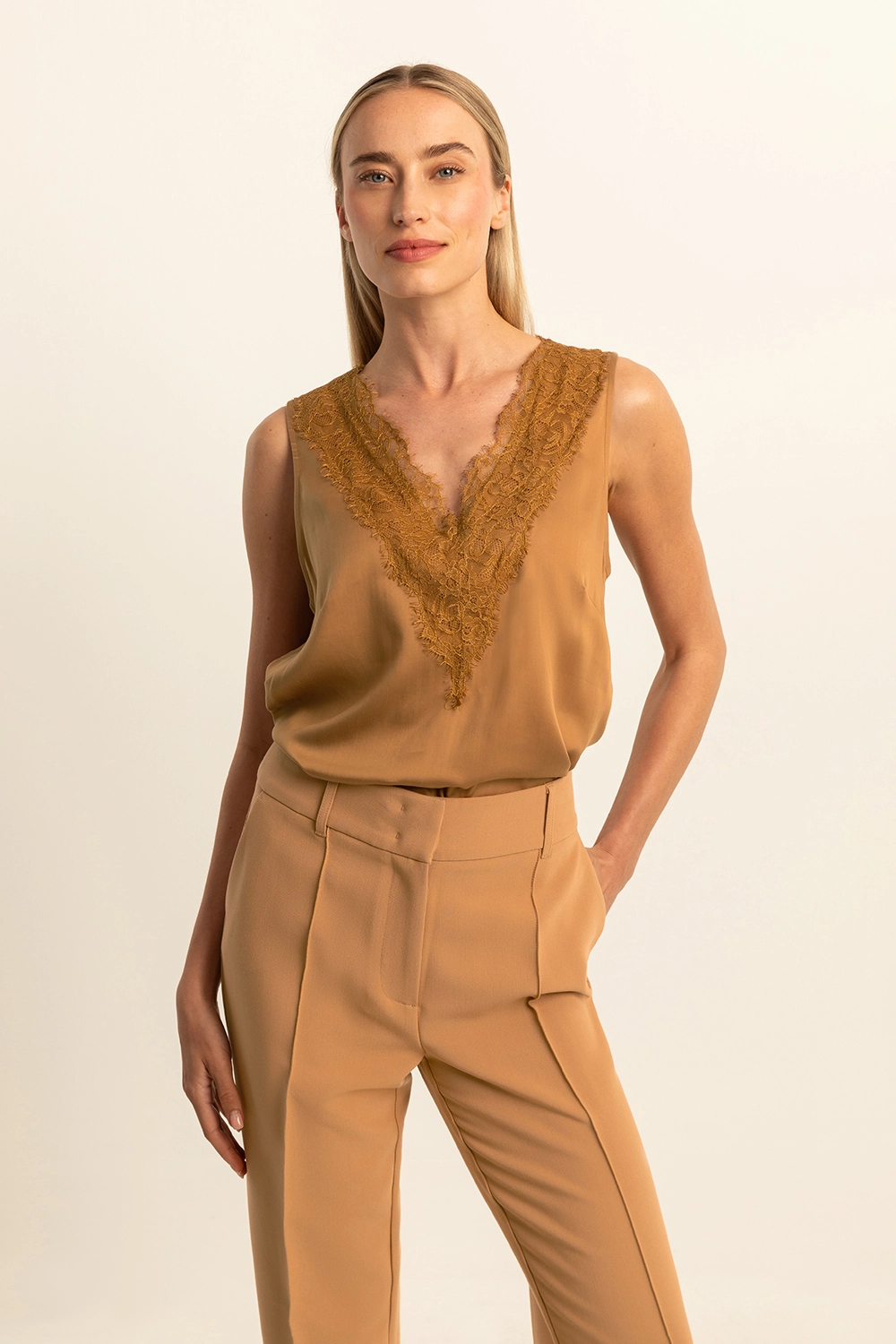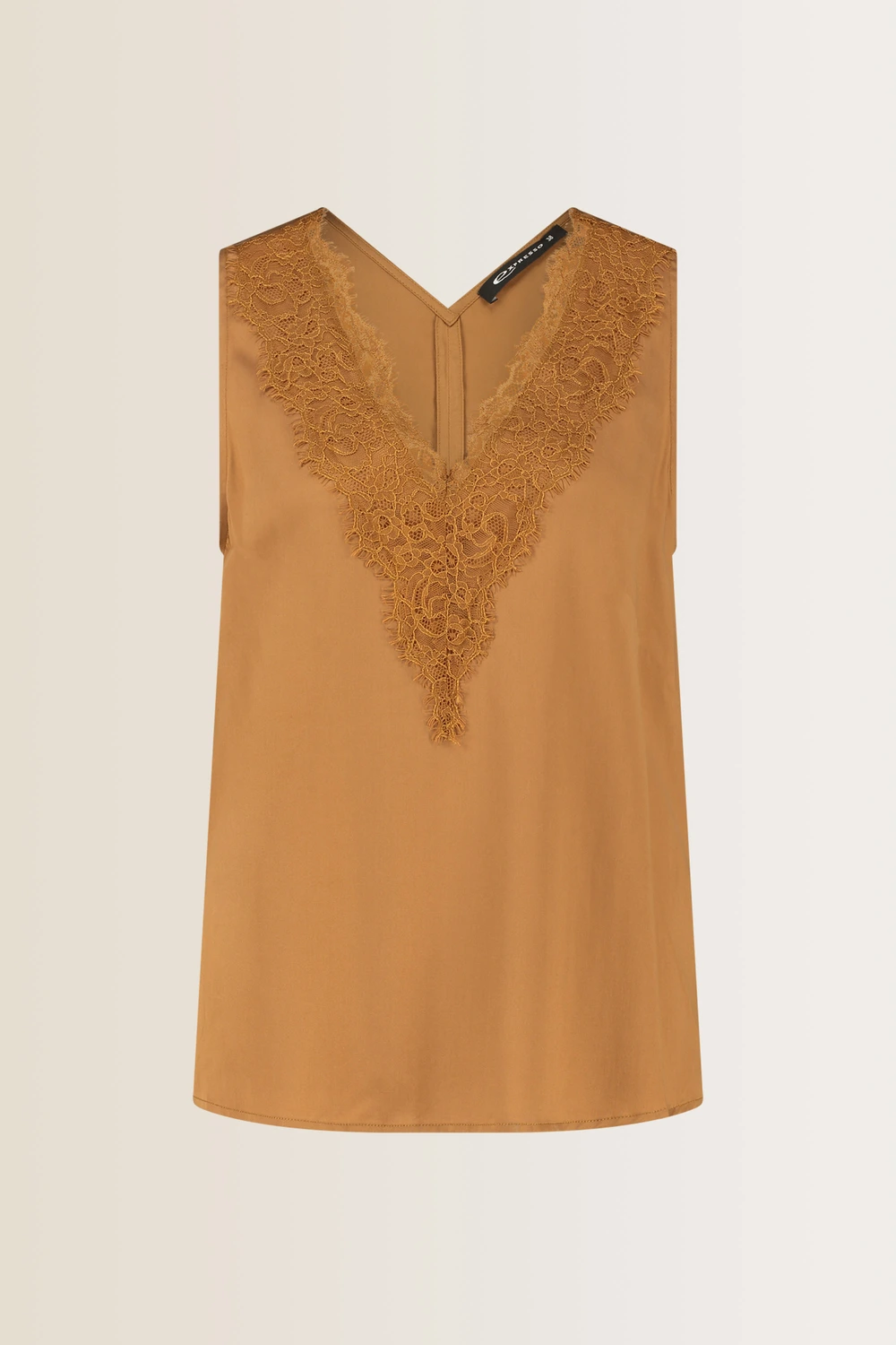 Camelkleurige mouwloze top met kant – tencel. Recht & relaxed, lage V-hals met kantrand, heuplengte. Subtiel glanzend satijn, geschulpt kant. Vrouwelijk en elegant, verkrijgbaar in dezelfde kleuren als onze essential blazers en broeken.