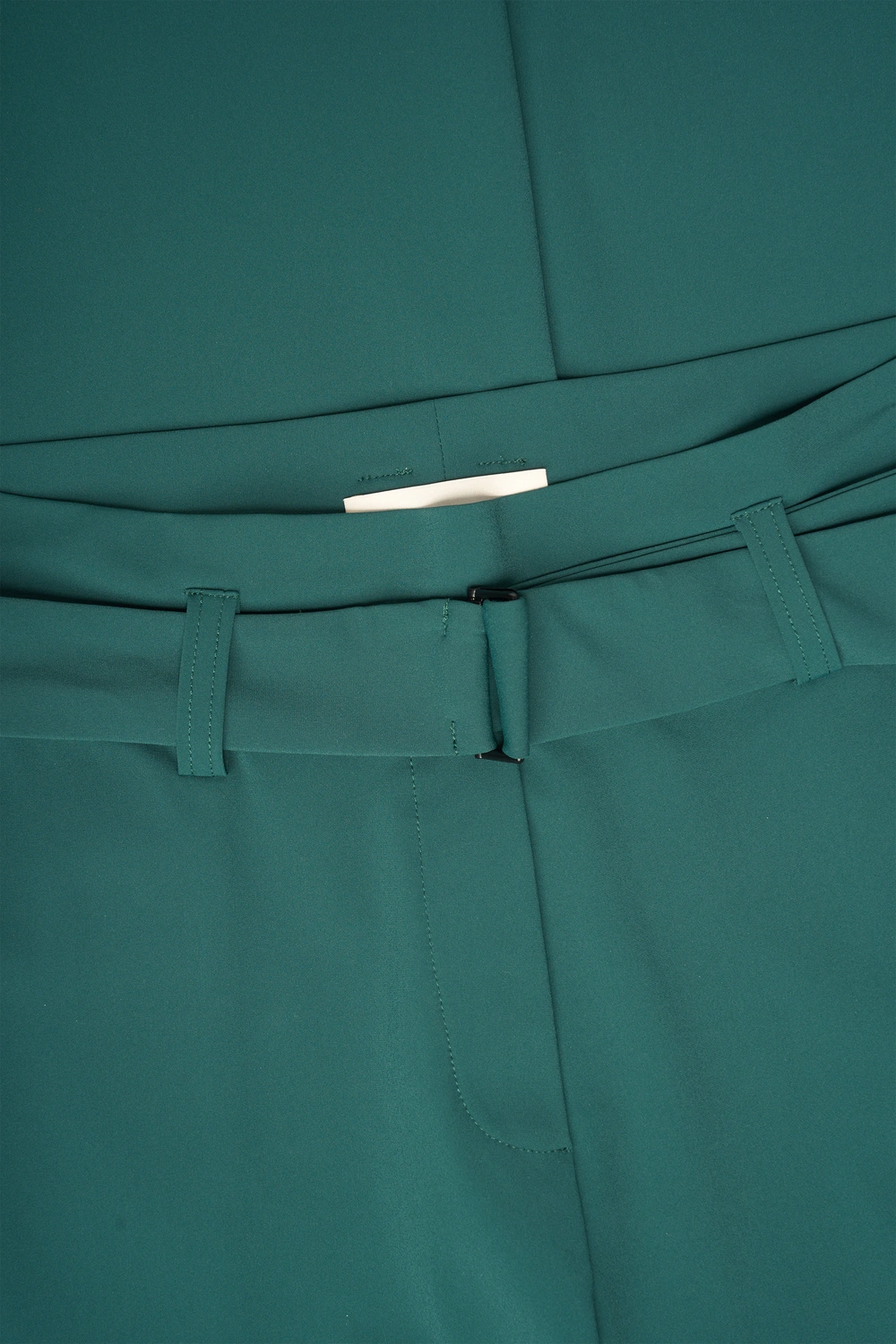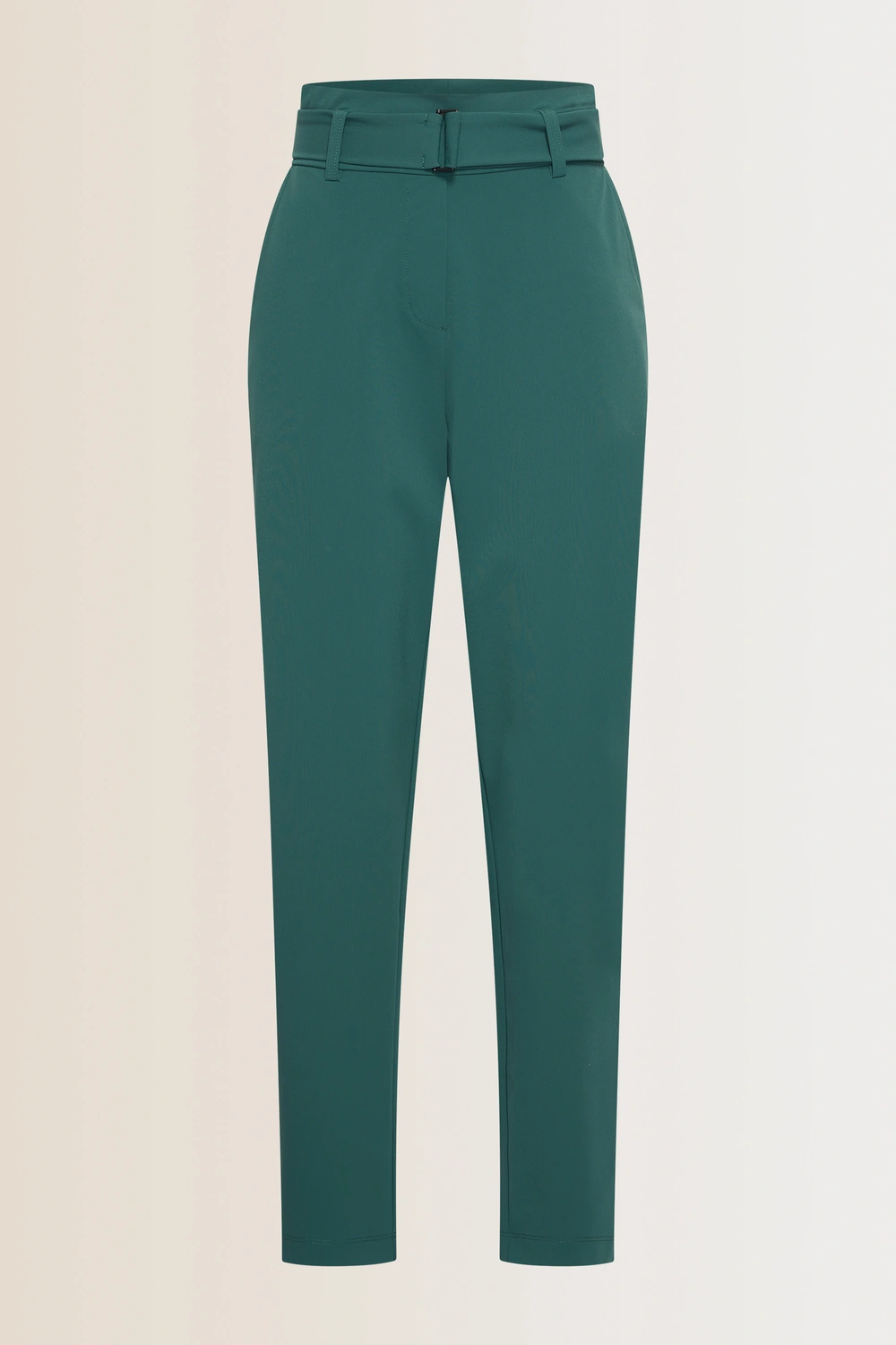 Groene travelbroek – comfortabele travelkwaliteit. Tapered-fit met een hoge taille, riemlussen en bijpassend ceintuur. De smalle pijpen geven een moderne uitstraling, terwijl de stevige, rekbare stof zorgt voor een flatterende pasvorm. Perfect als basis voor zowel zakelijke als casual looks. Combineer met een bijpassende blazer of een zachte knit voor een stijlvol ensemble.