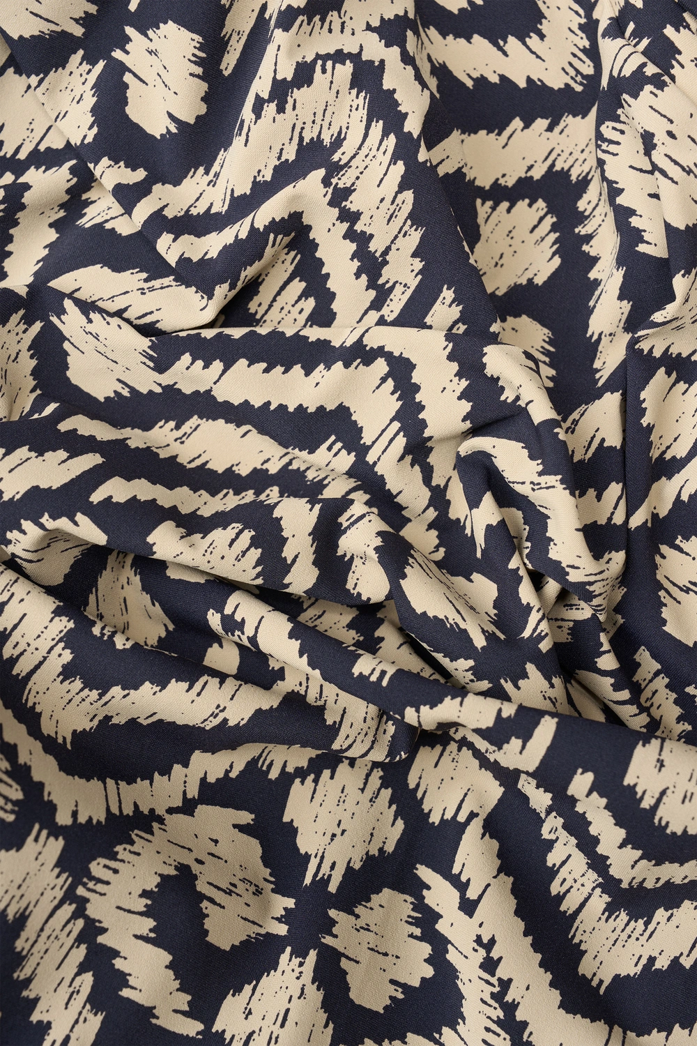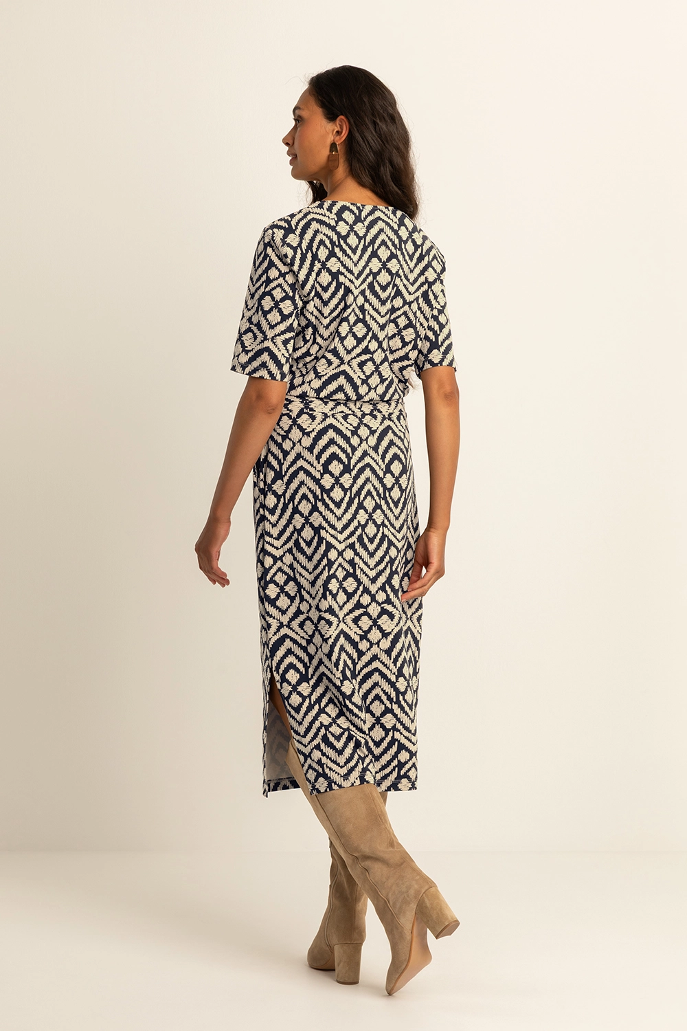 Blauw-beige midi-jurk – soepele travelkwaltieit met een opvallend grafisch dessin. Aangesloten fit met een vrouwelijke V-hals en korte mouwen. De bijpassende tailleceintuur accentueert de taille voor een elegante en verzorgde look. Perfect voor zowel kantoor als een stijlvolle avond uit.