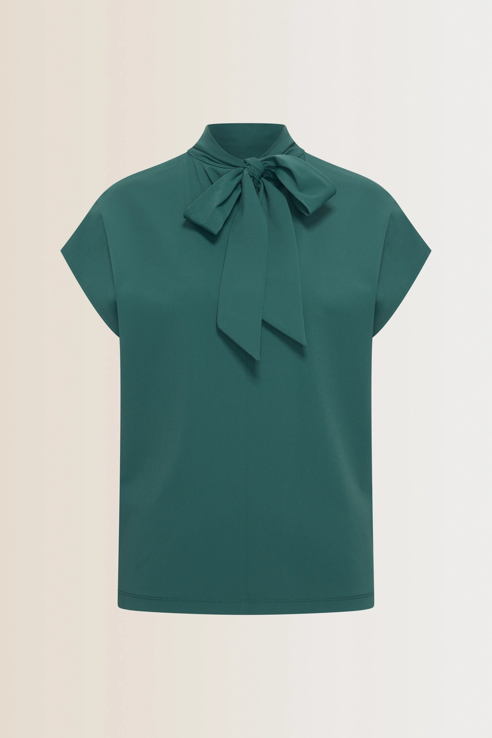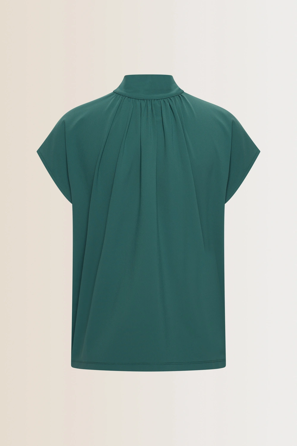 Groene top – travel kwaliteit met strikdetail. Relaxed-fit, kapmouwtjes, hoge hals met sierlijke strik. De elegante plooien in de hals geven deze top een vrouwelijke uitstraling.
