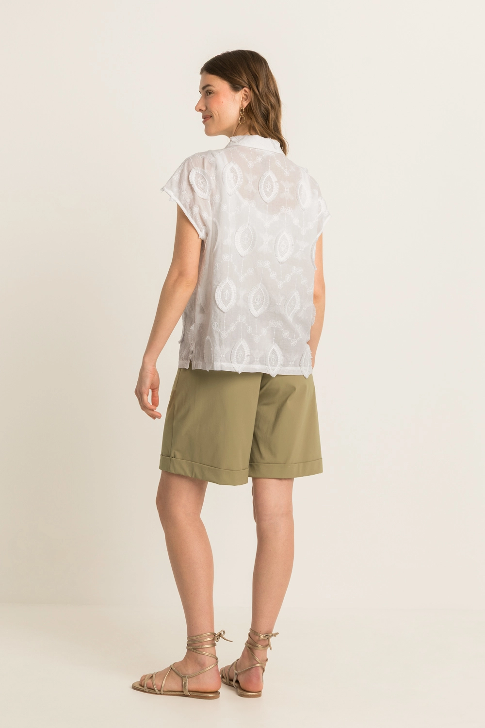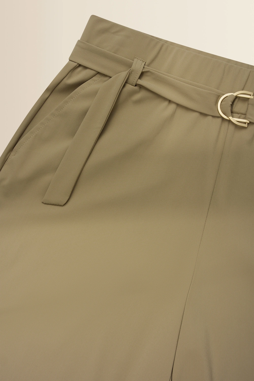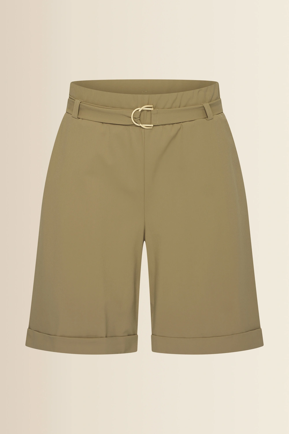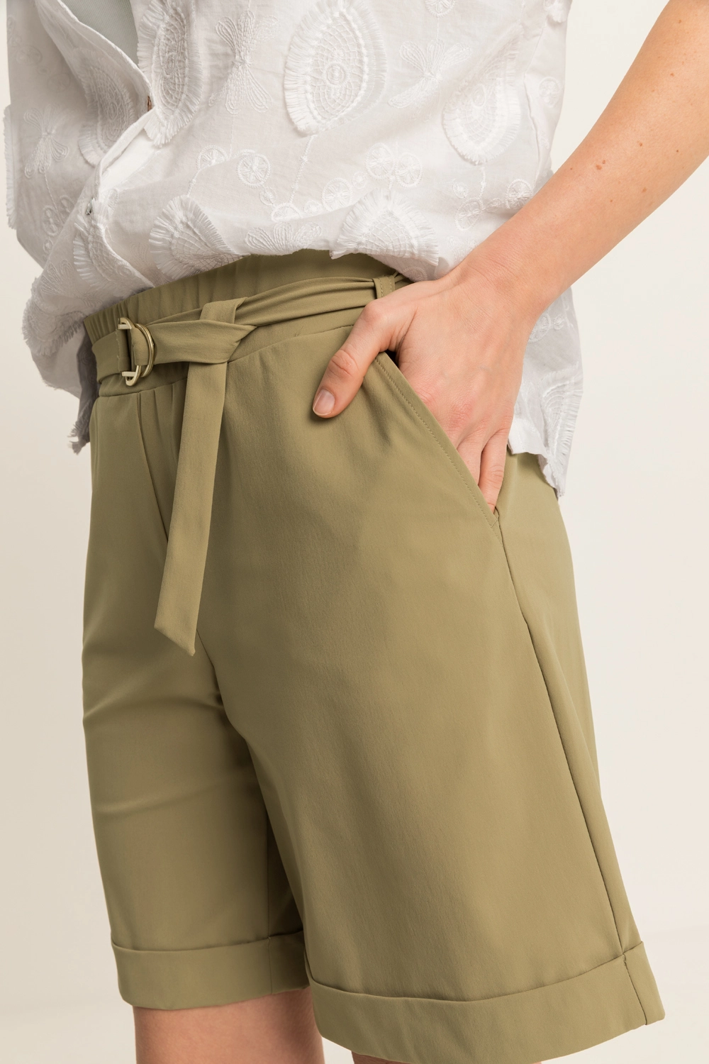 Bermuda met ceintuur – soepelvallende travelkwaliteit met een gladde, verfijnde uitstraling. Hoog in de taille en elegant belijnd, met een strikceintuur, steekzakken en omgeslagen pijpen. De goudkleurige D-ring gesp geeft deze bermuda een stijlvolle touch, terwijl de comfortabele pasvorm zorgt voor een moeiteloos verzorgde look.