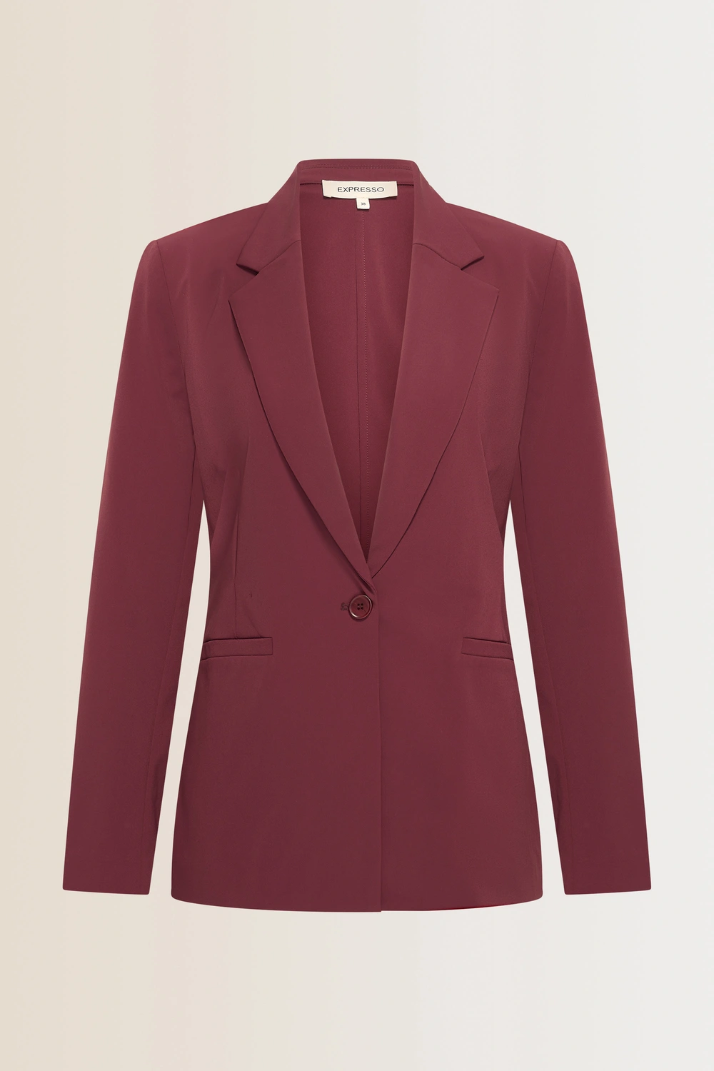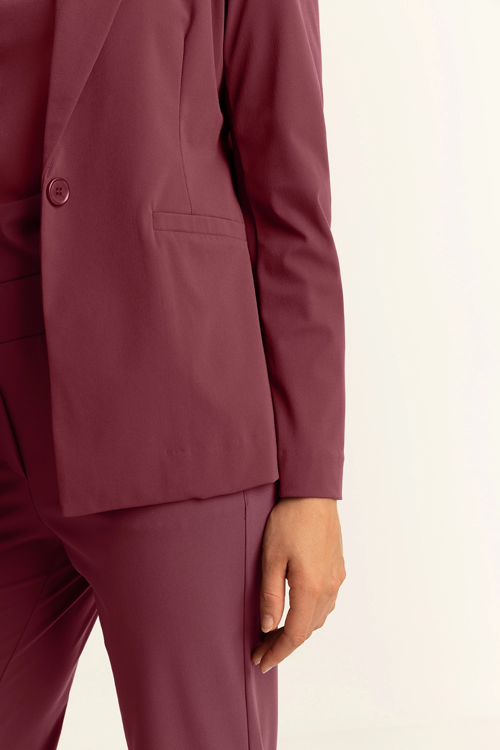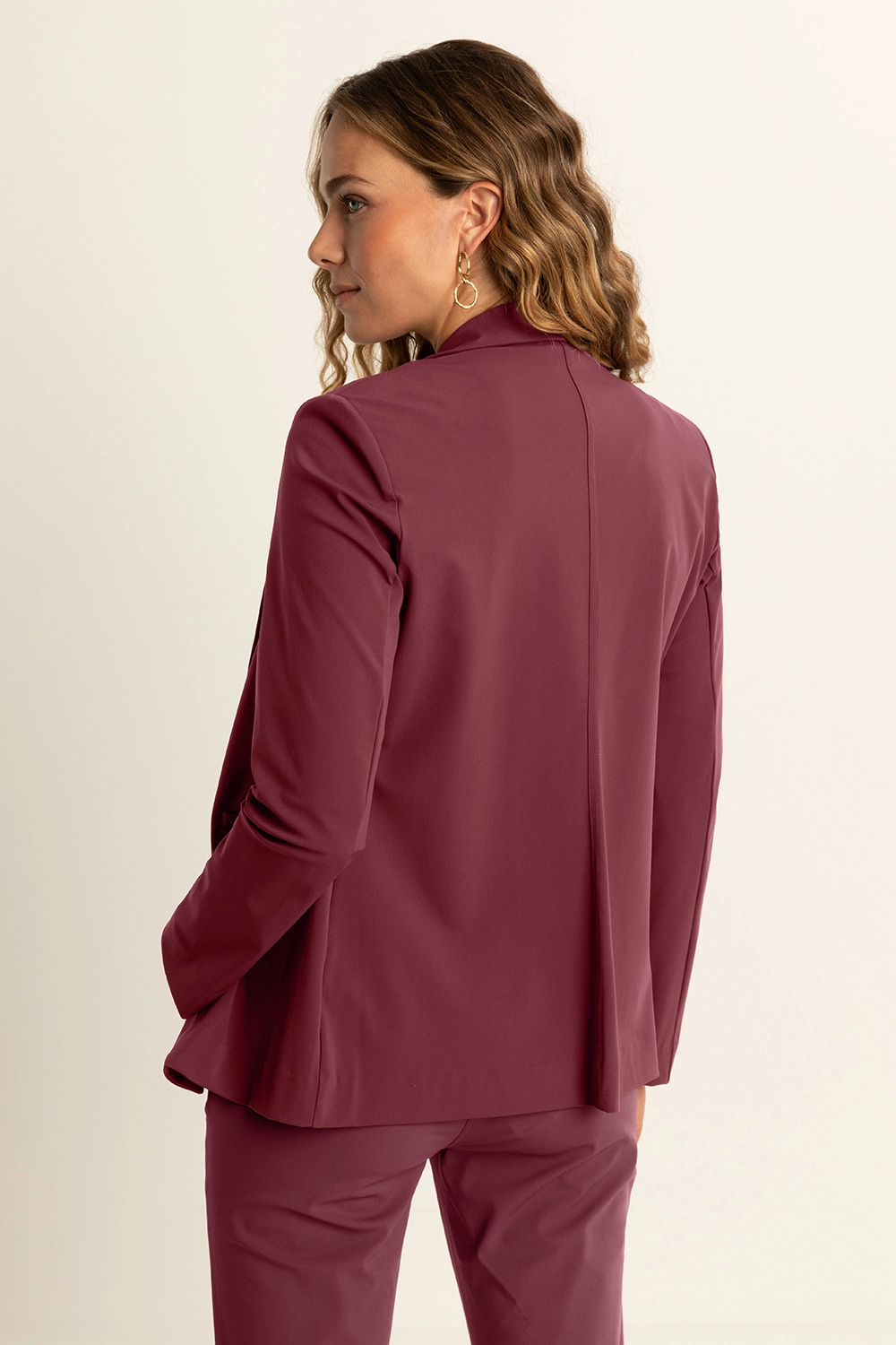 Bordeauxrode blazer – comfortabele travelkwaliteit. De blazer heeft een getailleerd silhouet dat de vrouwelijke vorm mooi accentueert. Uitgevoerd met een enkele knoopsluiting, klassieke revers en klepzakken voor een tijdloze, elegante look.