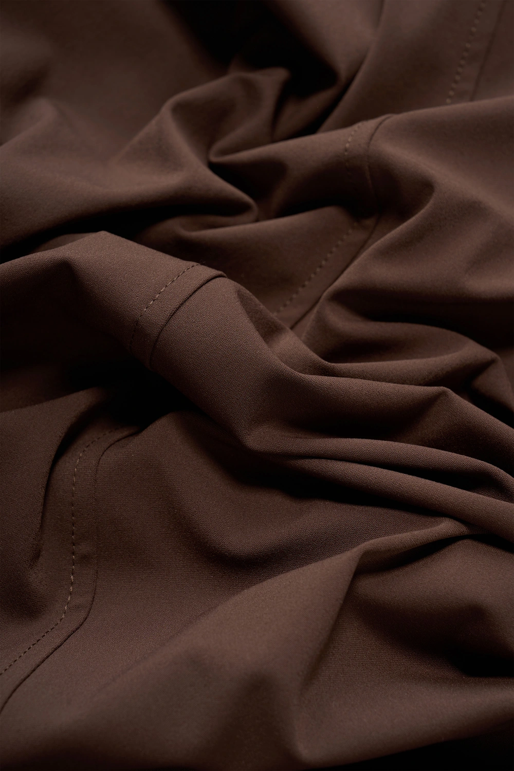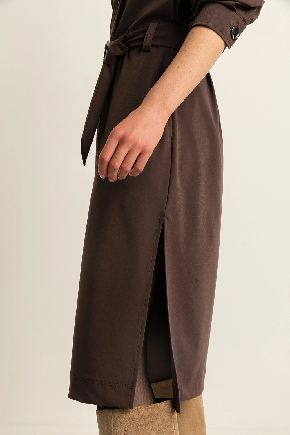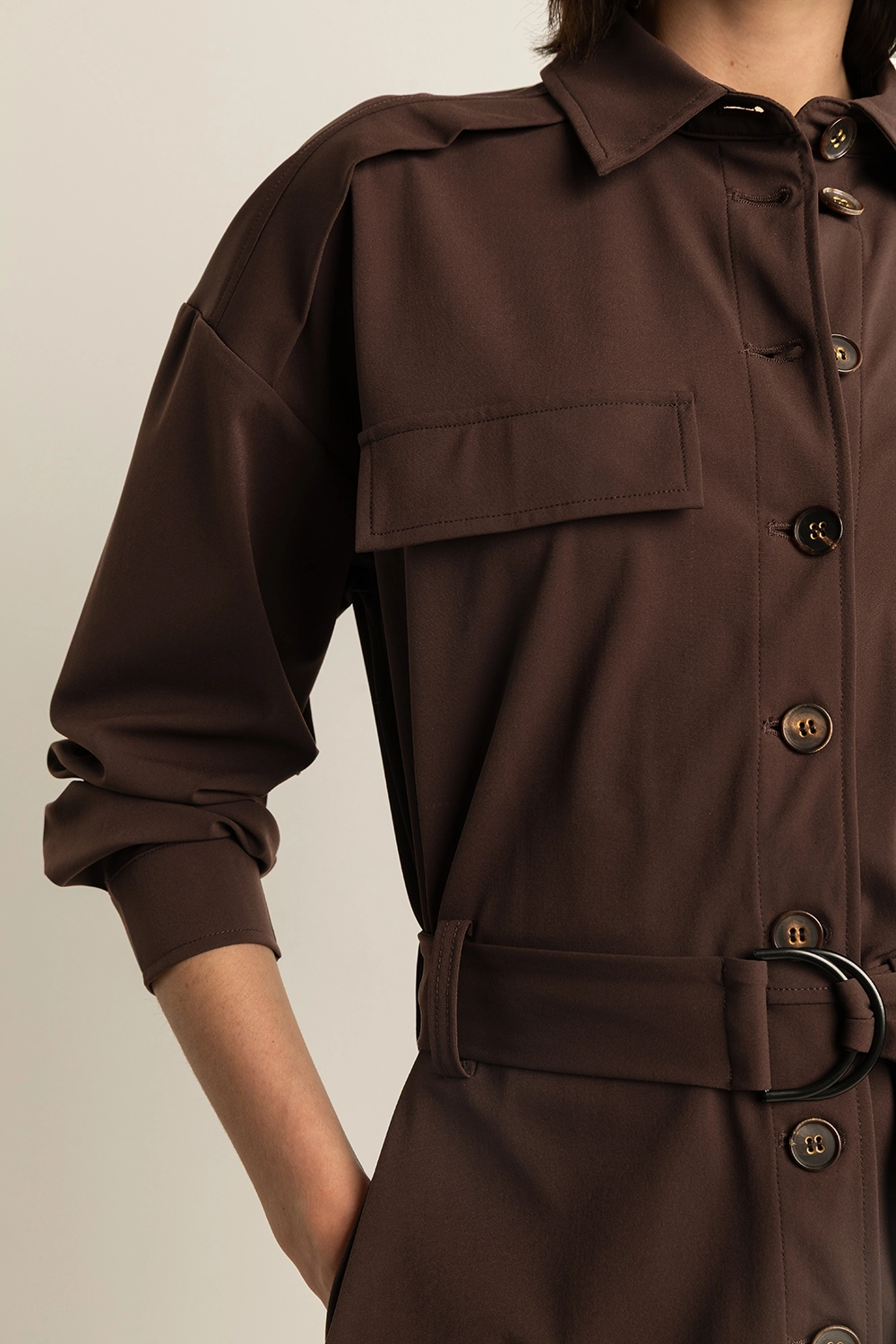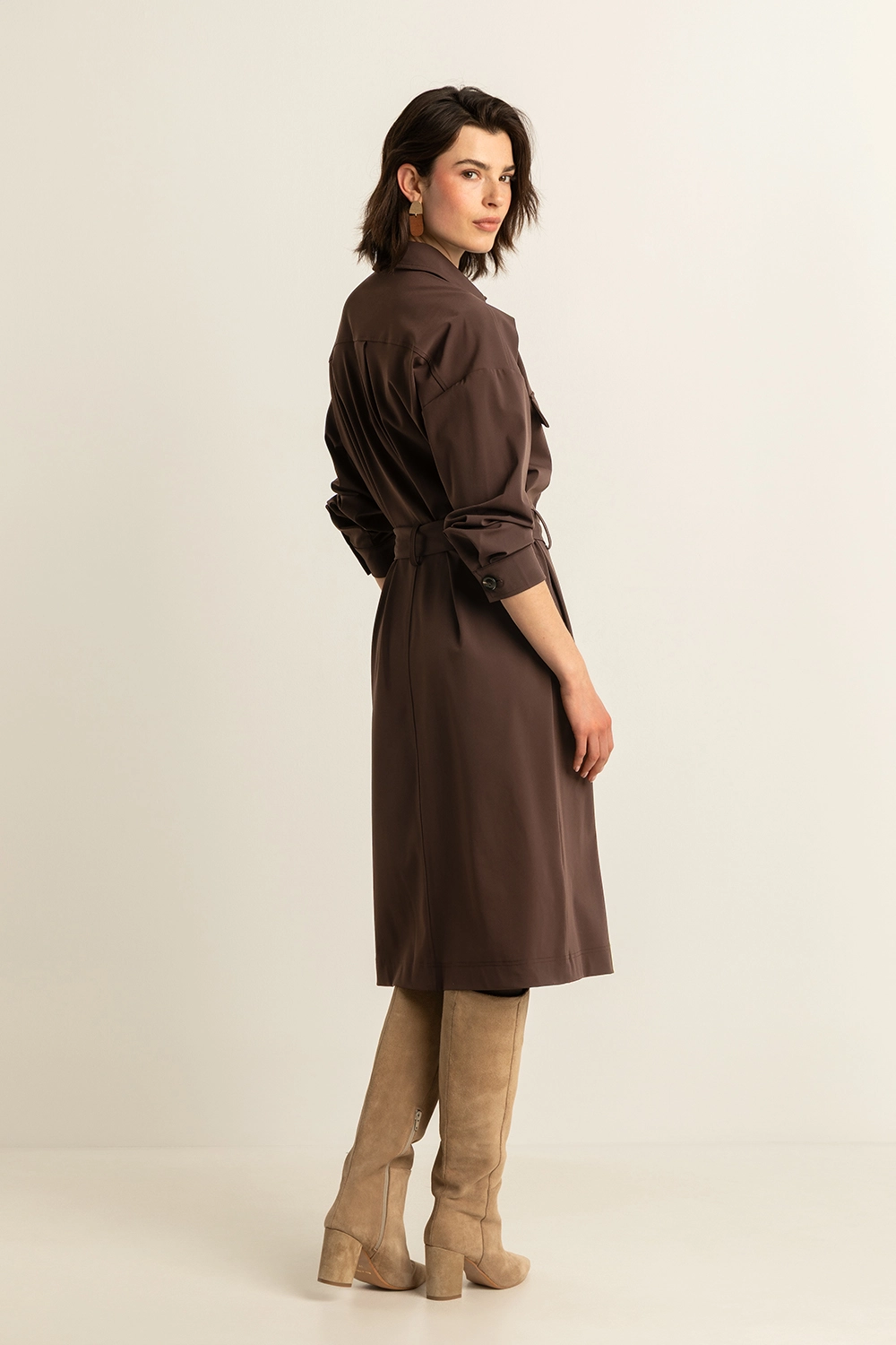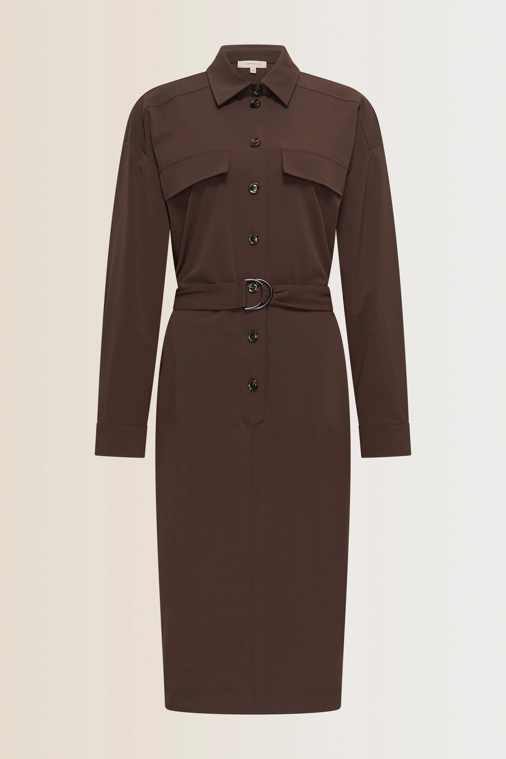 Donkerbruine jurk met knopen tot de taille – comfortabele travelkwaliteit. Deze jurk in utility-stijl heeft een klassieke overhemdkraag, klepzakken op de borst en een afneembare ceintuur die de taille elegant benadrukt. De rechte pasvorm en knoopsluiting maken dit ontwerp zowel stijlvol als praktisch voor dagelijks gebruik.