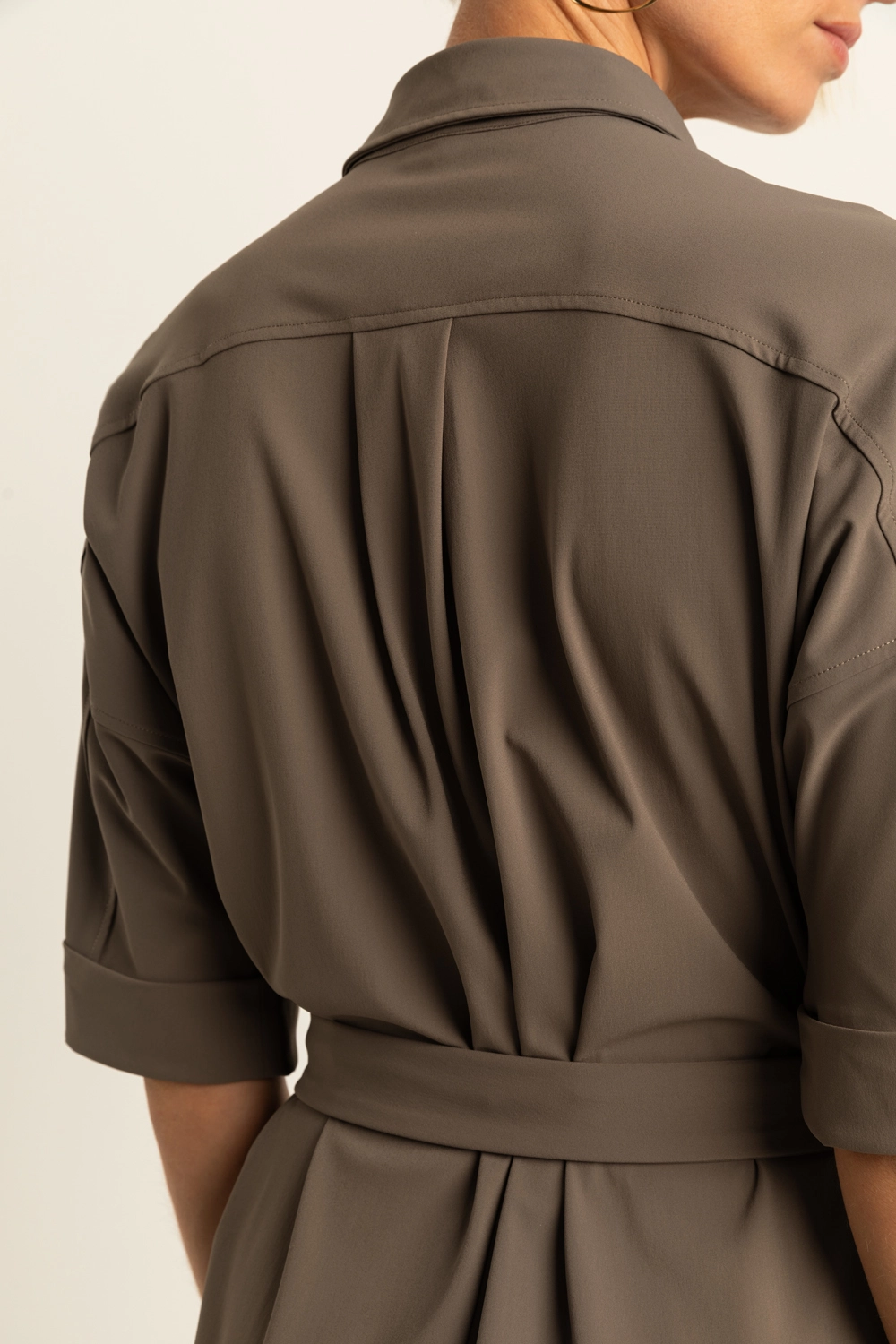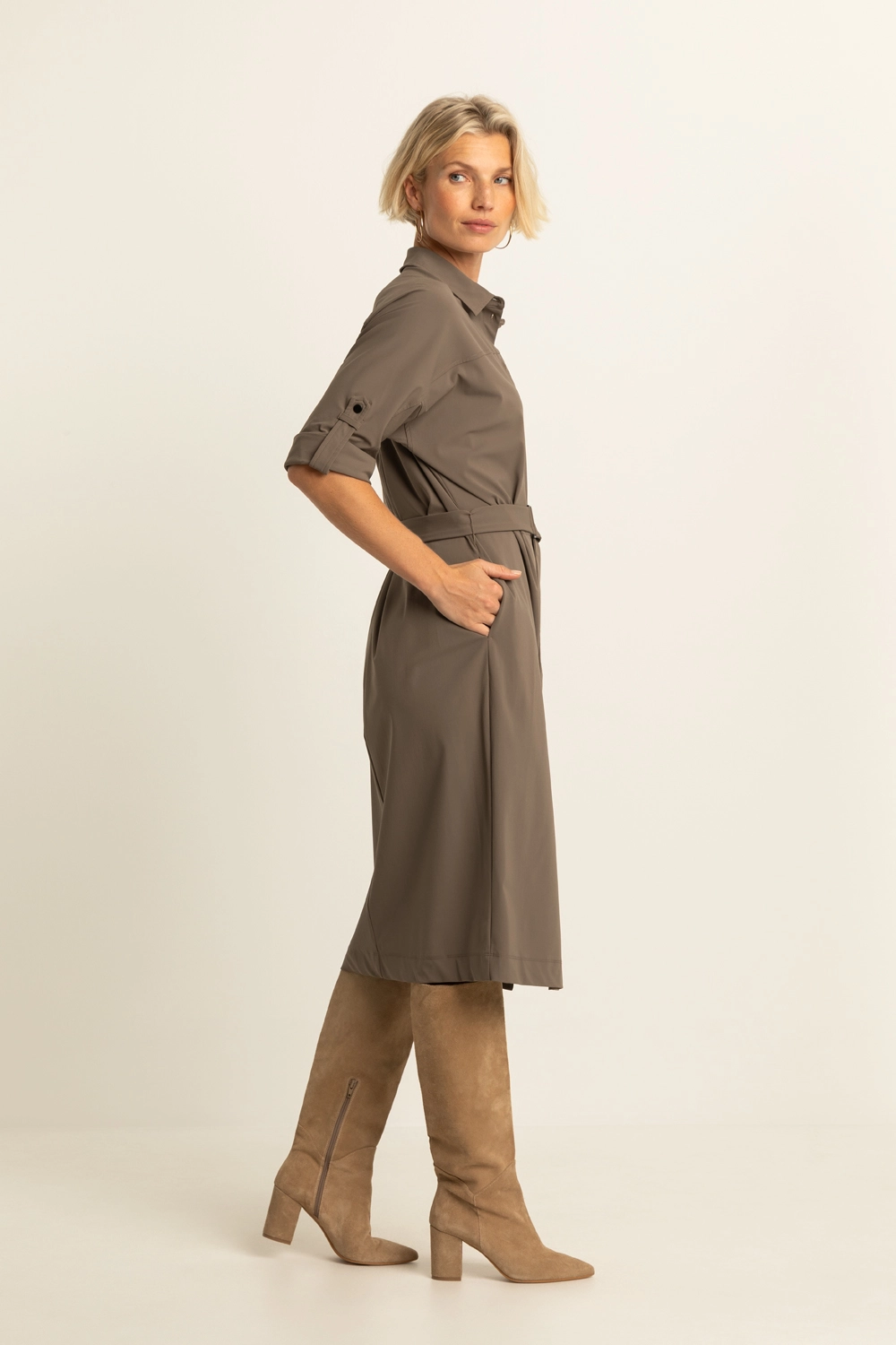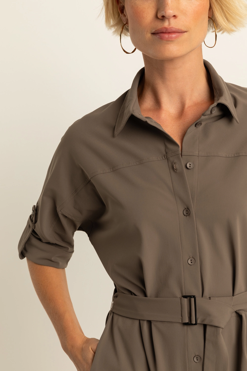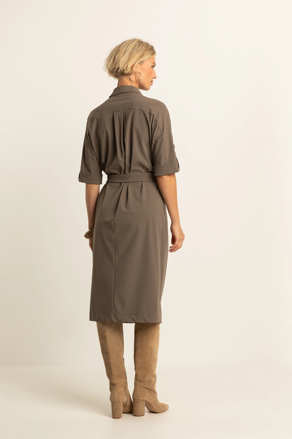 Doorknoopjurk in travelkwalteit – Deze midi-jurk heeft een vrouwelijke blouse-look met doorknoopsluiting en een bijpassende ceintuur die de taille mooi accentueert. De oprolbare mouwen met knoopdetail geven een nonchalante twist, terwijl de rechte rok en subtiele split zorgen voor een verzorgde, zelfverzekerde uitstraling.