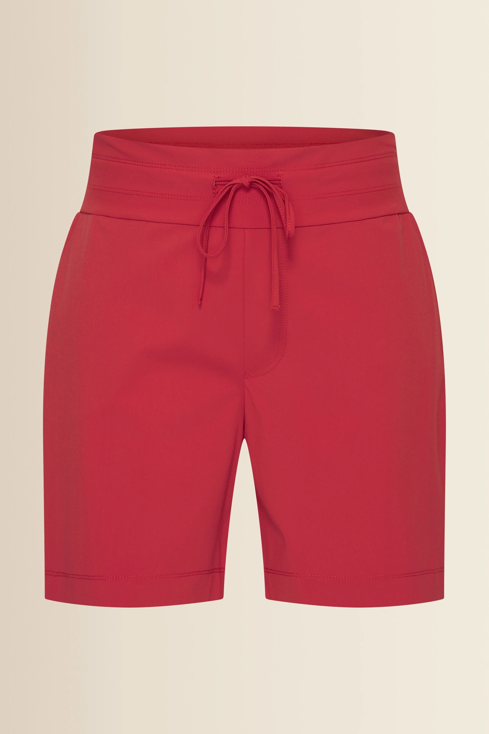 Rode short – comfortabele travelkwaliteit. Relaxed fit, met een hoge tailleband en trekkoordsluiting. Dankzij de soepelvallende stof en de praktische lengte is dit de perfecte short voor casual dagen. Combineer met een T-shirt en sneakers voor een sportieve look, of draag met een blouse en sandalen voor een relaxte zomeroutfit.