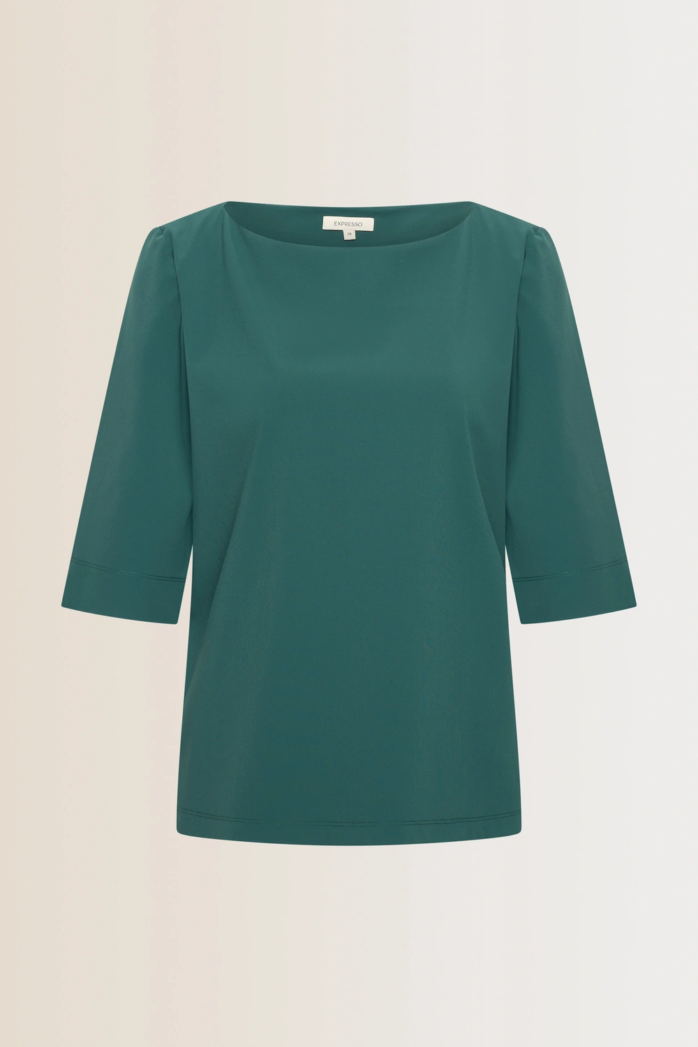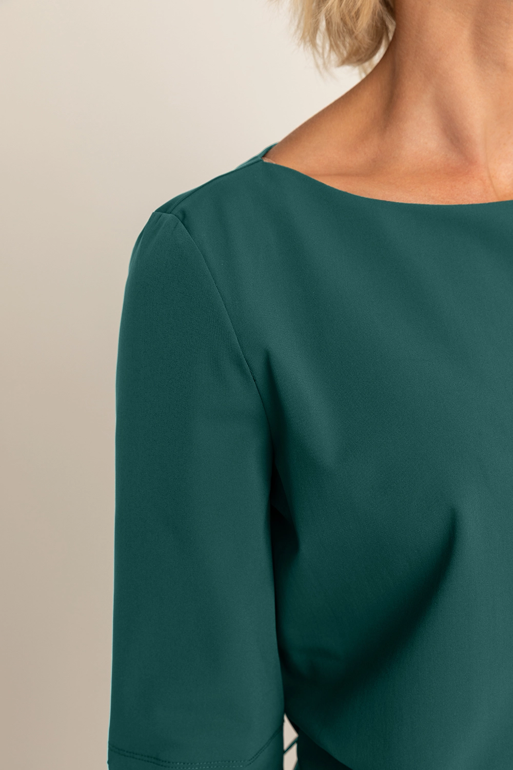 Groene top – travelkwaliteit. De top heeft een elegante boothals en halflange mouwen met splitjes. De zachte stretchstof voelt comfortabel aan en zorgt voor een verzorgde look, zowel casual als gekleed. Onmisbaar als veelzijdige basis in je garderobe.