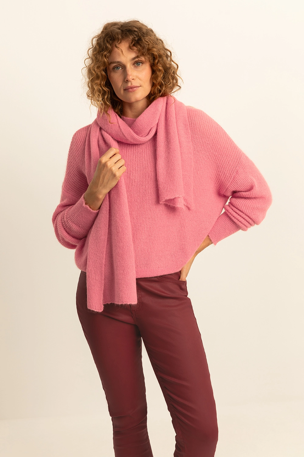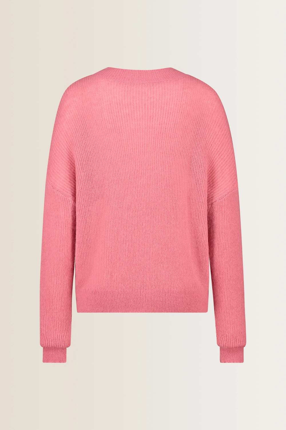 Roze trui – alpaca wolmix. Relaxed & licht bloezend, ronde hals, lange vleermuismouwen. Zacht, fluffy ribbreisel met huidvriendelijke alpacawol. Lichtgewicht, warm en stijlvol – past bij elke stijl, van casual tot office. Goed om te weten: er is ook een bijpassende shawl.
