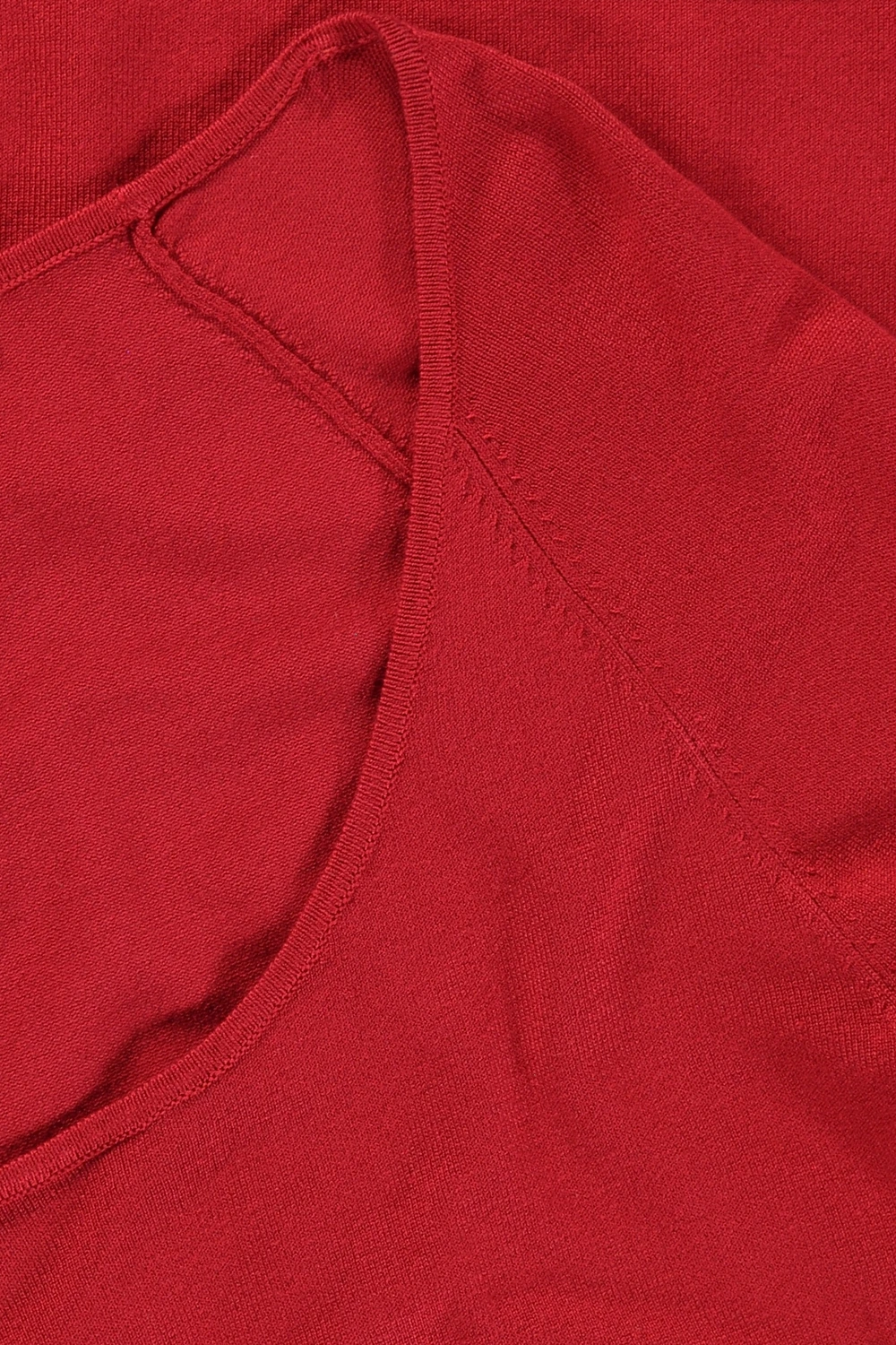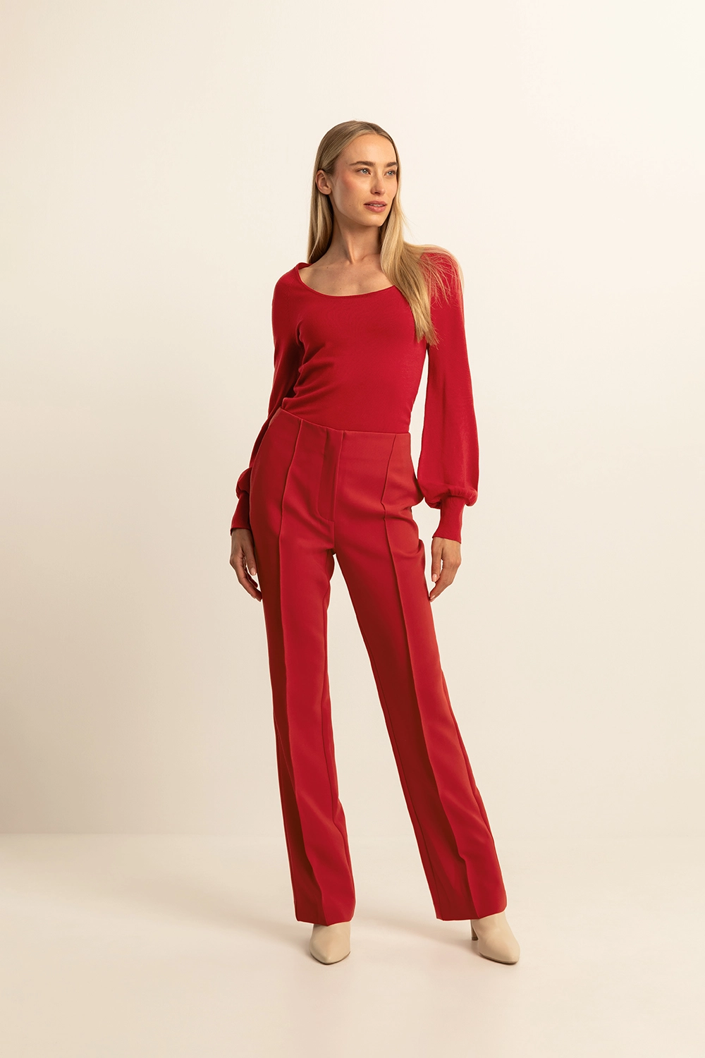Helderrode fijngebreide trui – blend met viscose EcoVero. Semi-fitted, wijde ronde hals, lange ballonmouwen. Fijngebreid, comfortabel stretchy, sluit mooi aan. Vrouwelijke basic in dé statementkleur van het thema ‘Ruby Romance’.