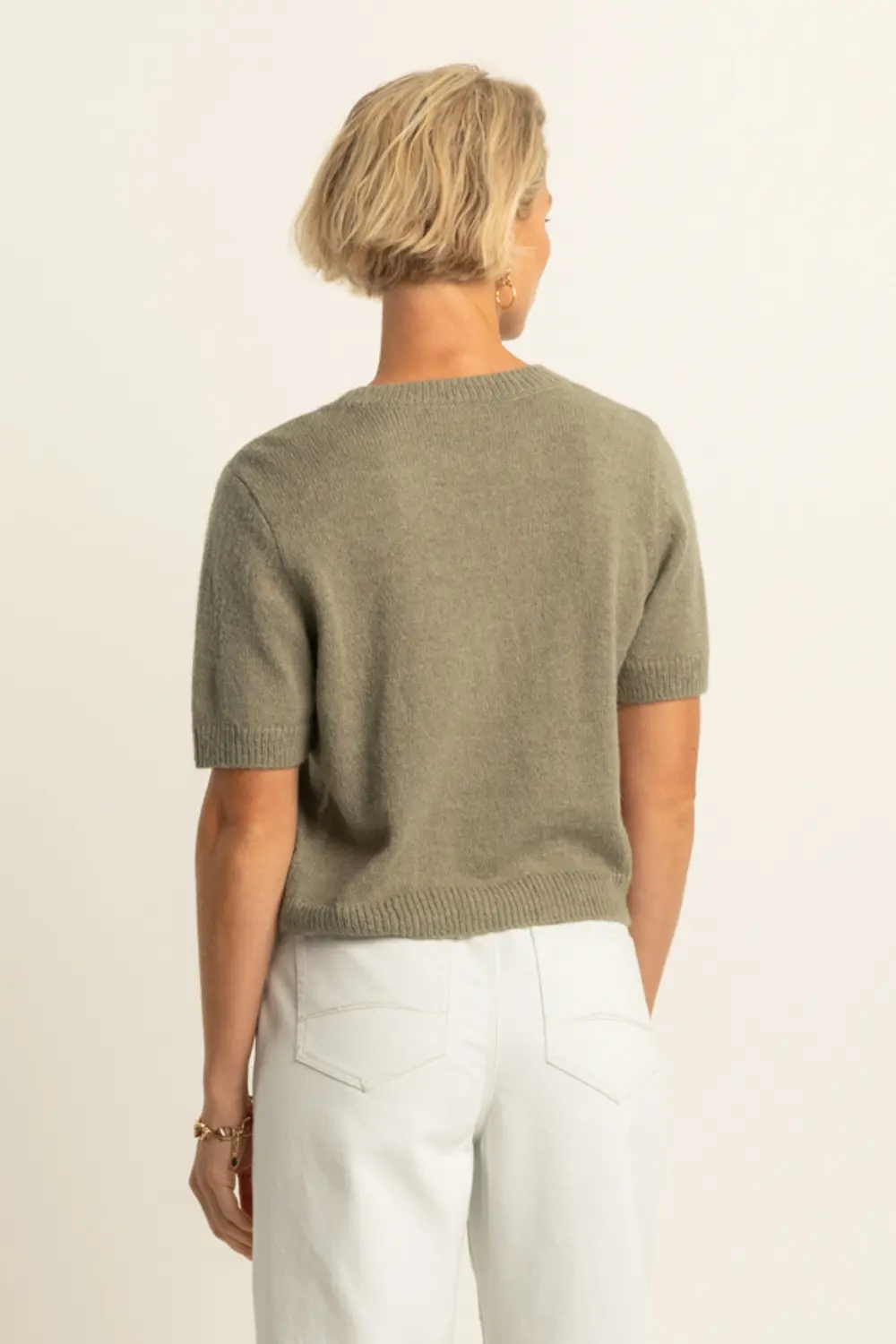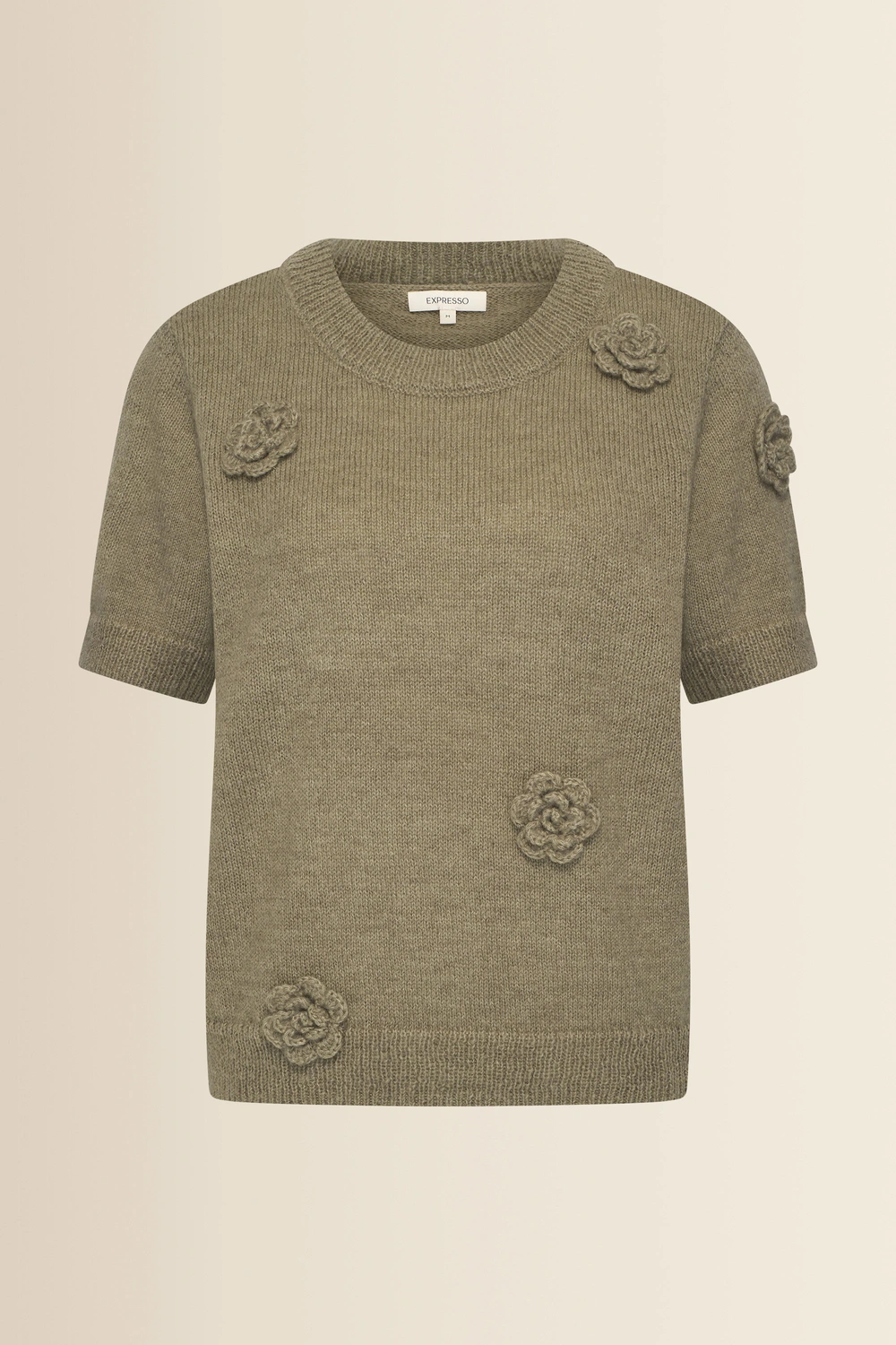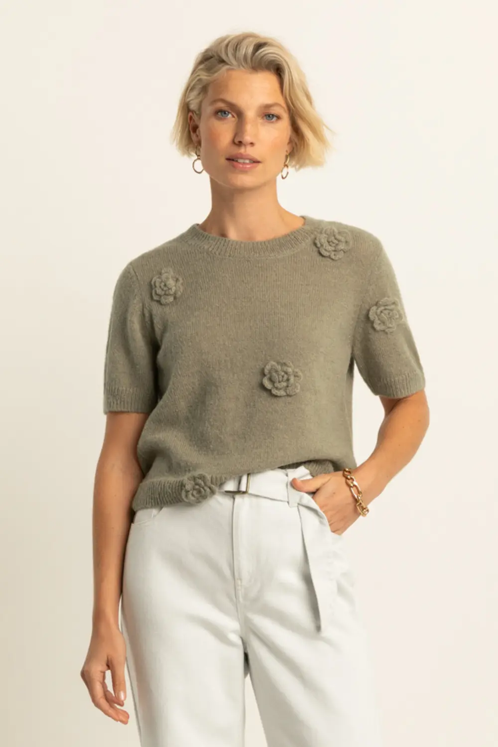 Olijfgroene fijngebreide top – zachte knit met korte mouwen en verfijnde bloemapplicaties voor een vrouwelijke, expressieve uitstraling. Recht en comfortabel, met een ronde hals. De subtiele 3D-bloemen geven deze top een luxe touch en maken dit ontwerp anders dan een basis knit. Perfect om je outfit karakter te geven, zonder in te leveren op draagcomfort.