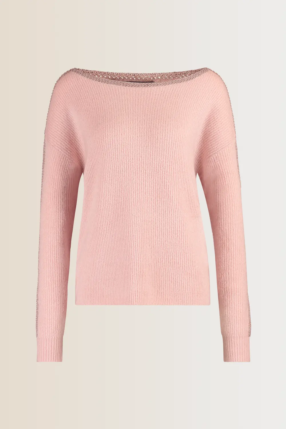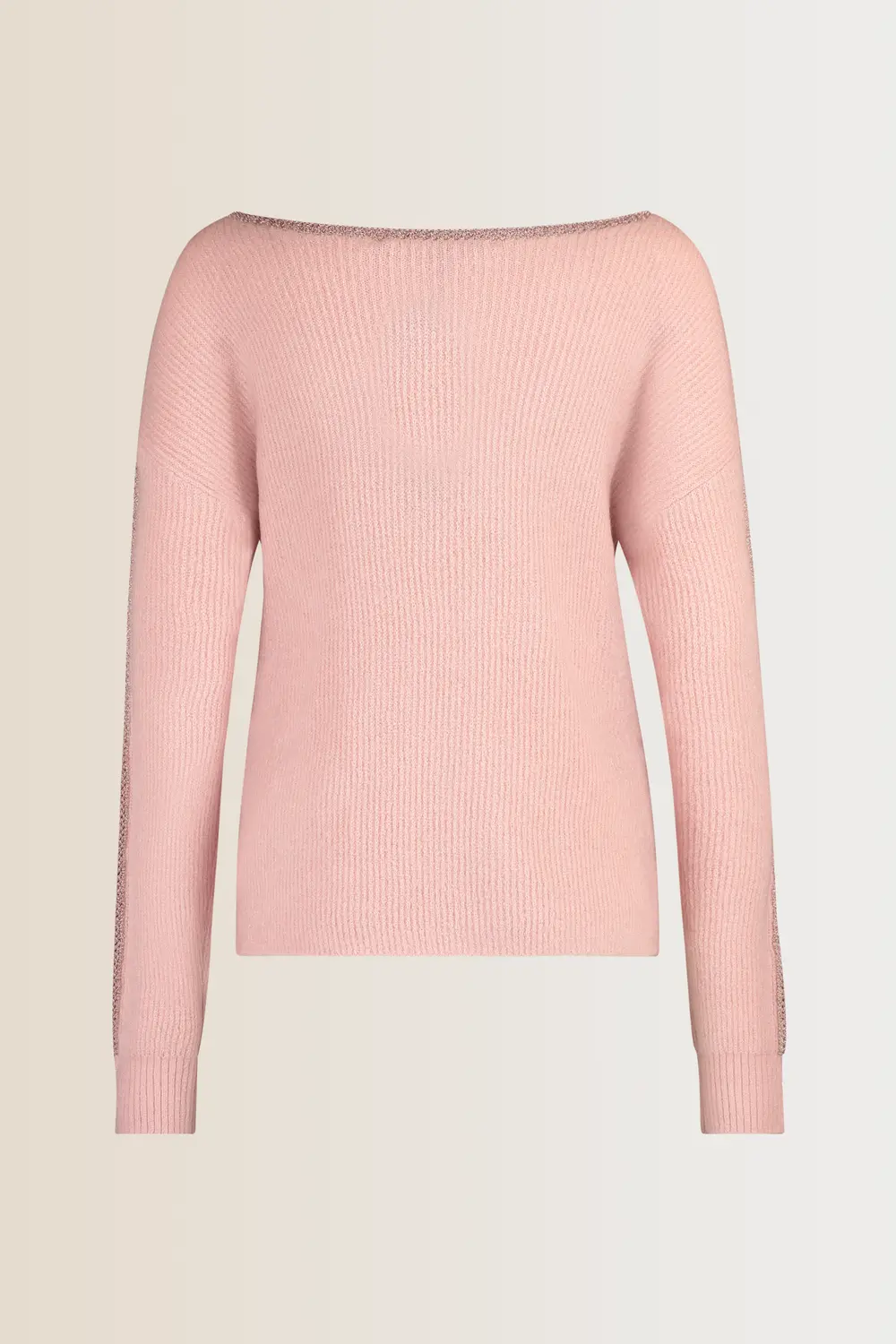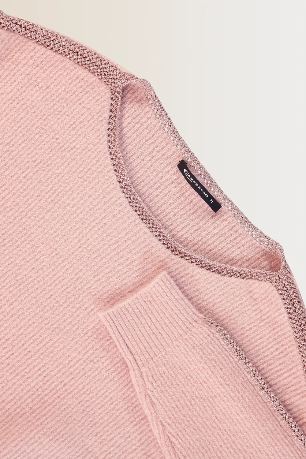 Roze trui – wolmix met subtiele glans. Recht en losjes vallend, boothals, lange mouwen. Zacht gebreide stof met decoratieve biezen langs de mouwen. De perfecte combinatie van comfort en stijl, ideaal voor zowel casual als meer geklede looks.