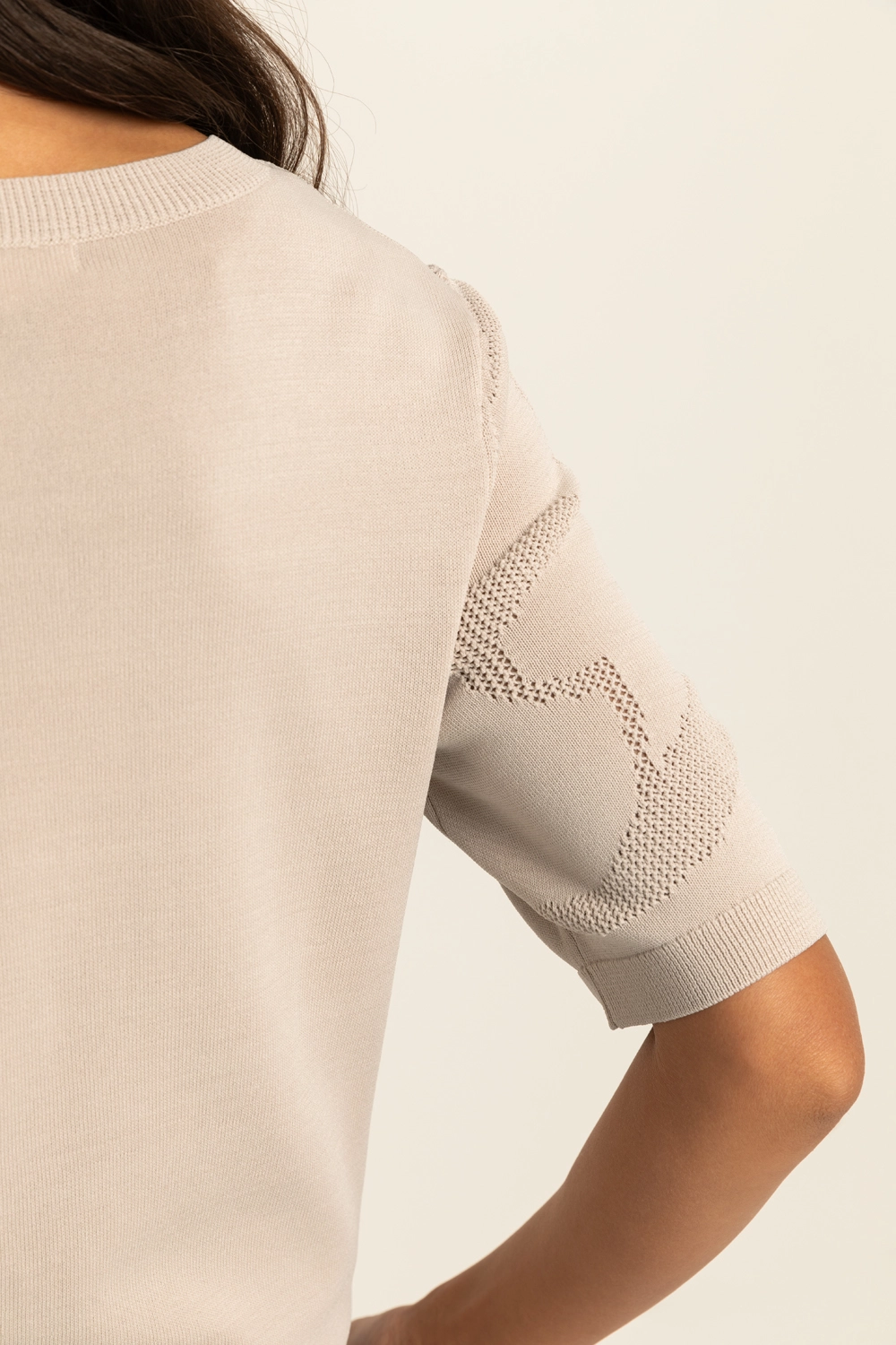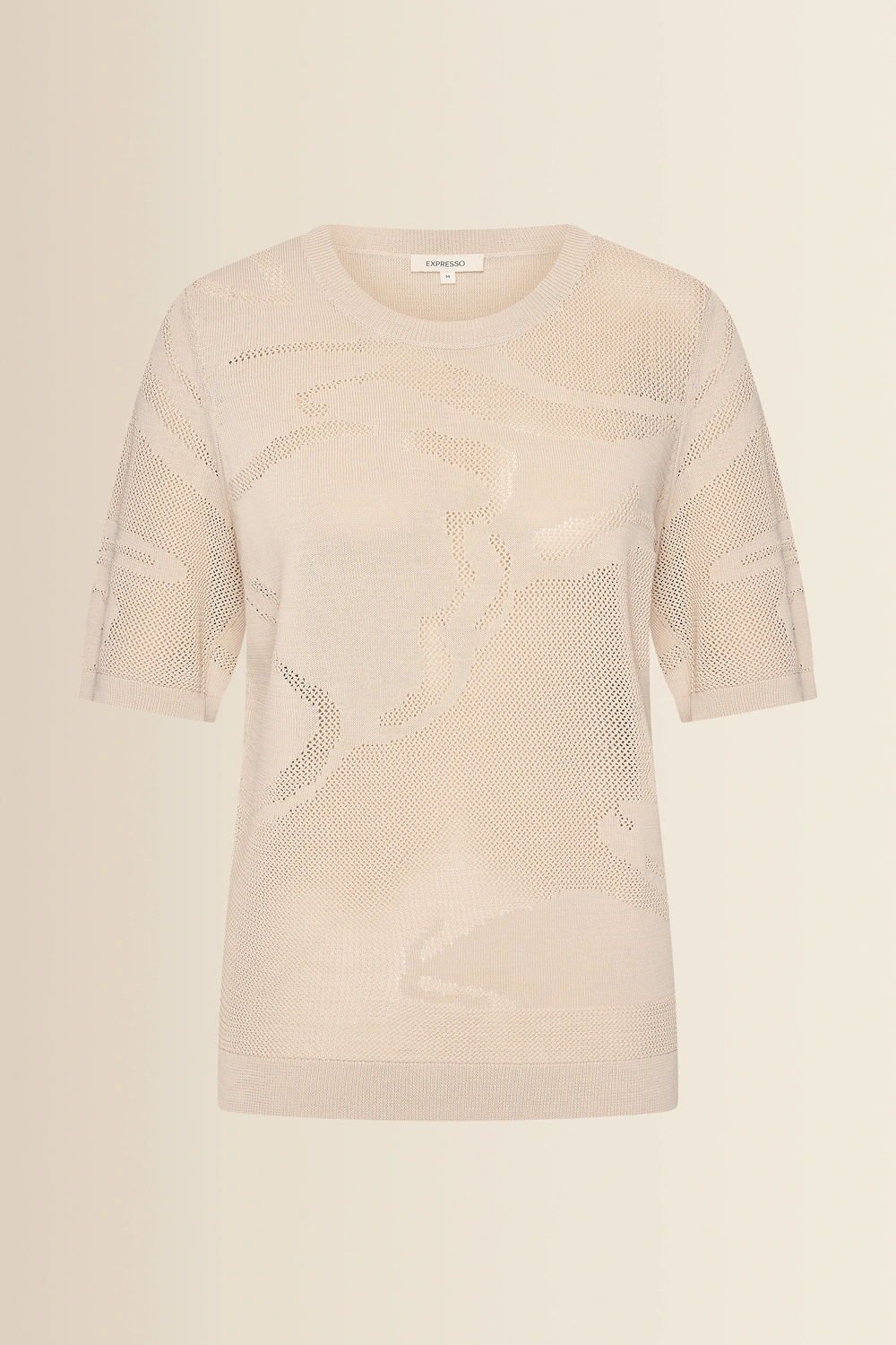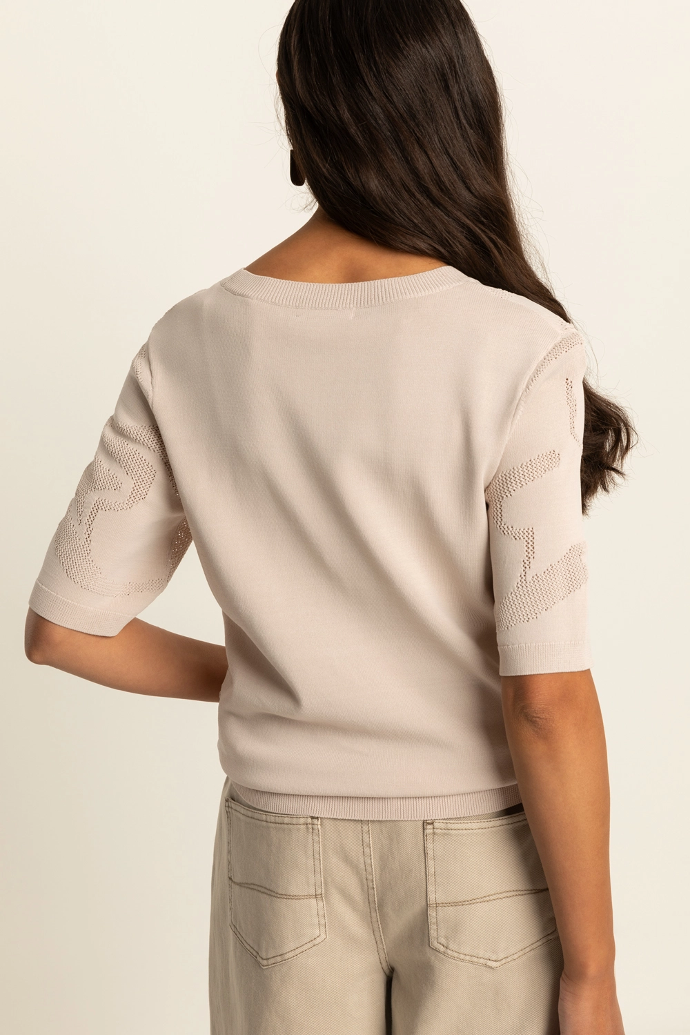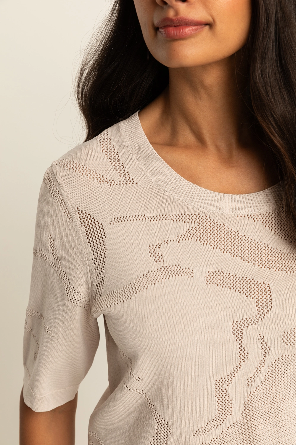 Fijngebreide trui – verfijnde knit met een subtiel ingeweven dessin dat zorgt voor diepte en een luxe uitstraling. De semi-transparante structuur geeft dit item een moderne, vrouwelijke twist, terwijl de comfortabele fit en korte mouwen zorgen voor een ontspannen draaggevoel. Licht, luchtig en perfect om eindeloos te combineren. Een echte eyecatcher die moeiteloos past bij zowel casual als meer geklede looks.