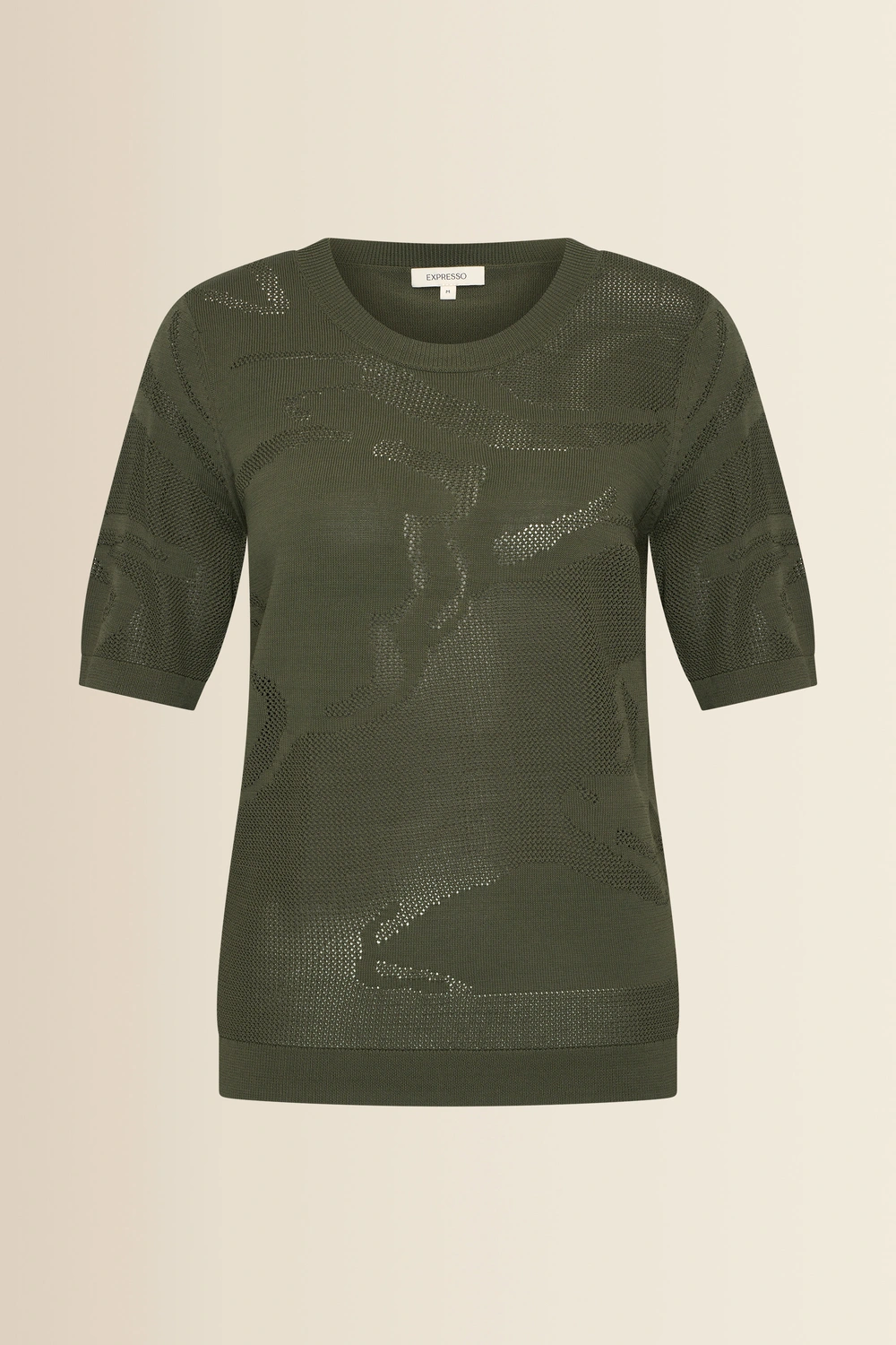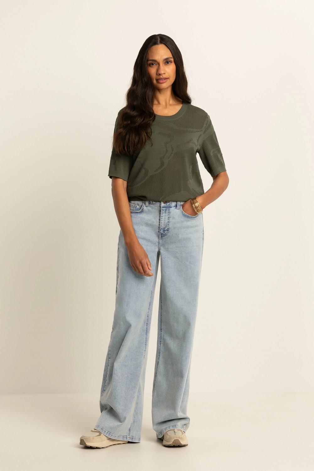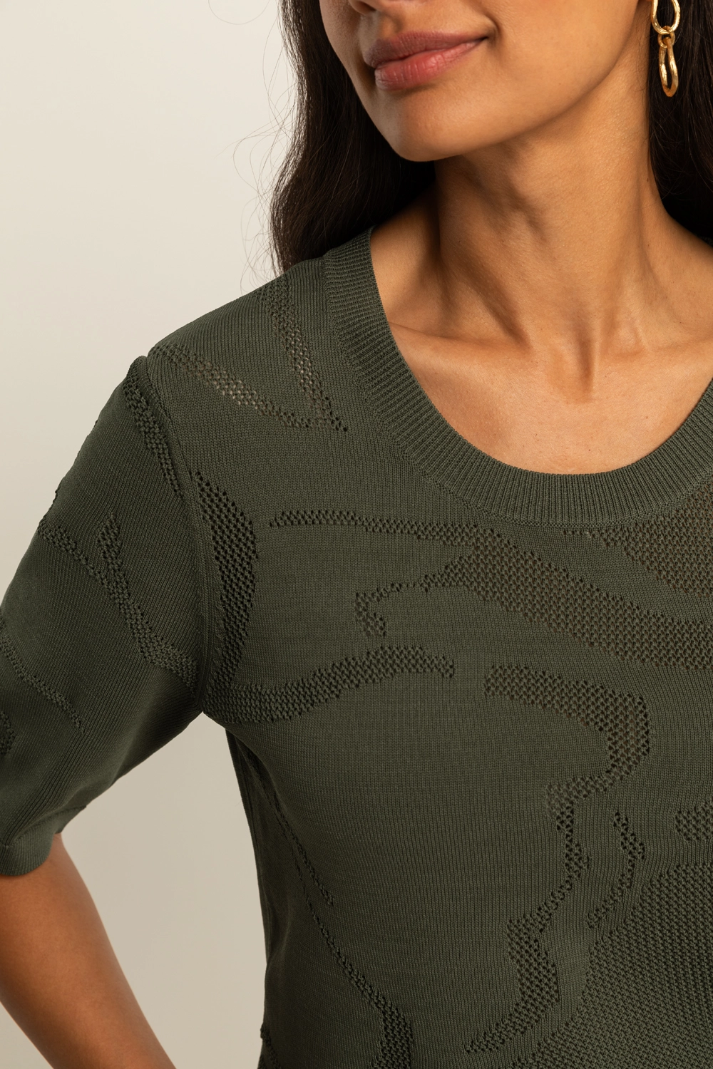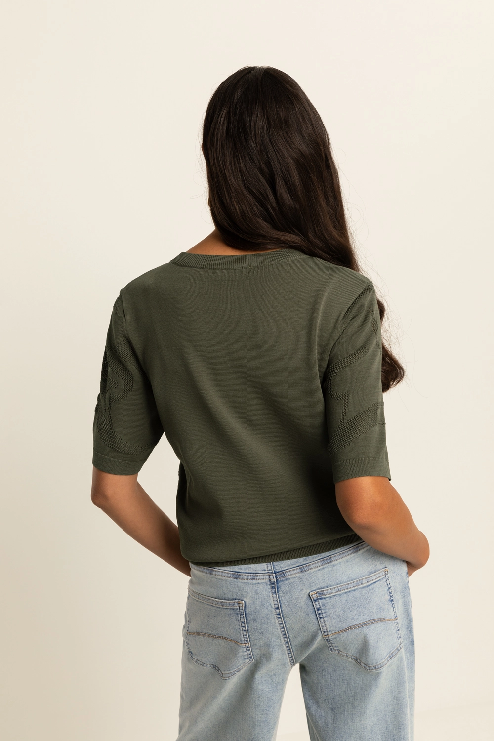 Fijngebreide trui – verfijnde knit met een subtiel ingeweven dessin dat zorgt voor diepte en een luxe uitstraling. De semi-transparante structuur geeft dit item een moderne, vrouwelijke twist, terwijl de comfortabele fit en korte mouwen zorgen voor een ontspannen draaggevoel. Licht, luchtig en perfect om eindeloos te combineren. Een echte eyecatcher die moeiteloos past bij zowel casual als meer geklede looks.