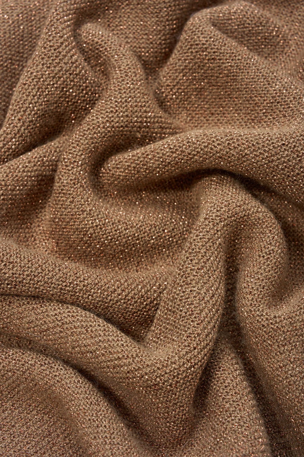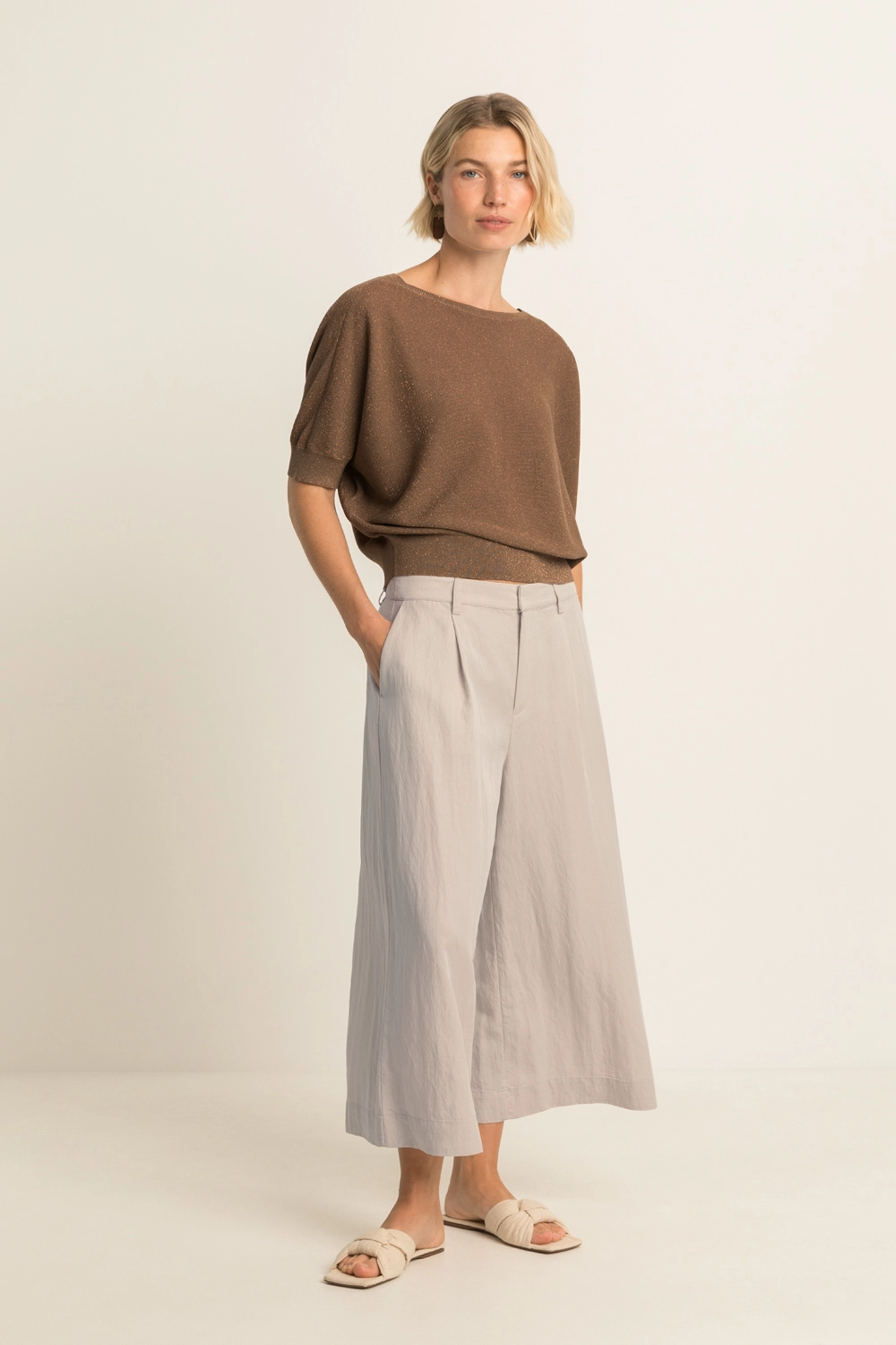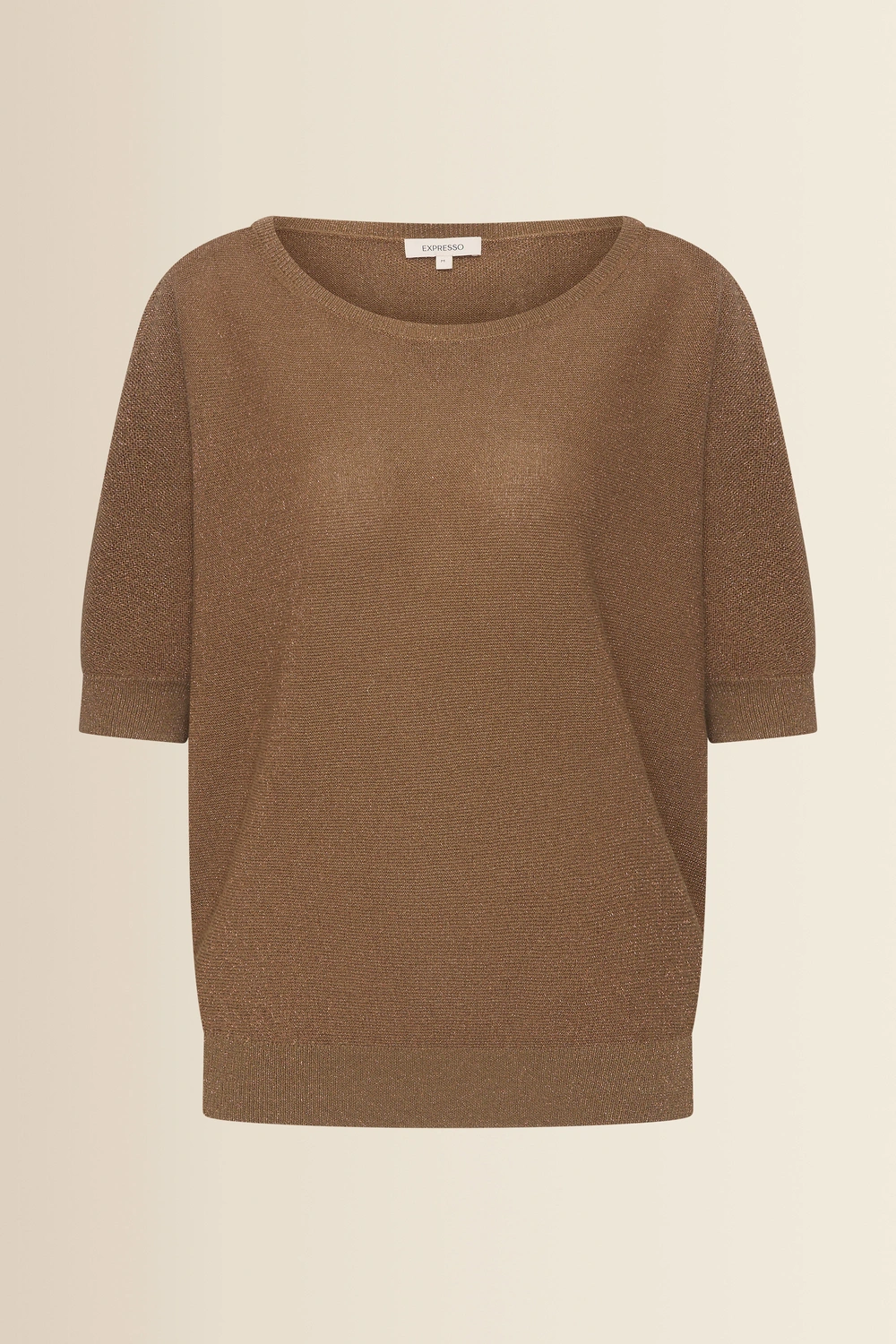 Bruine trui met lurex – fijngebreide kwaliteit met een subtiele sparkle en zachte touch. Relaxed en licht bloezend, met een wijde ronde hals, korte mouwen en een brede aangesloten zoomboord. De glanzende lurexdraad geeft deze trui een elegante, vrouwelijke uitstraling, terwijl het luchtige breisel comfortabel draagt en mooi in model valt. Een stijlvol item dat moeiteloos warmte en verfijning samenbrengt.