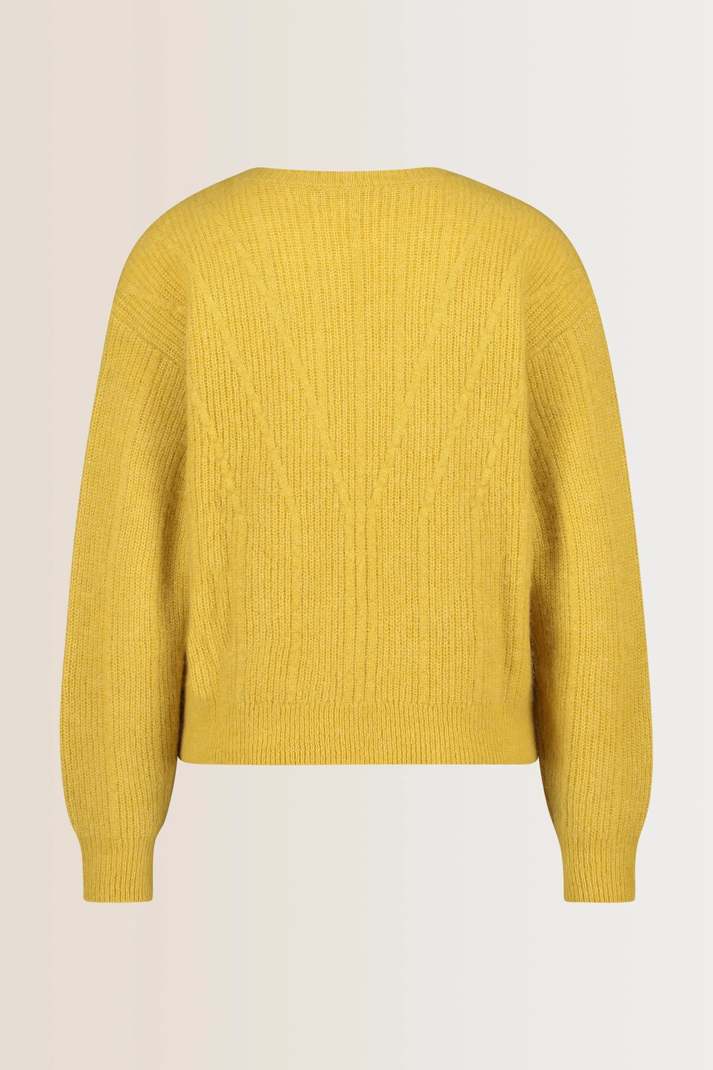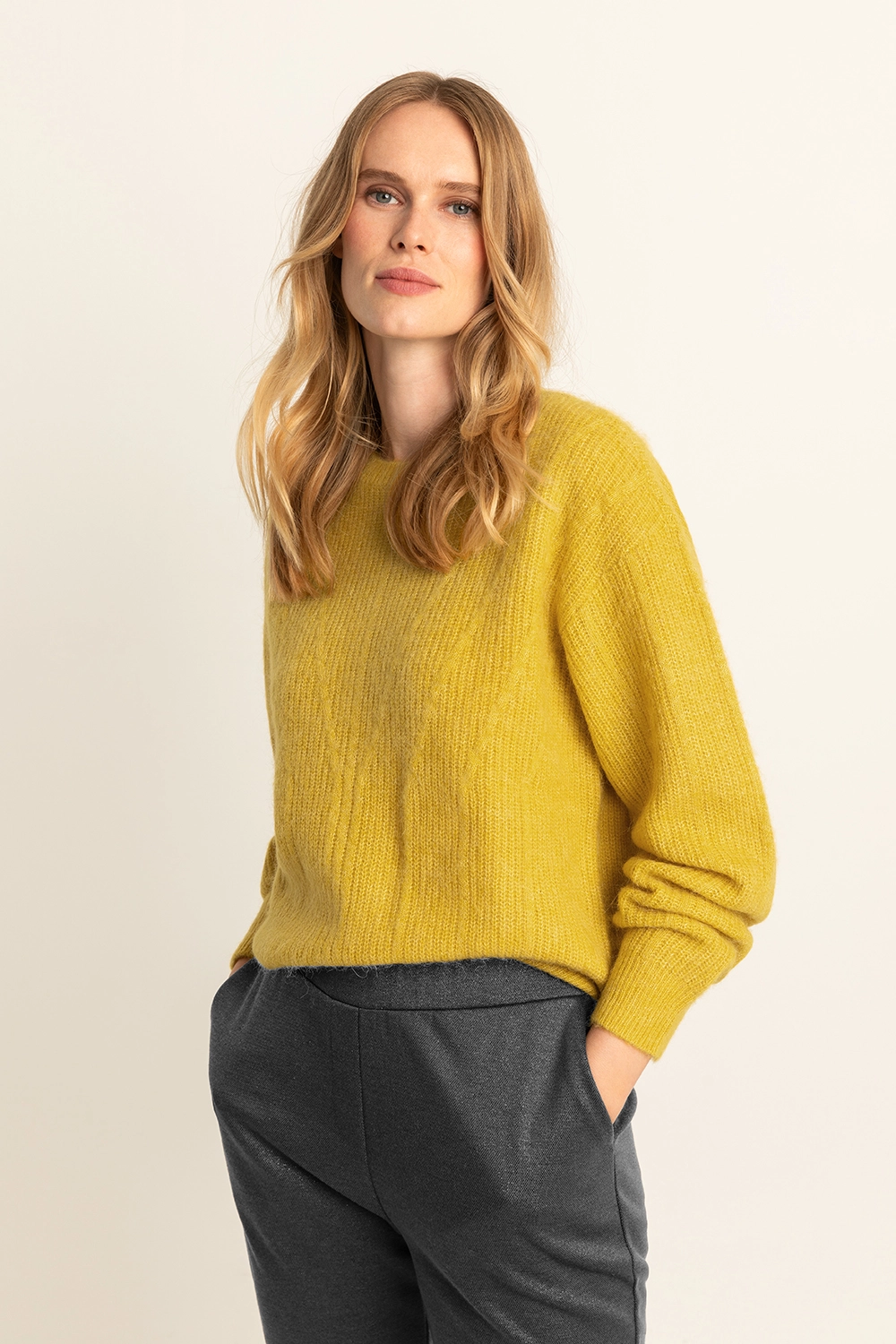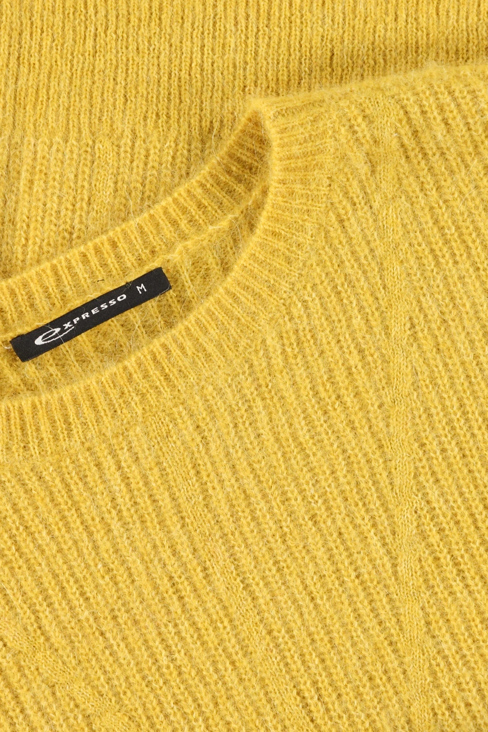 Okergele trui – wolmix met alpacawol. Recht & boxy, ronde hals, lange mouwen. Mediumgrof ribgebreid, zacht garen met huidvriendelijke alpacawol. Tijd voor warme knitwear: in deze stijlvolle trui met lijnenstructuur voel je je de hele dag comfortabel.