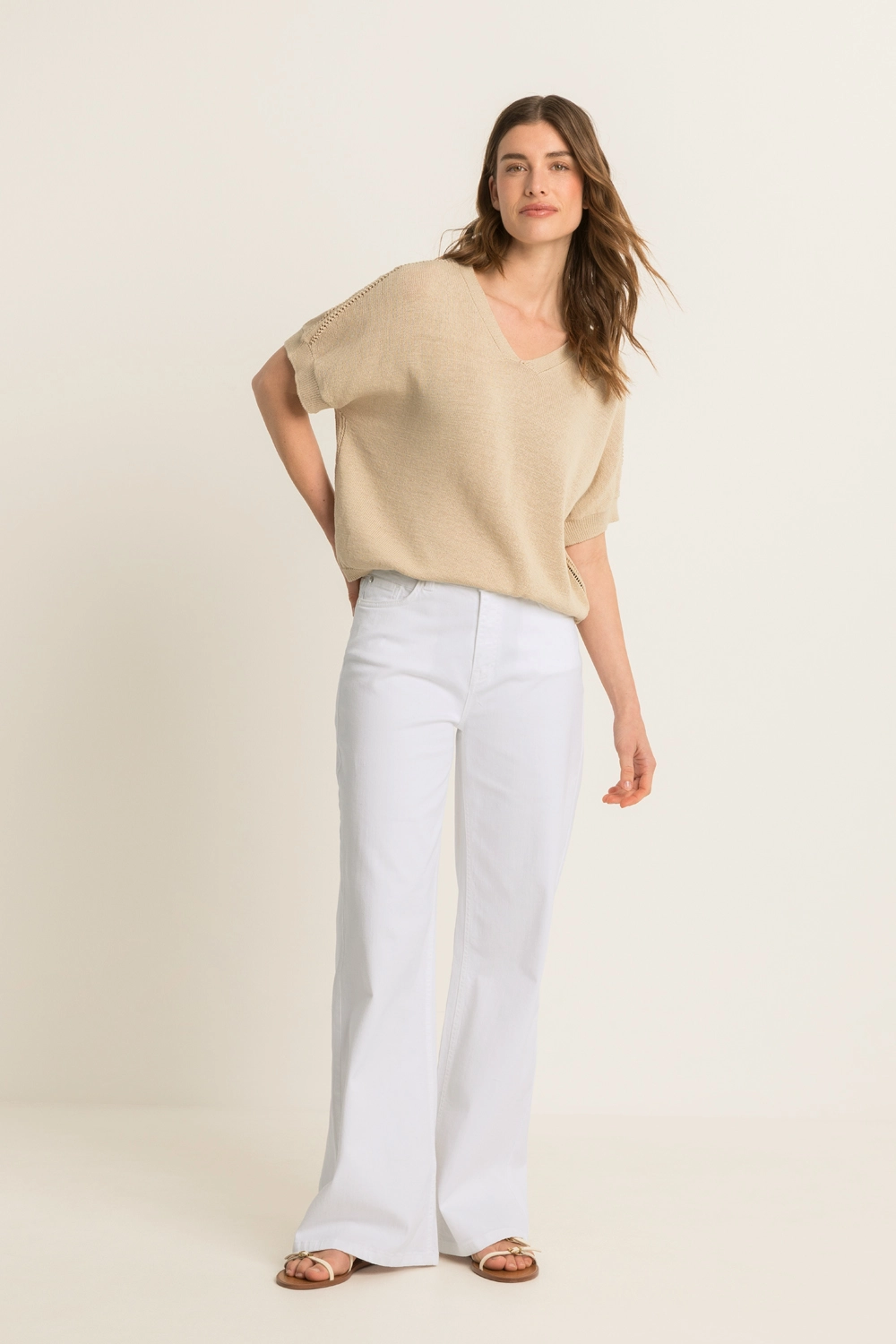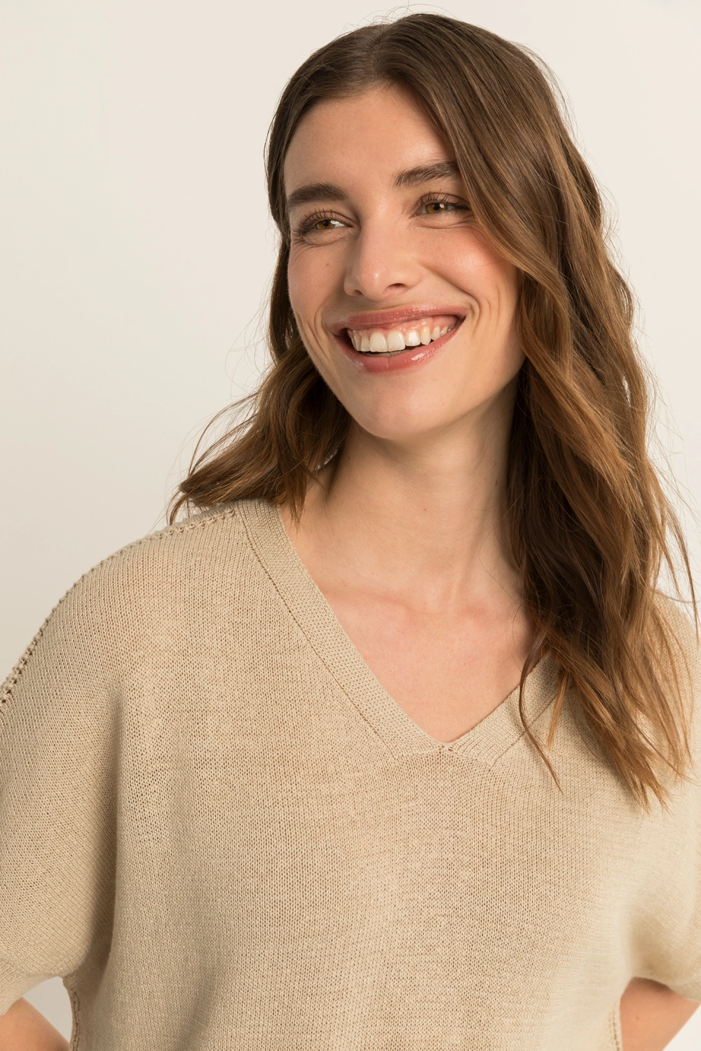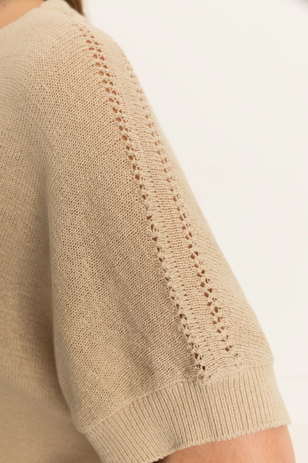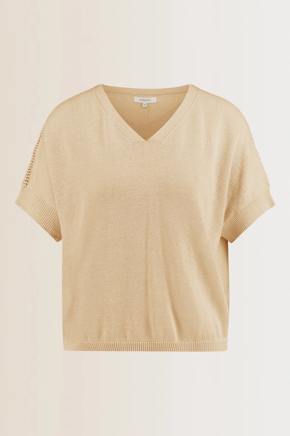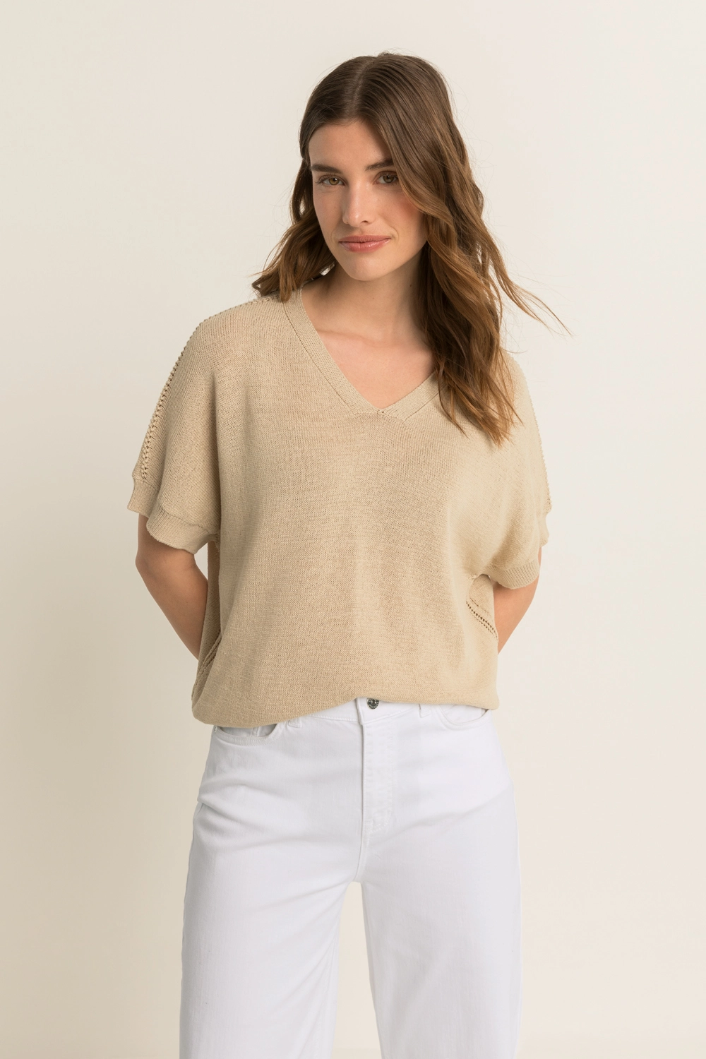 Fijngebreide trui – zachte, luchtige kwaliteit met een comfortabele valling. Relaxed en licht bloezend, met een V-hals, korte mouwen en subtiele ajourdetails langs de schouders en zijnaden. De soepele brei en zachte kleur geven deze trui een frisse, vrouwelijke uitstraling. Een stijlvolle knit die moeiteloos combineert en prettig draagt op warmere dagen.