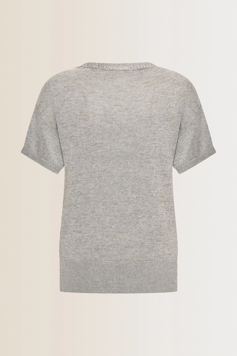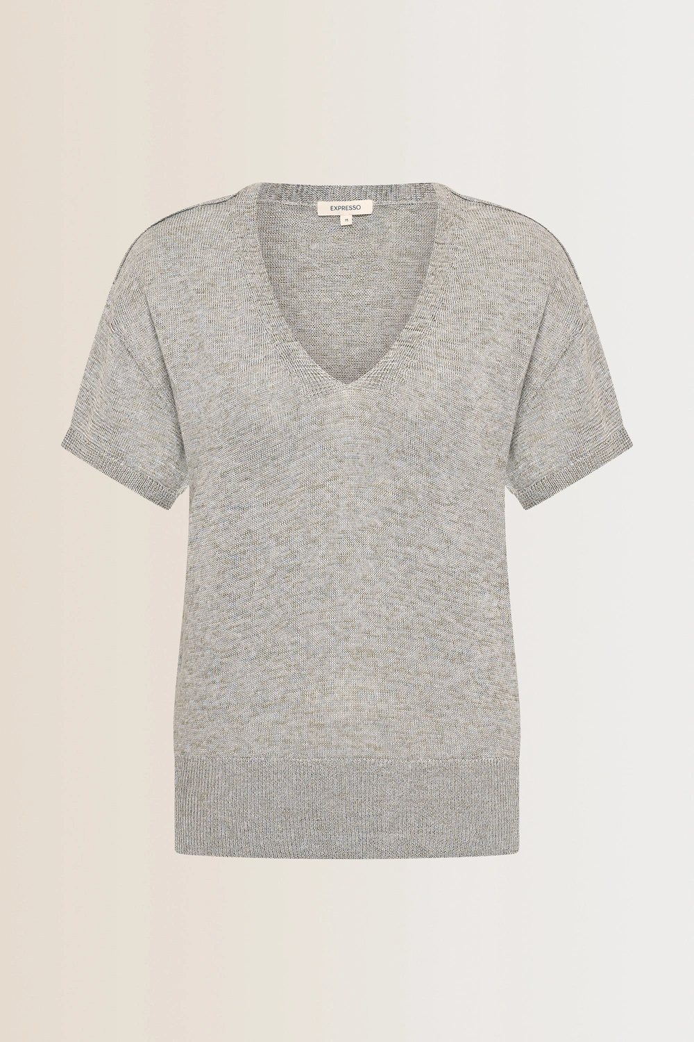 Trui in een licht glanzende kwaliteit – zachte viscoseblend met subtiele melange. Recht model met korte mouwen, diepe V-hals en een brede ribboord onderaan. Deze luchtige trui is ideaal voor de overgang van zomer naar herfst en geeft je outfit een elegante, ontspannen uitstraling. Mooi op een denim of met een rok.