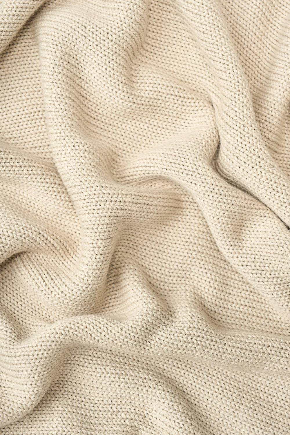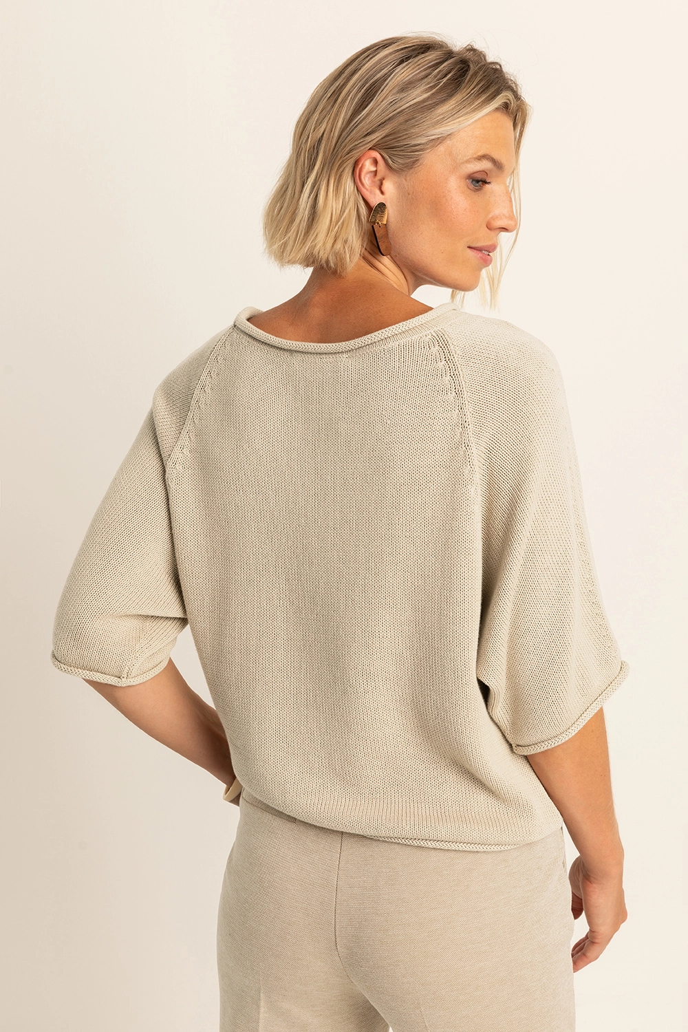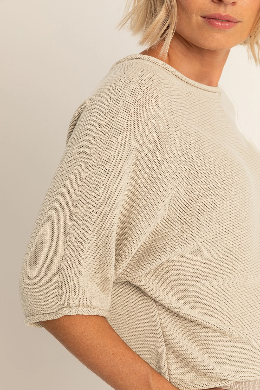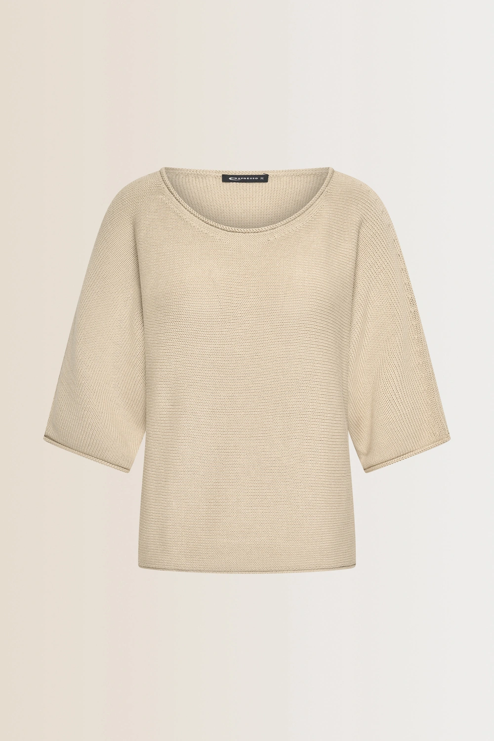 Beige gebreide trui– lichte katoenmix met een subtiele structuur. Losse, comfortabele pasvorm met een elegante wijde ronde hals en ruimvallende vleermuis mouwen. Deze veelzijdige top is perfect voor zowel casual als chique combinaties. De neutrale beige kleur maakt het een onmisbare basic die je moeiteloos kunt stylen.
