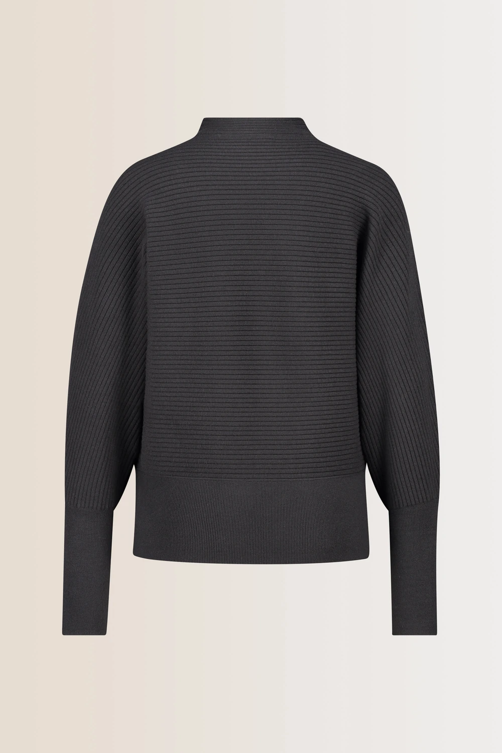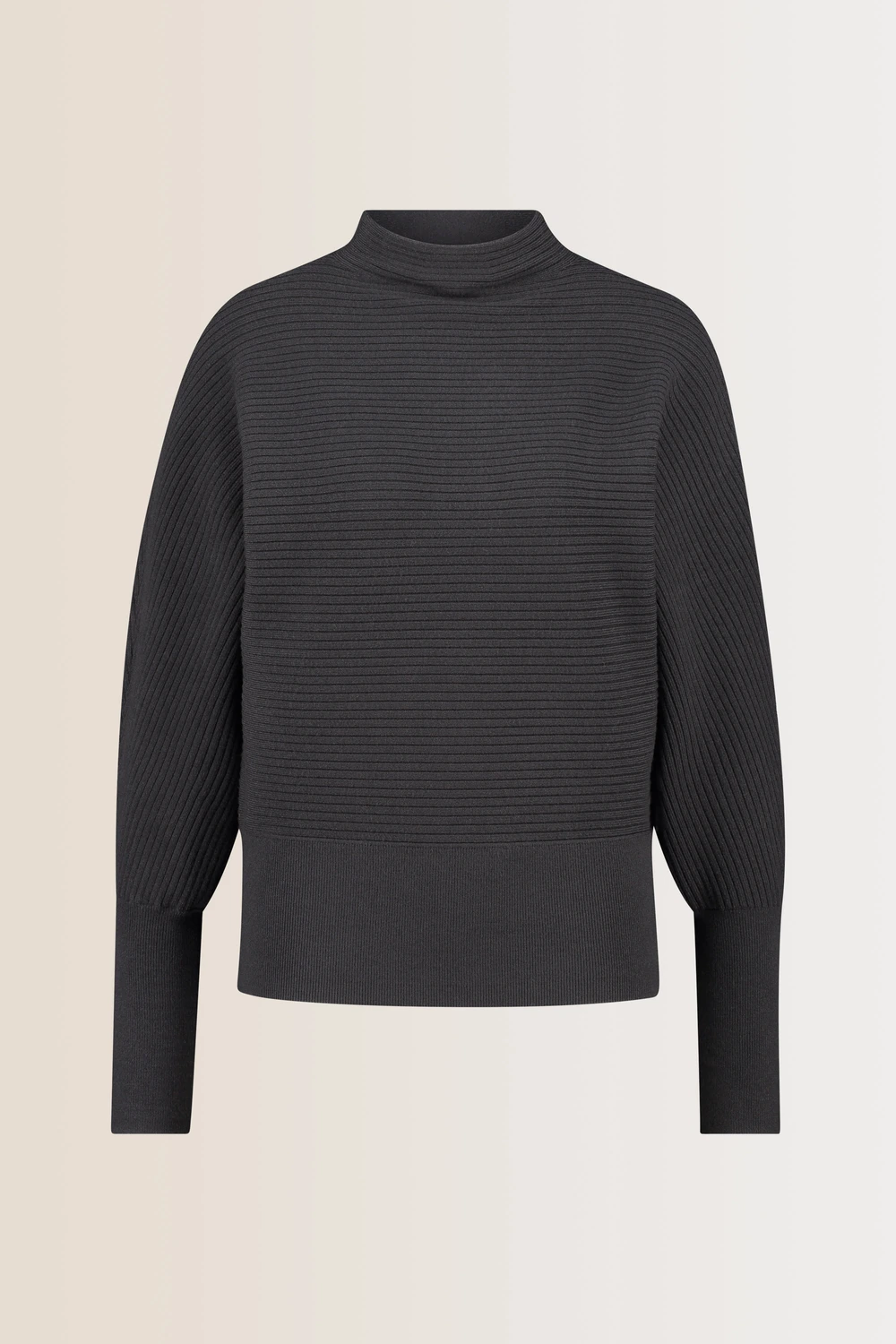 Donkergrijze trui – stretch viscosemix. Relaxed & bloezend, hooggesloten ‘mock neck’, lange vleermuismouwen. Zwaarder ribbreisel, valt mooi sluik. Tip: maak je all-over knitted look compleet met de bijpassende rok.
