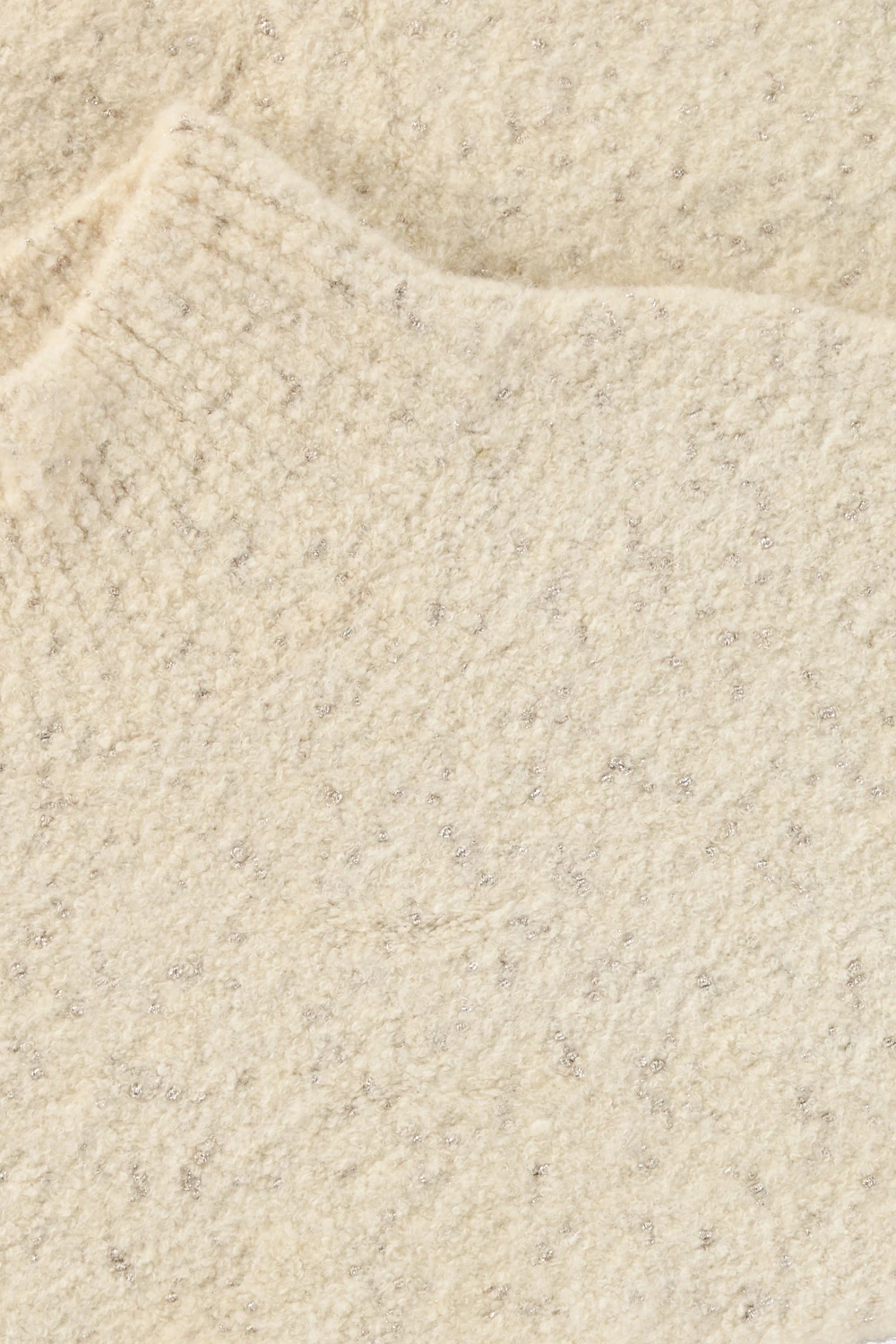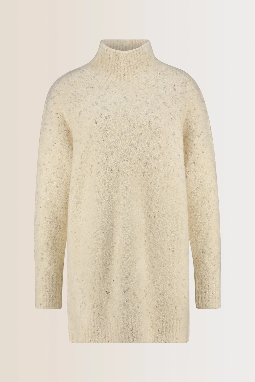 Kitkleurige trui – wolmix met lurex. Recht & relaxed, ribgebreide col, lange mouwen. Zacht en wollig bouclégaren, champagnekleurige lurex. Guilty pleasure bij guur herfstweer: wegkruipen in een warme trui. Tip: de tunieklengte past perfect bij slim-fit leggings en jeans.