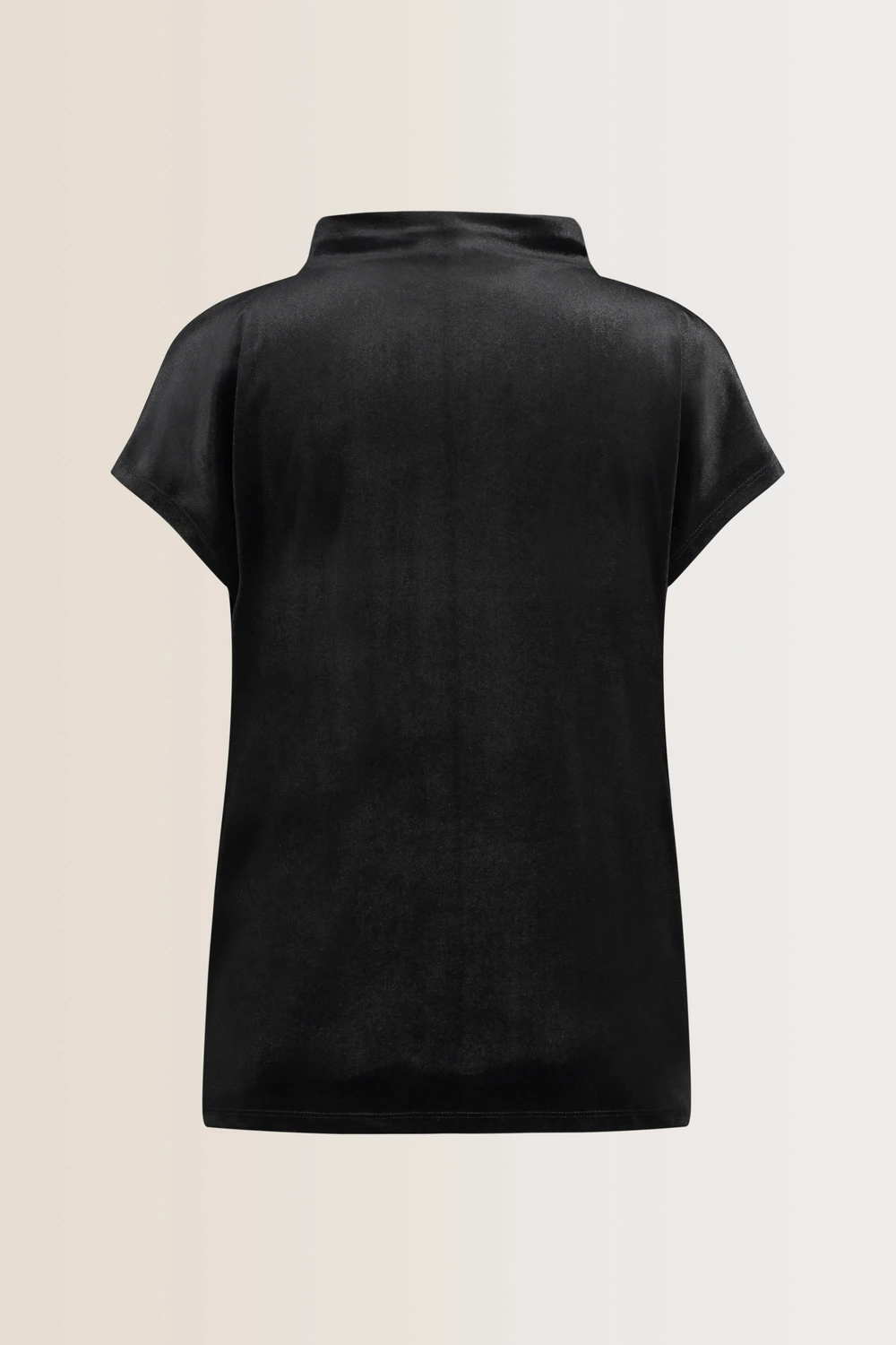 Zwarte velvet top – gladde, fluwelen touch. Recht en relaxed, korte mouwen, opstaande halslijn. De subtiele glans en het zachte materiaal maken deze top een perfecte keuze voor een avondje uit. Combineer met een elegante broek of rok voor een stijlvolle, chique uitstraling.