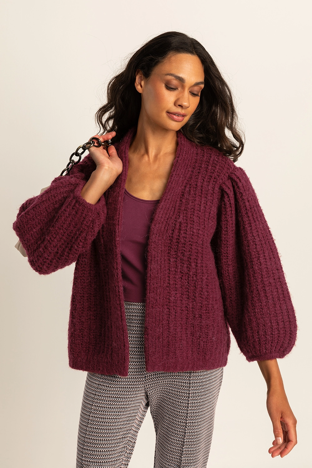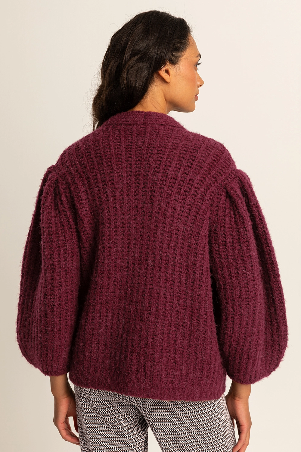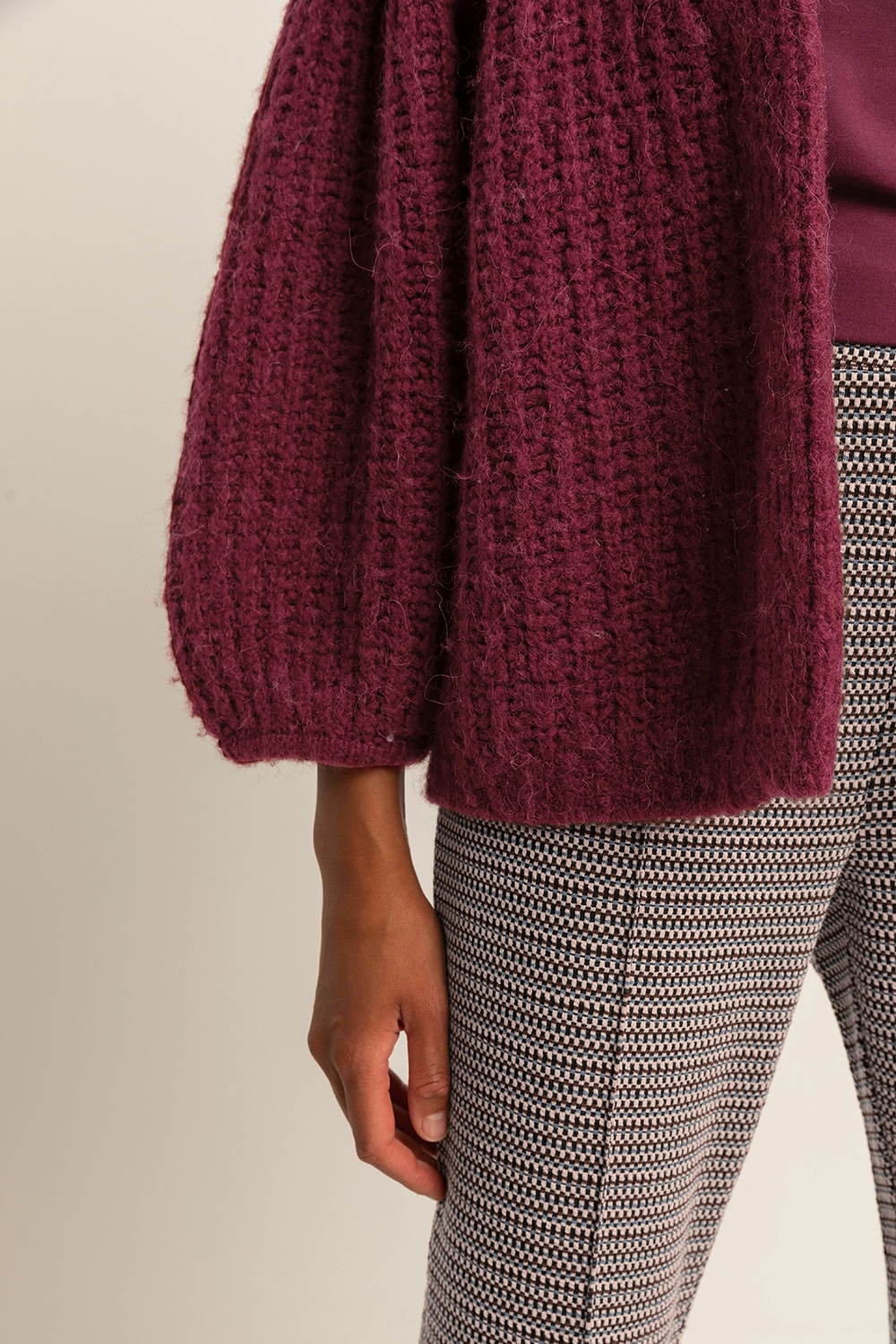 Bordeauxrood vest – wolmix met alpaca. Losvallend model zonder sluiting, met lange ballonmouwen en verlaagde schouders. Het grofgebreide ribpatroon geeft dit vest een rijke, cosy uitstraling, terwijl de luchtige structuur zorgt voor draagcomfort. Ideaal om te layeren over tops en jurken.