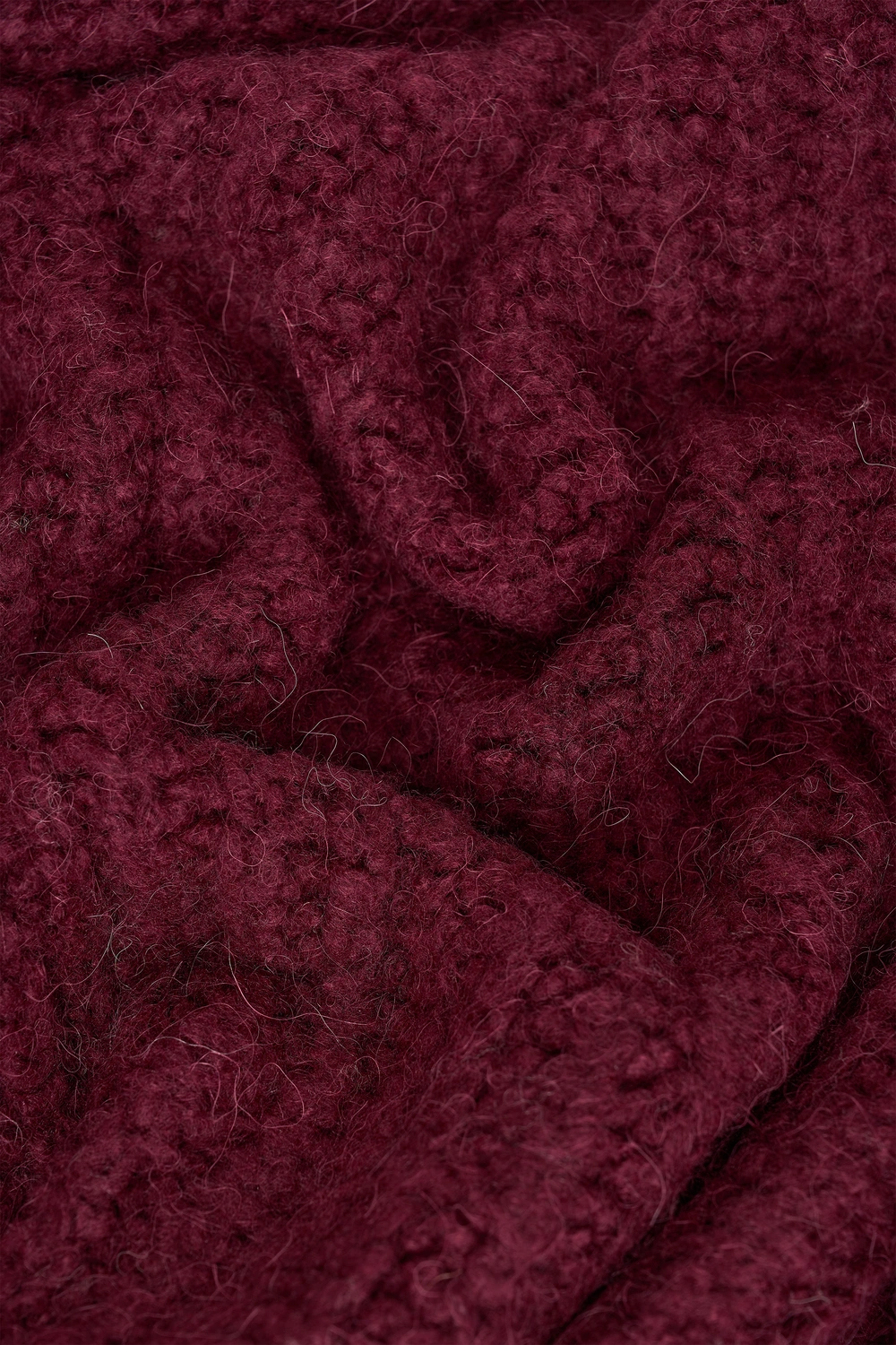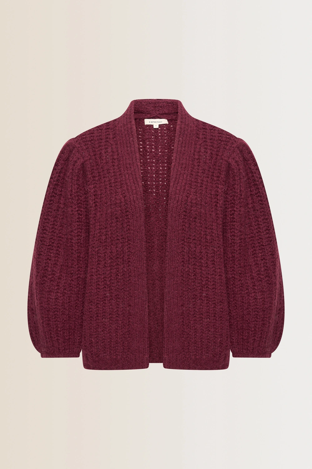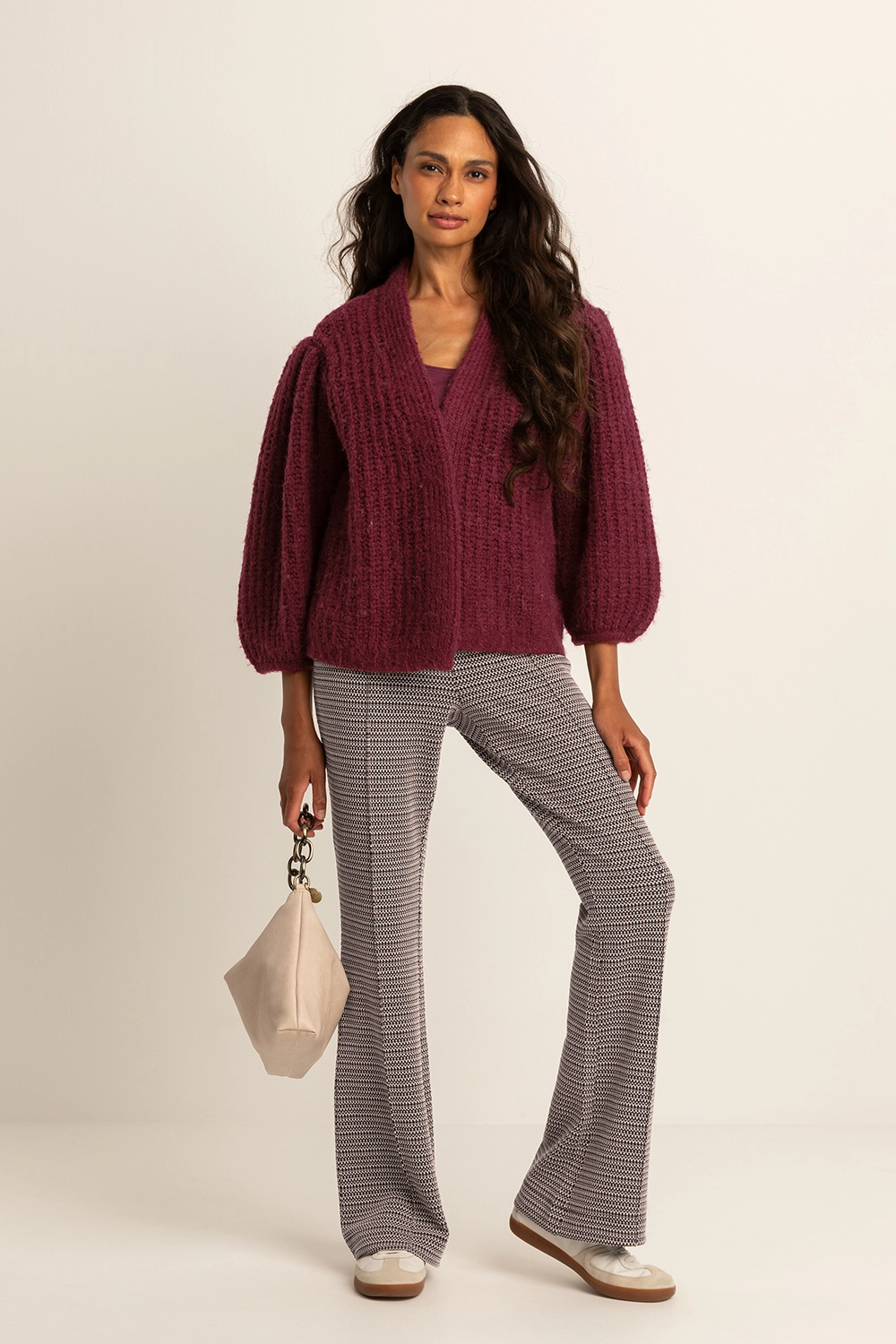 Bordeauxrood vest – wolmix met alpaca. Losvallend model zonder sluiting, met lange ballonmouwen en verlaagde schouders. Het grofgebreide ribpatroon geeft dit vest een rijke, cosy uitstraling, terwijl de luchtige structuur zorgt voor draagcomfort. Ideaal om te layeren over tops en jurken.
