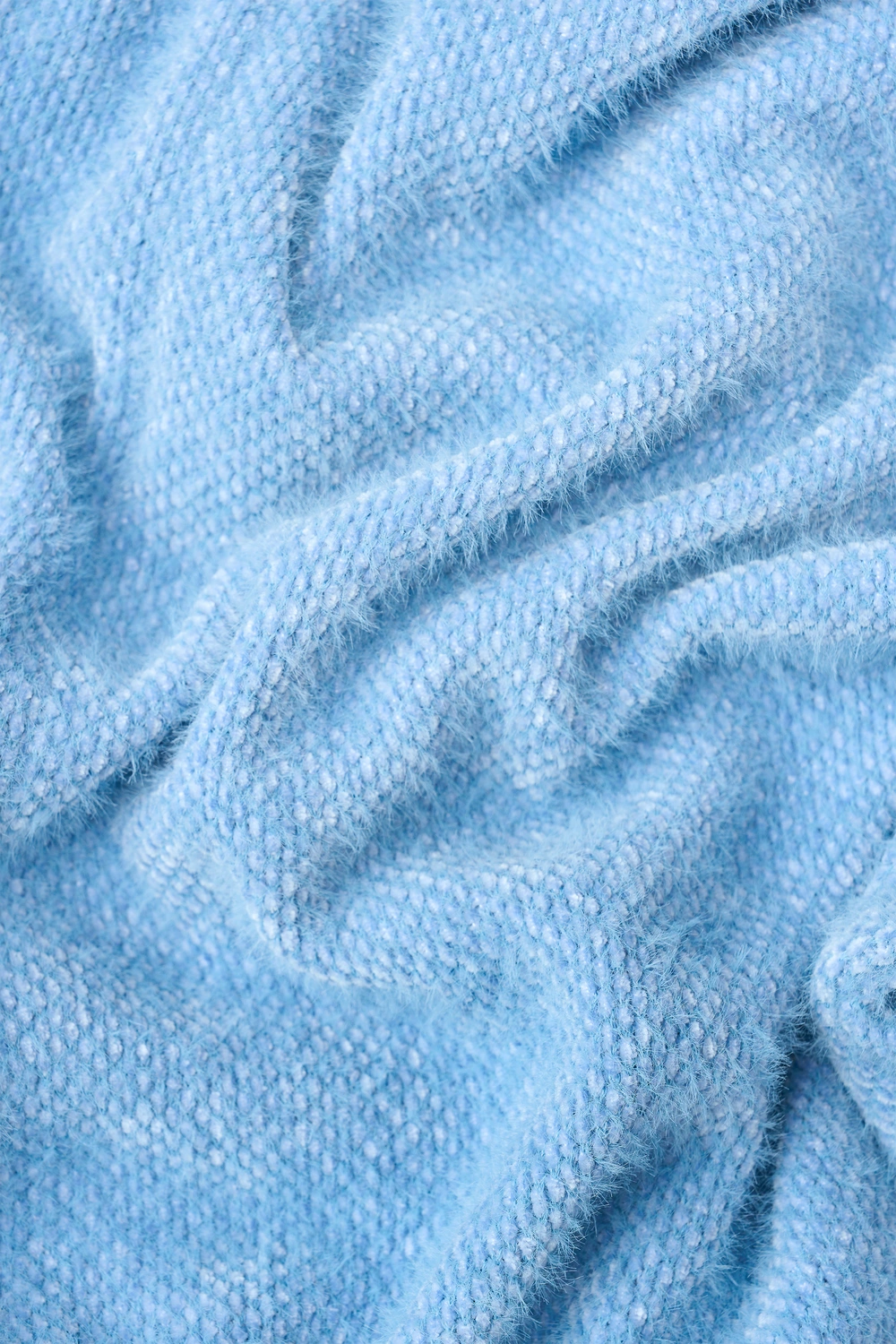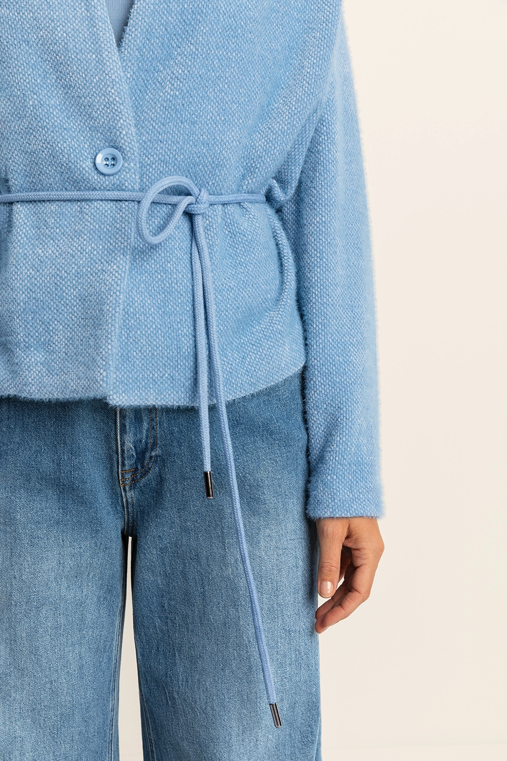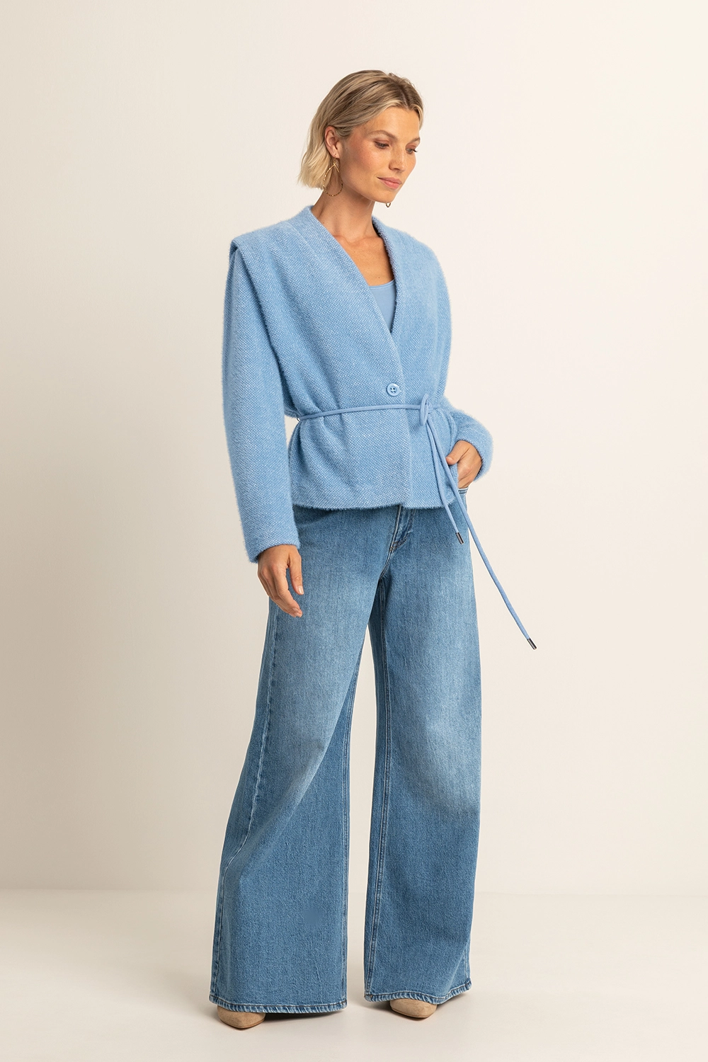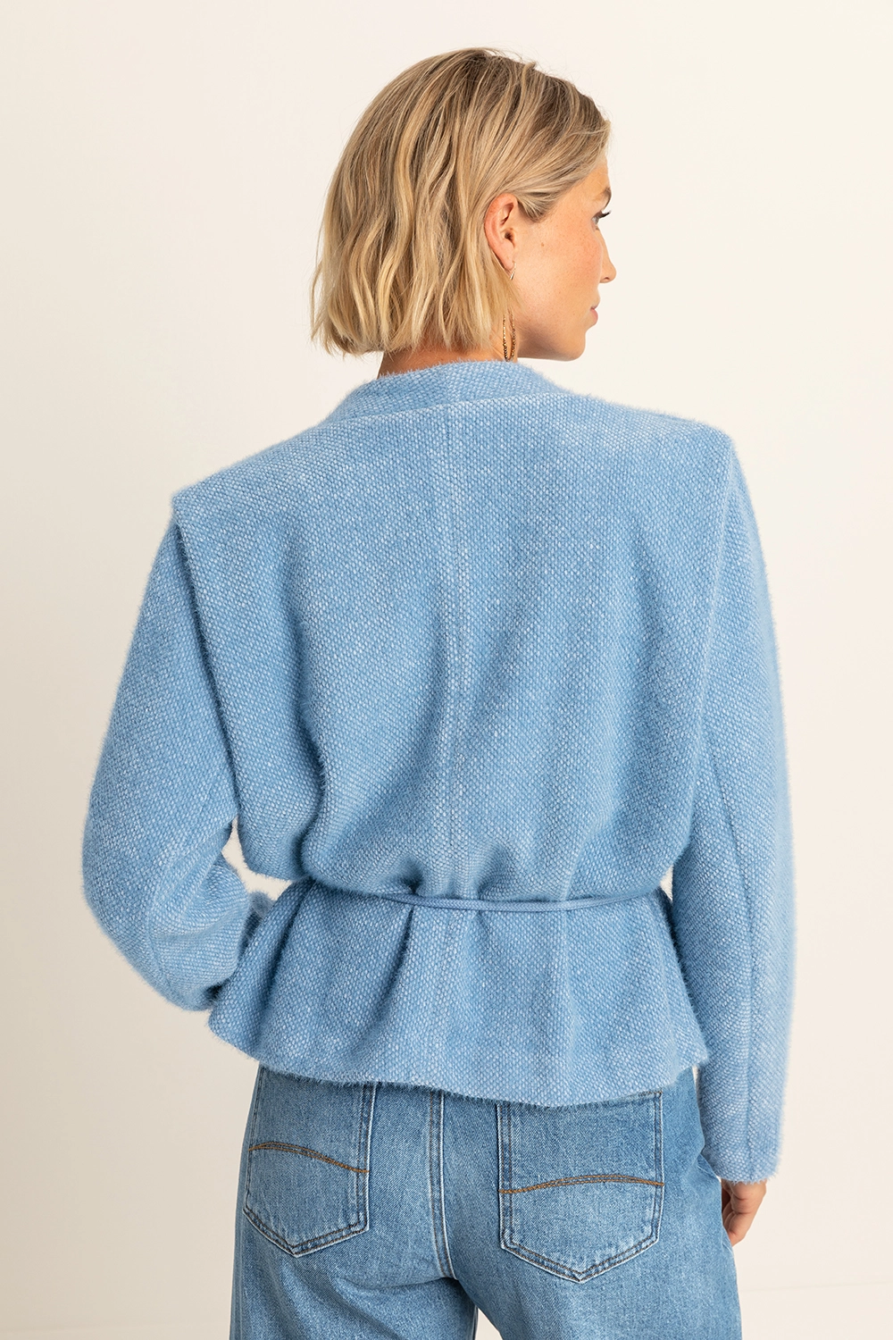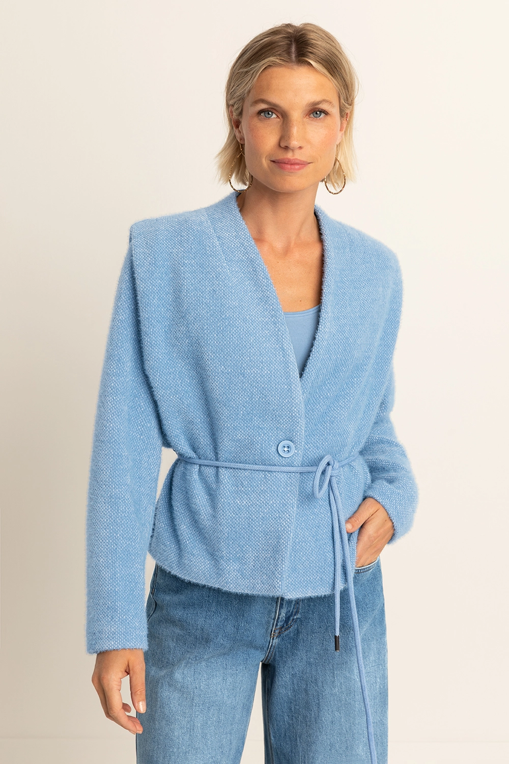 Blauw vest – zachte bouclémix. Minimalistisch design met een verfijnde uitstraling. Dit vest heeft een diepe V-hals, knoopsluiting en een bijpassend strikkoord voor een vrouwelijk silhouet. Het comfortabele materiaal en de elegante snit maken dit een veelzijdig item voor zowel casual als geklede looks.