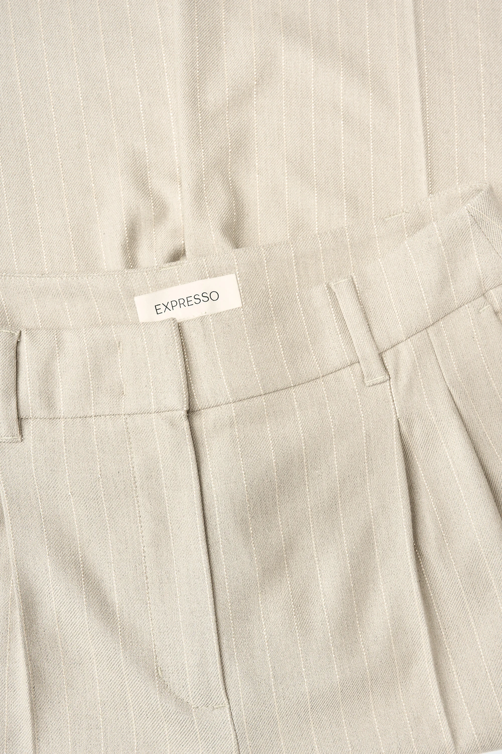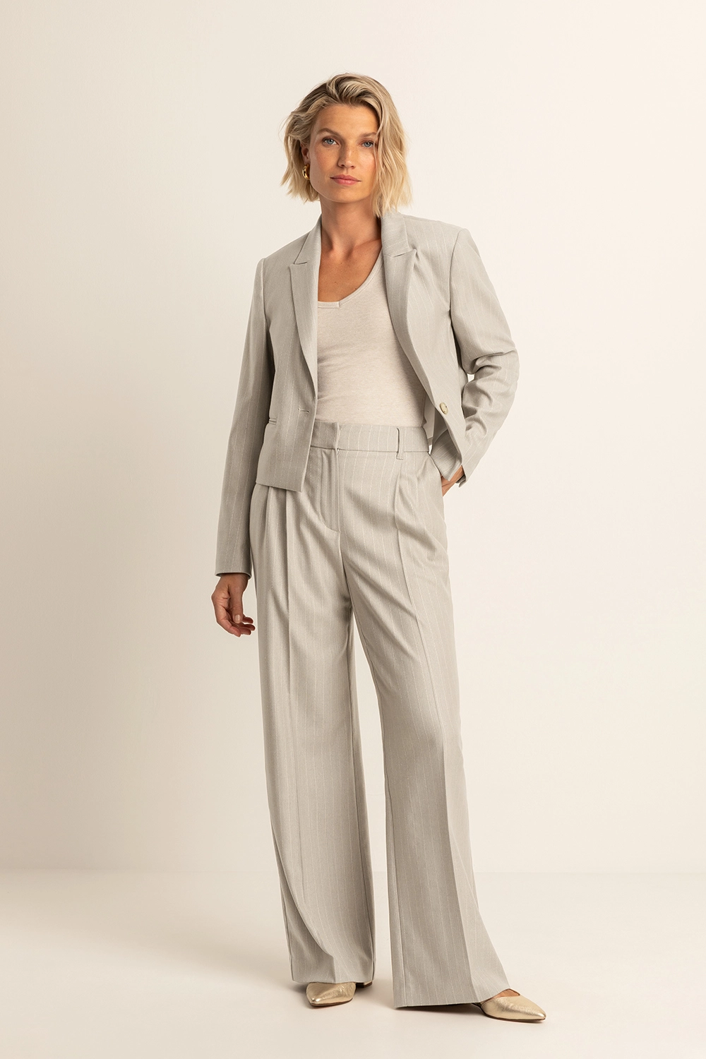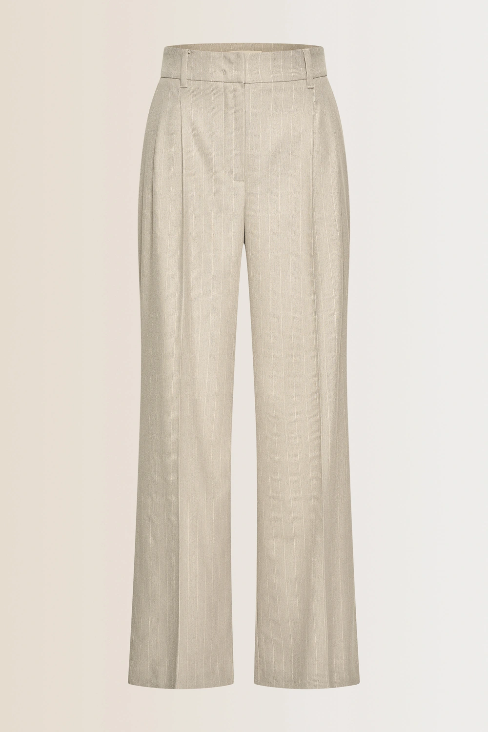 Beige pantalon met krijtstreep – soepelvallende blend. Deze high rise broek heeft een wijde pijp en elegante plooien aan de voorzijde. De krijtstreep geeft een subtiele knipoog naar de klassieke maatpak-stijl, maar de zachte stof en relaxte pasvorm maken dit ontwerp modern. Perfect voor een stijlvolle werkdag of een casual chic diner. Combineer met een blazer voor een complete look.