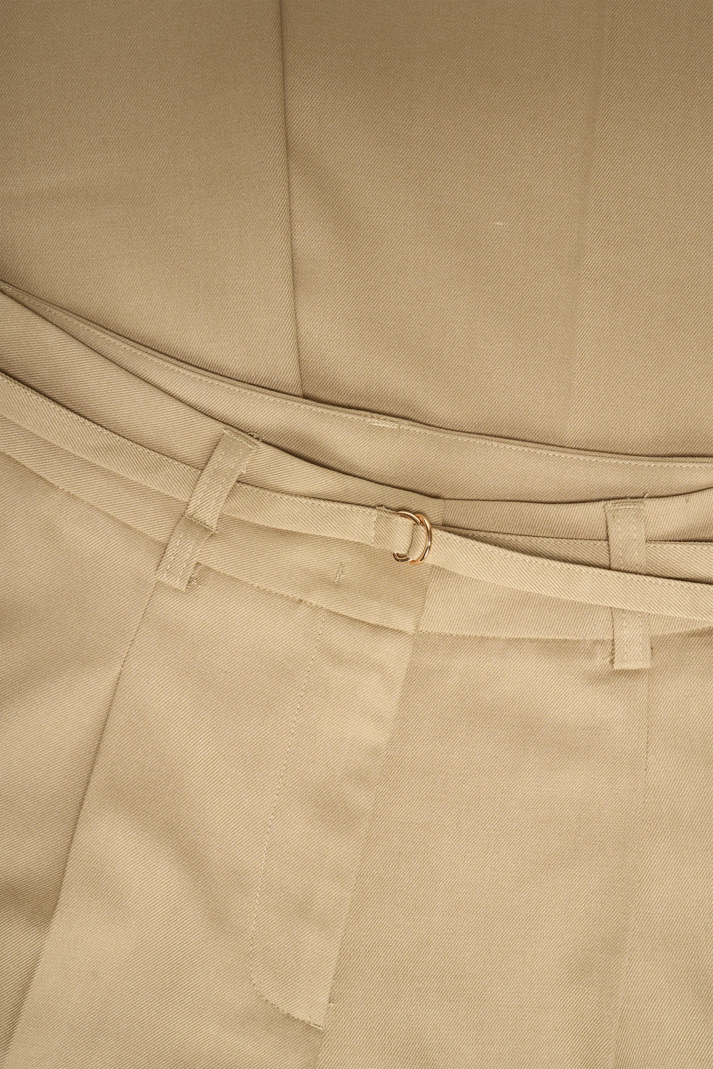 Zandkleurige pantalon – viscosemix met lichte stretch. Deze elegante pantalon heeft een flatterende high waist en een wijde, rechte pijp die zorgt voor een moderne, vrouwelijke look. De persvouw en het bijpassende ceintuurtje met metalen D-ring accentueren de taille.