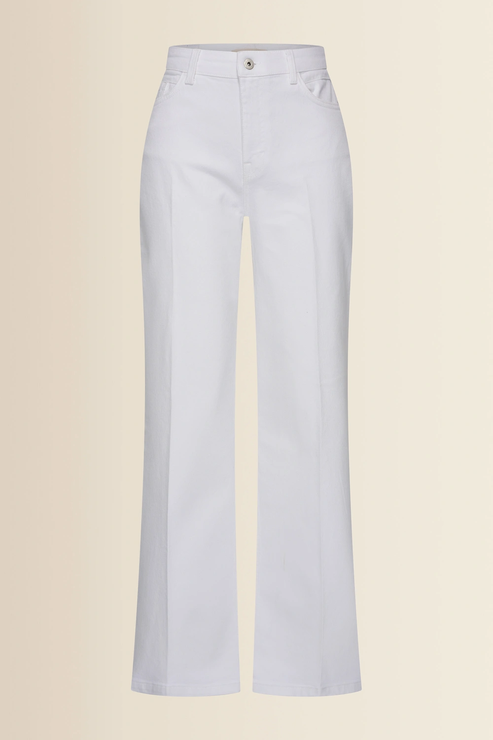 Ecru wide-leg jeans in model PARIS –  zachte touch en comfortabele stretch. Mid-waist model met extra wijde pijpen. De jeans zit mooi aangesloten op de heup en valt soepel langs het been, wat zorgt voor een vrouwelijk en ontspannen silhouet. Perfect voor elke dag.