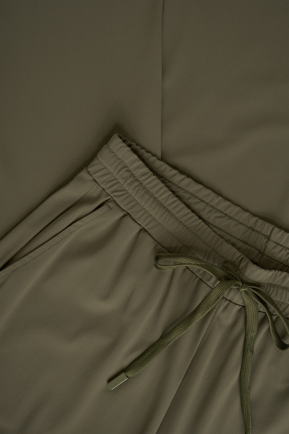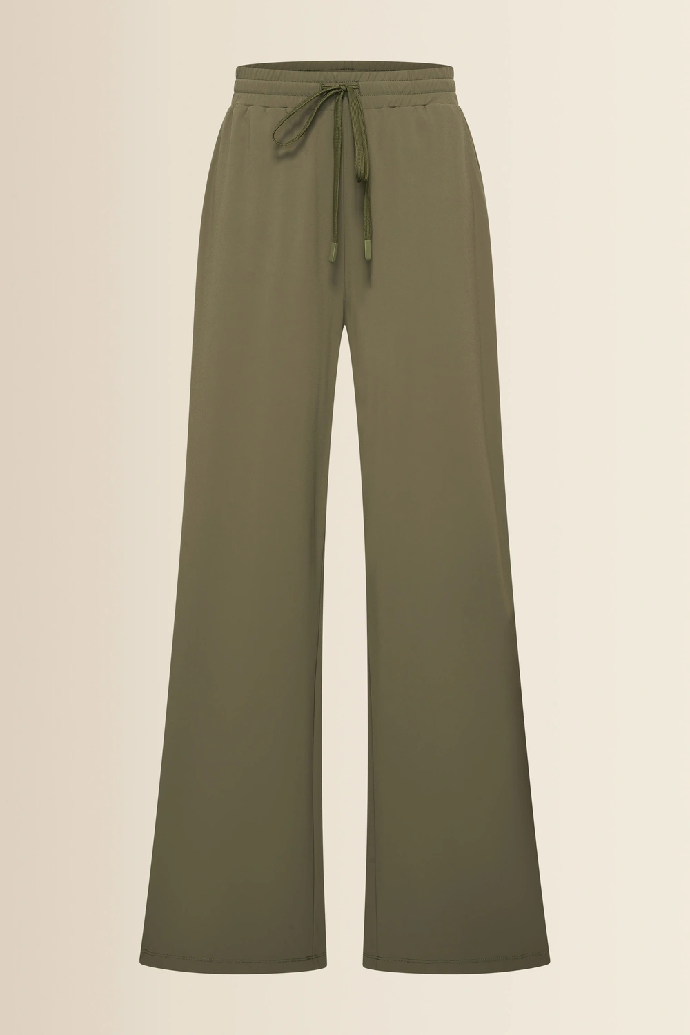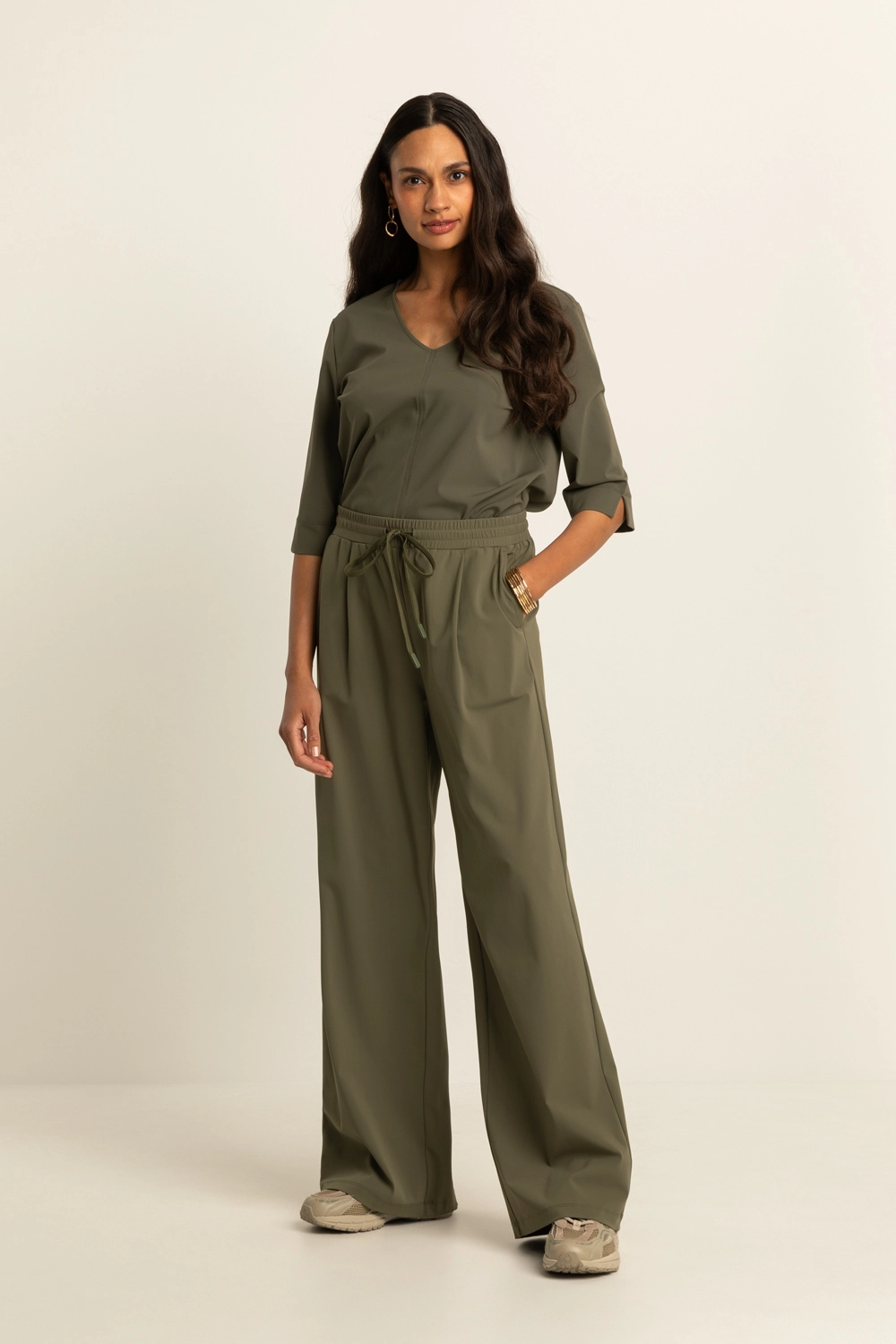 Olijfgroene broek – soepele, travelkwaliteit met een comfortabele stretch. Deze broek heeft een rechte, licht wijde pijp en een elastische tailleband met strikkoord, waardoor hij heerlijk zit én er verzorgd uitziet. De minimalistische uitstraling maakt dit item eindeloos combineerbaar: van relaxed met een knit tot stijlvol met een blouse en blazer.