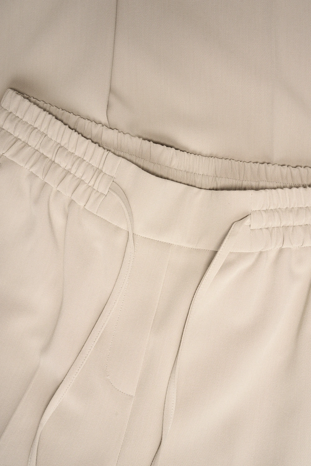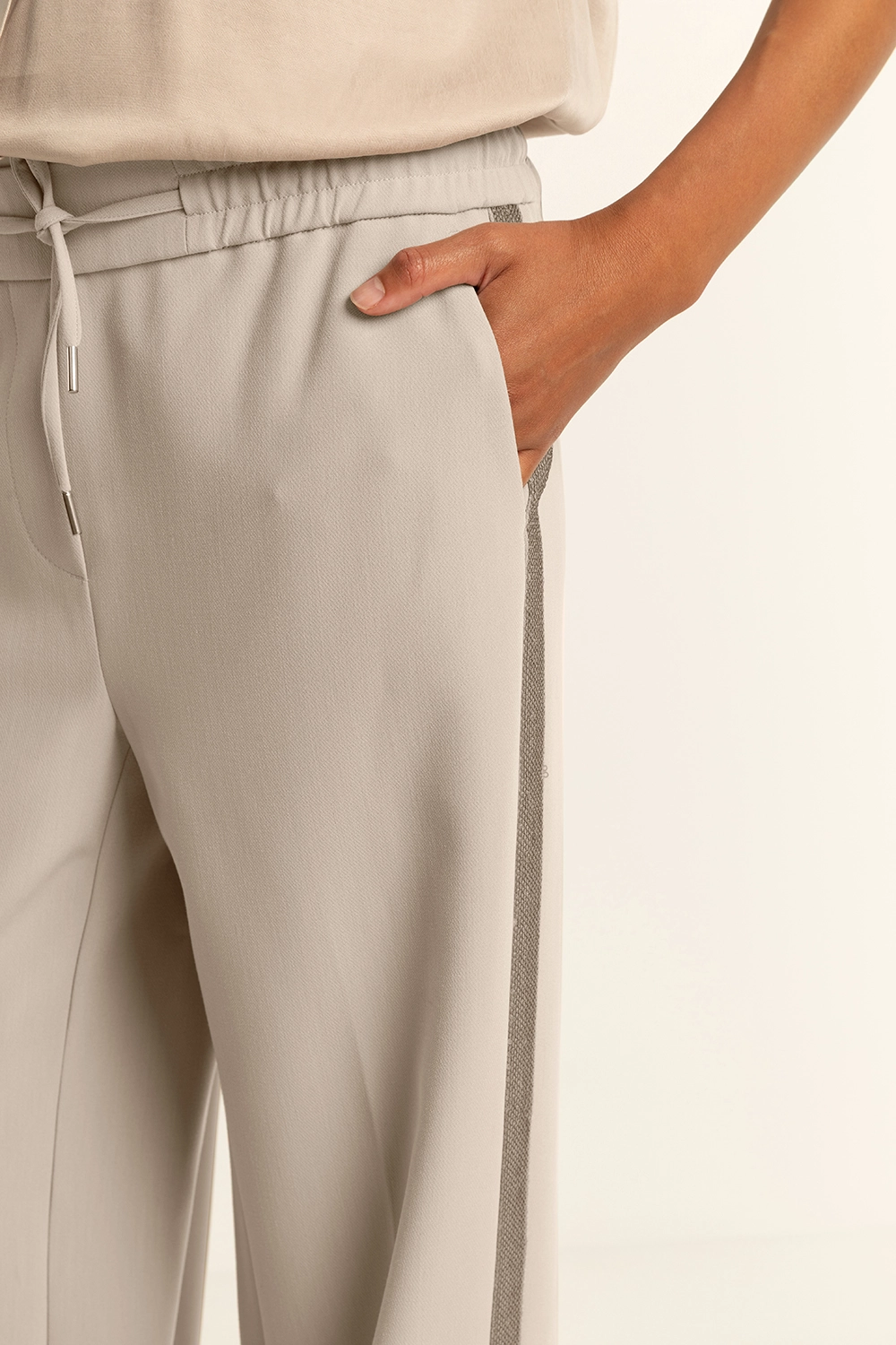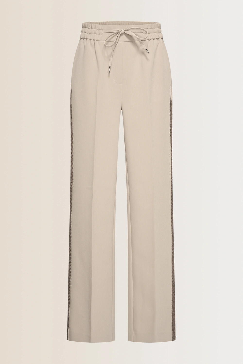 Zandkleurige broek – gerecycled polyesterblend met stretch. Relaxed model met rechte pijpen, elastische tailleband en koord. De glanzende zijbies geeft de broek een sportieve twist, terwijl de soepele stof zorgt voor een elegante valling. Perfect voor een moderne look die comfort en stijl moeiteloos combineert.