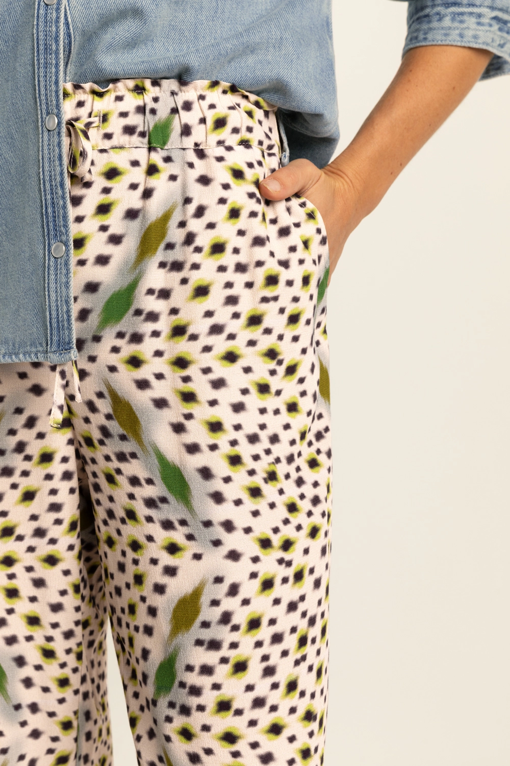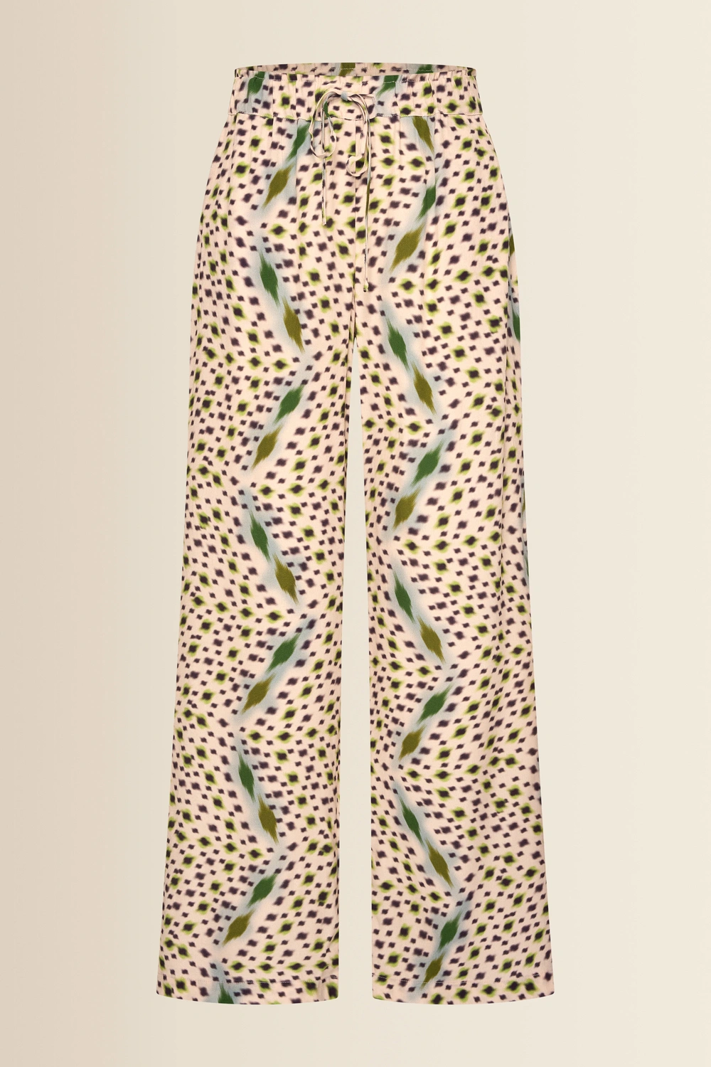 Wijde broek met print – soepelvallende kwaliteit met een all-over print in groen en donkerbruin. Wijde pijpen en een comfortabele elastische tailleband met strikkoord geven deze broek een ontspannen maar stijlvolle uitstraling. De luchtige stof beweegt elegant met je mee en zorgt voor een moeiteloos silhouet. Draag ‘m als statement piece met een eenvoudige top of combineer met de bijpassende blouse voor een krachtige co-ord look.