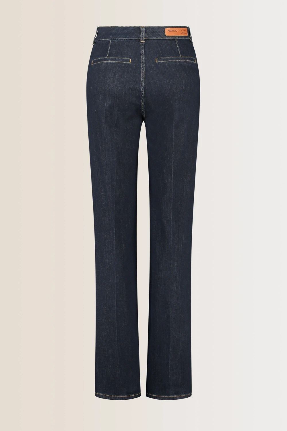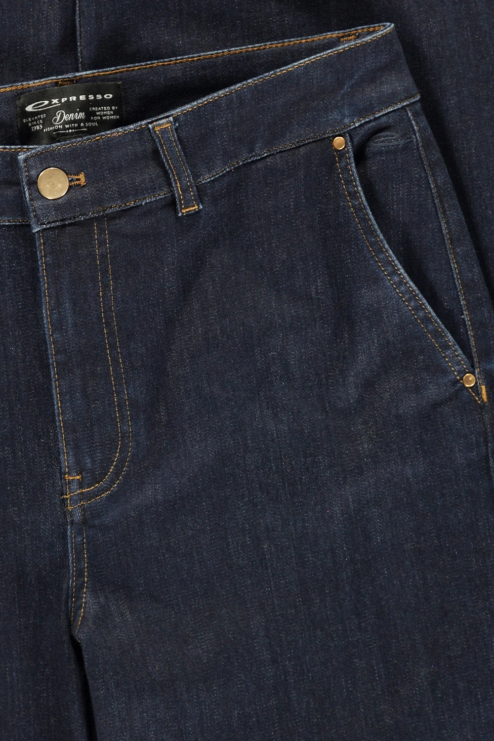 Donkerblauwe jeans chino – stretch katoenmix. Middelhoge taille, rechte wijde pijpen, voetlengte. Stevige stretch-denim, donkere wassing, goudkleurige jeansknopen. Tip: ga voor een dark-denim capsule met de bijpassende blouse en doorknooprok.