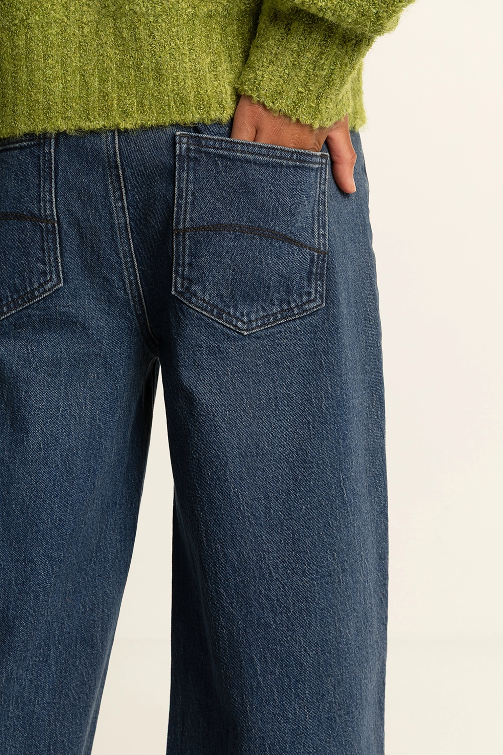 Donkerblauwe jeans in model ROME – katoenmix met stretch. Deze jeans heeft een hoge taille en extra wijde pijpen voor een moderne, flatterende pasvorm. Het minimalistische ontwerp met subtiele wassing geeft een tijdloze uitstraling, ideaal om eindeloos te combineren van casual tot chic.