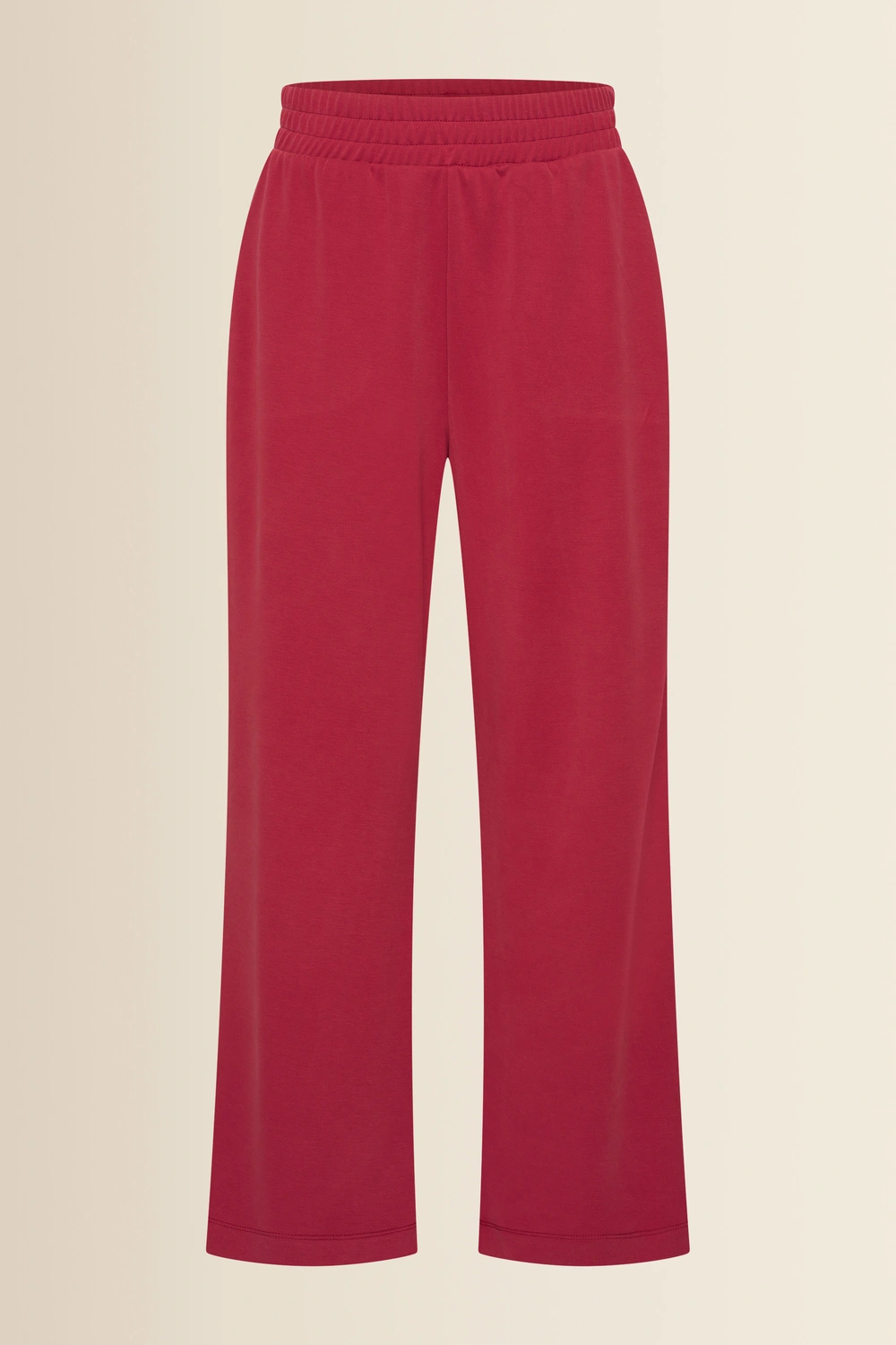 Rode broek – soepelvallende jersey kwaliteit met een gladde, comfortabele touch. Relaxed en elegant vallend, met een elastische tailleband, steekzakken en rechte wijde pijpen. De zachte stretch en cleane afwerking maken deze broek ideaal voor dagen waarop comfort en een verzorgde uitstraling moeiteloos samenkomen. Een veelzijdig item dat je makkelijk combineert, van casual tot meer gekleed.