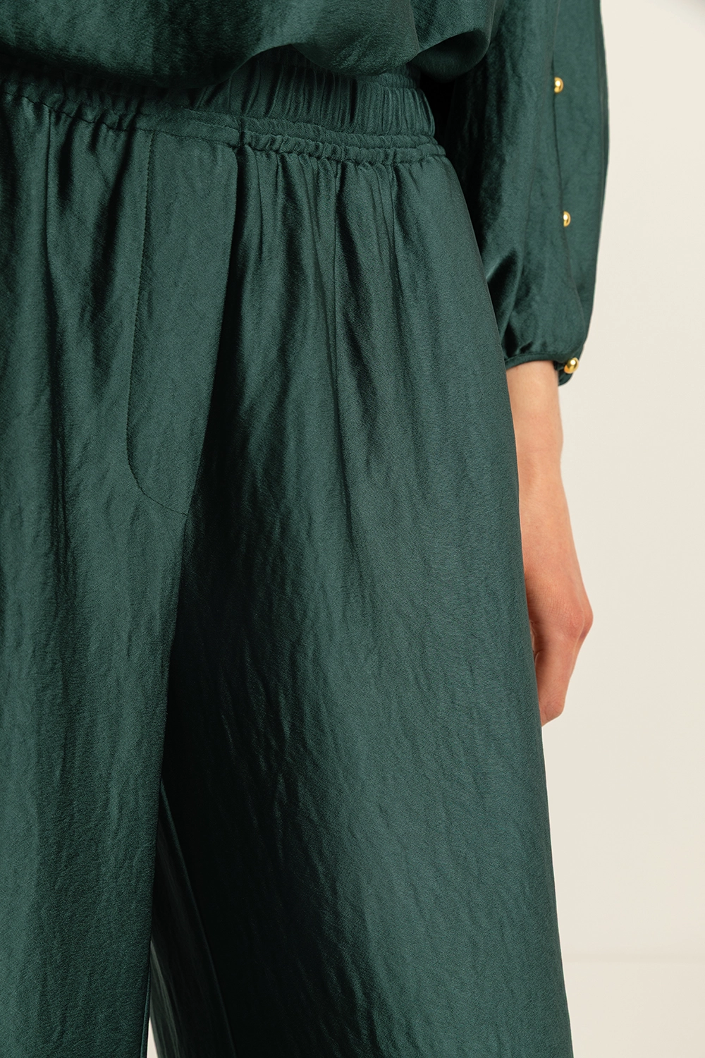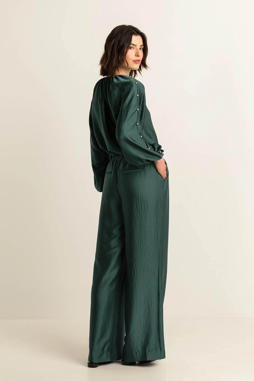 Groene broek– Soepelvallende en glanzende, met een chique glans die elke look direct verfijnt. De elastische tailleband zorgt voor ultiem draagcomfort, terwijl de rechte, wijde pijp een elegante lengte creëert. Combineer met een feestelijke top of blazer voor een moeiteloze, moderne avondoutfit.