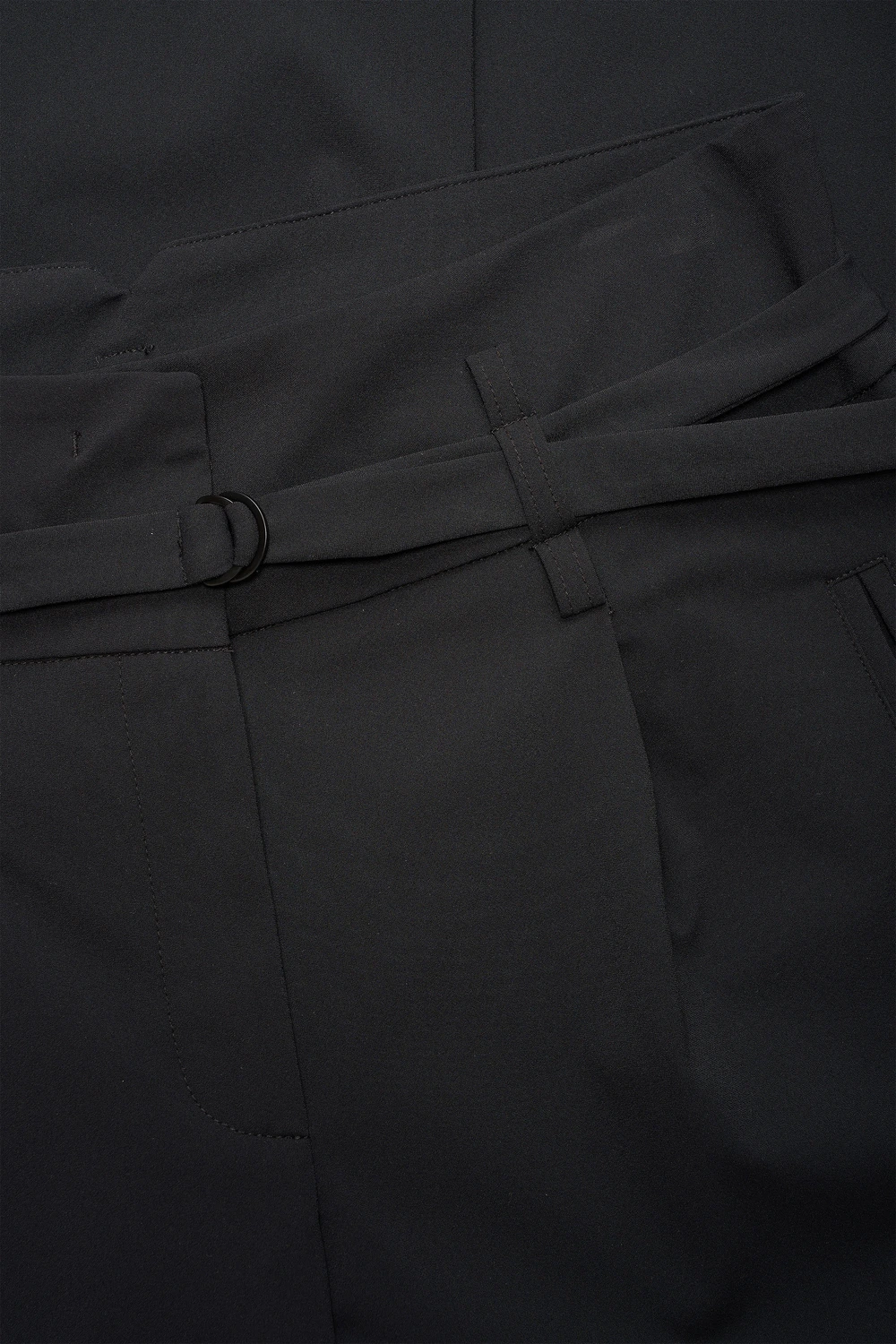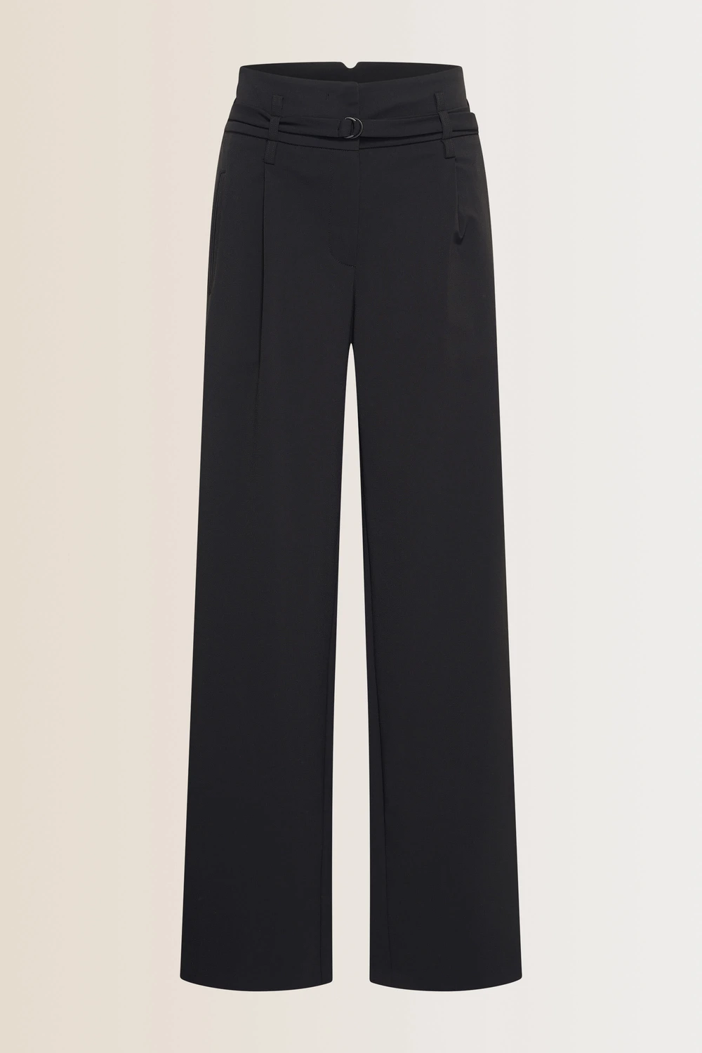 Wijde travel broek – soepelvallende kwaliteit met een stijlvolle tailleband en dubbele riemlussen, voorzien van een subtiele D-ring sluiting. Het hoge model en de rechte, wijde pijpen creëren een flatterend silhouet dat zowel elegant als comfortabel is. De decoratieve paspelzak aan de achterkant en de scherpe vouwen aan de voorkant geven deze broek een verfijnde afwerking. Perfect te combineren met een blouse en hakken voor een moderne, zakelijke look, of met knitwear voor een casual-chic uitstraling.