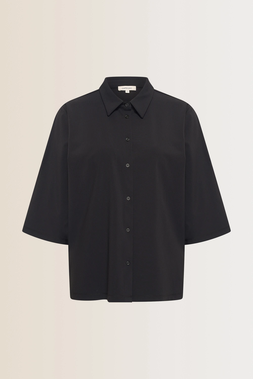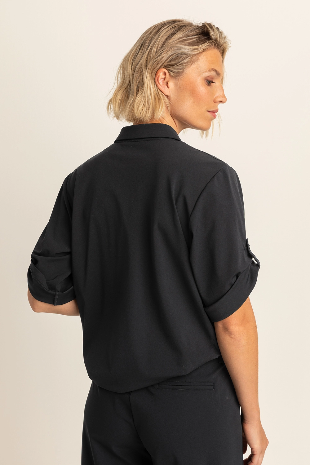 Zwarte blouse – soepelvallende travelstofmix met een subtiele glans. Recht en losvallend model met korte, wijde mouwen en een klassieke kraag. De doorlopende knoopsluiting en minimalistische afwerking geven deze blouse een moderne, veelzijdige uitstraling. Perfect te combineren met zowel een jeans als een elegante pantalon voor een moeiteloze look.