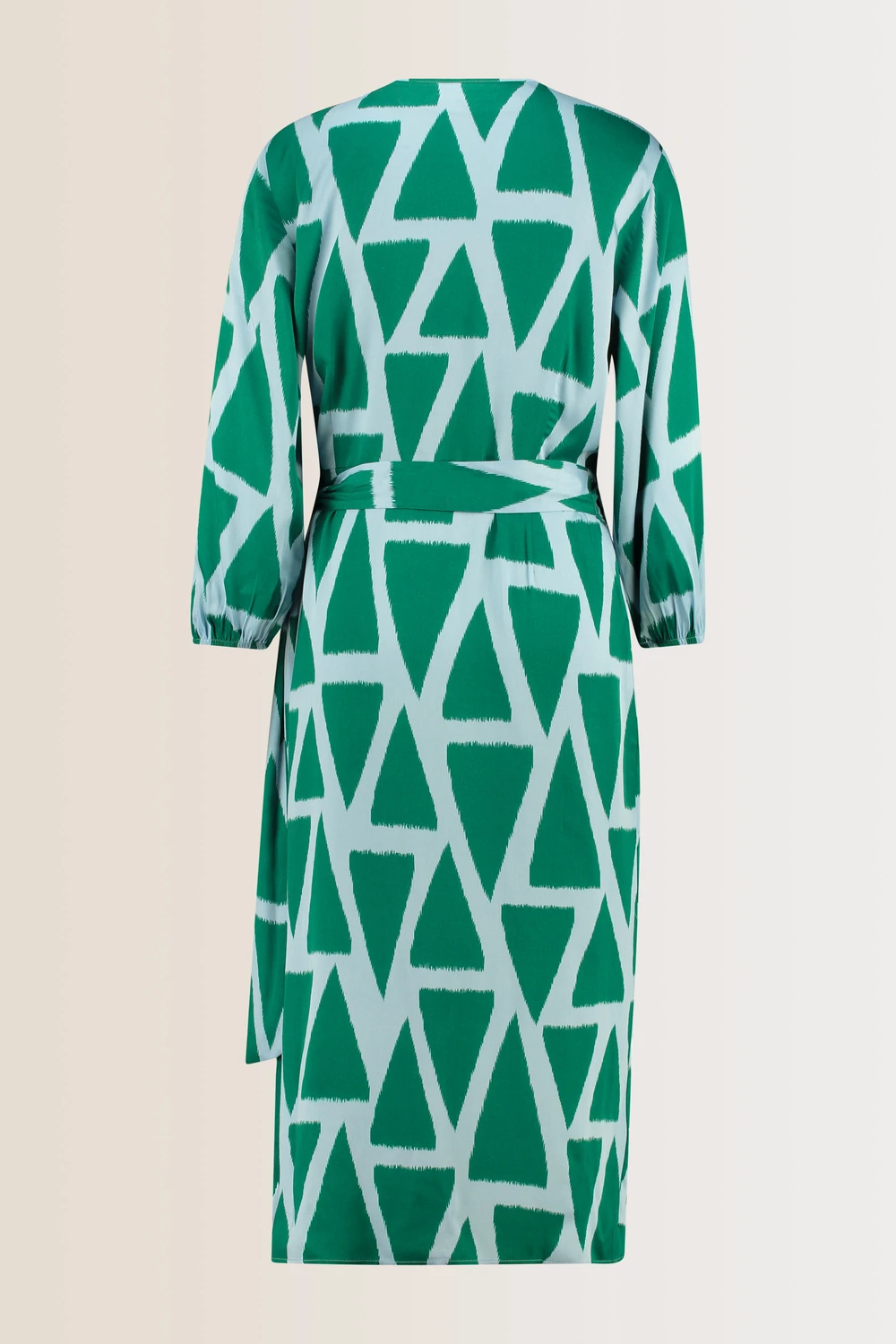 Wikkeljurk met print – viscose. Wikkelsluiting met strikceintuur, driekwartmouwen, kuitlengte. Soepele stof, subtiele satijnglans, grafische print in flessengroen en ijsblauw. De iconische wikkeljurk: staat elk figuurtype, straalt één en al vrouwelijkheid uit.