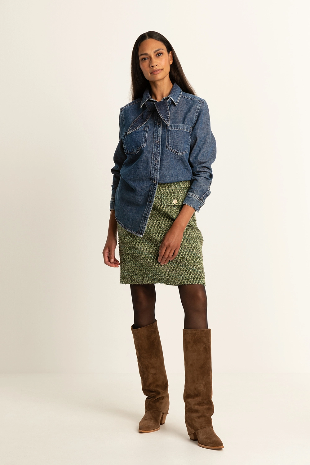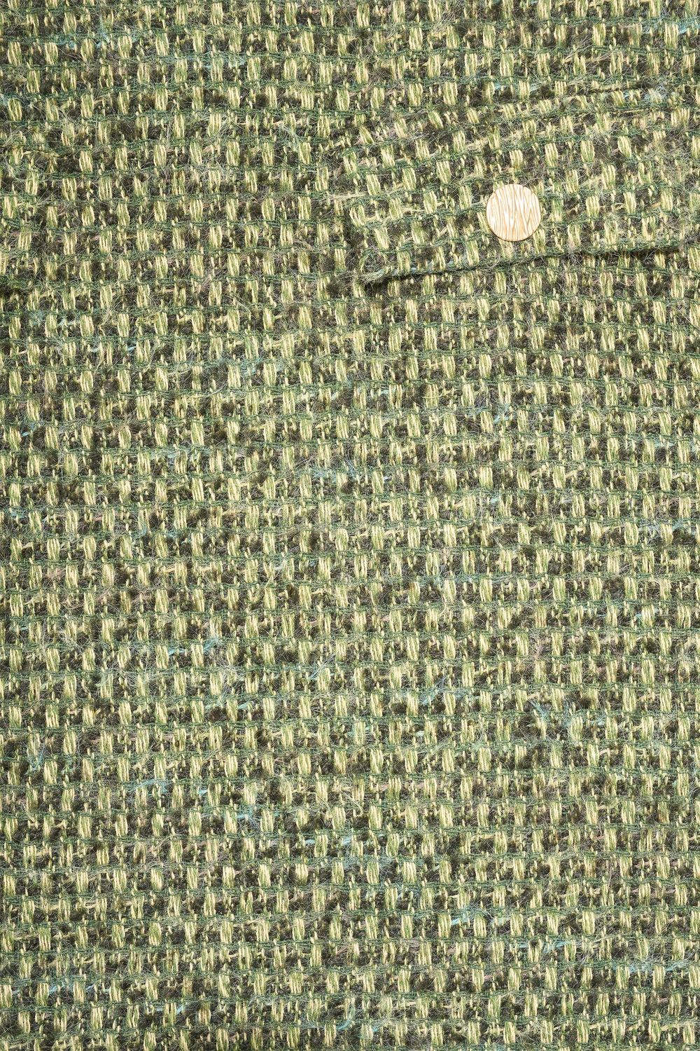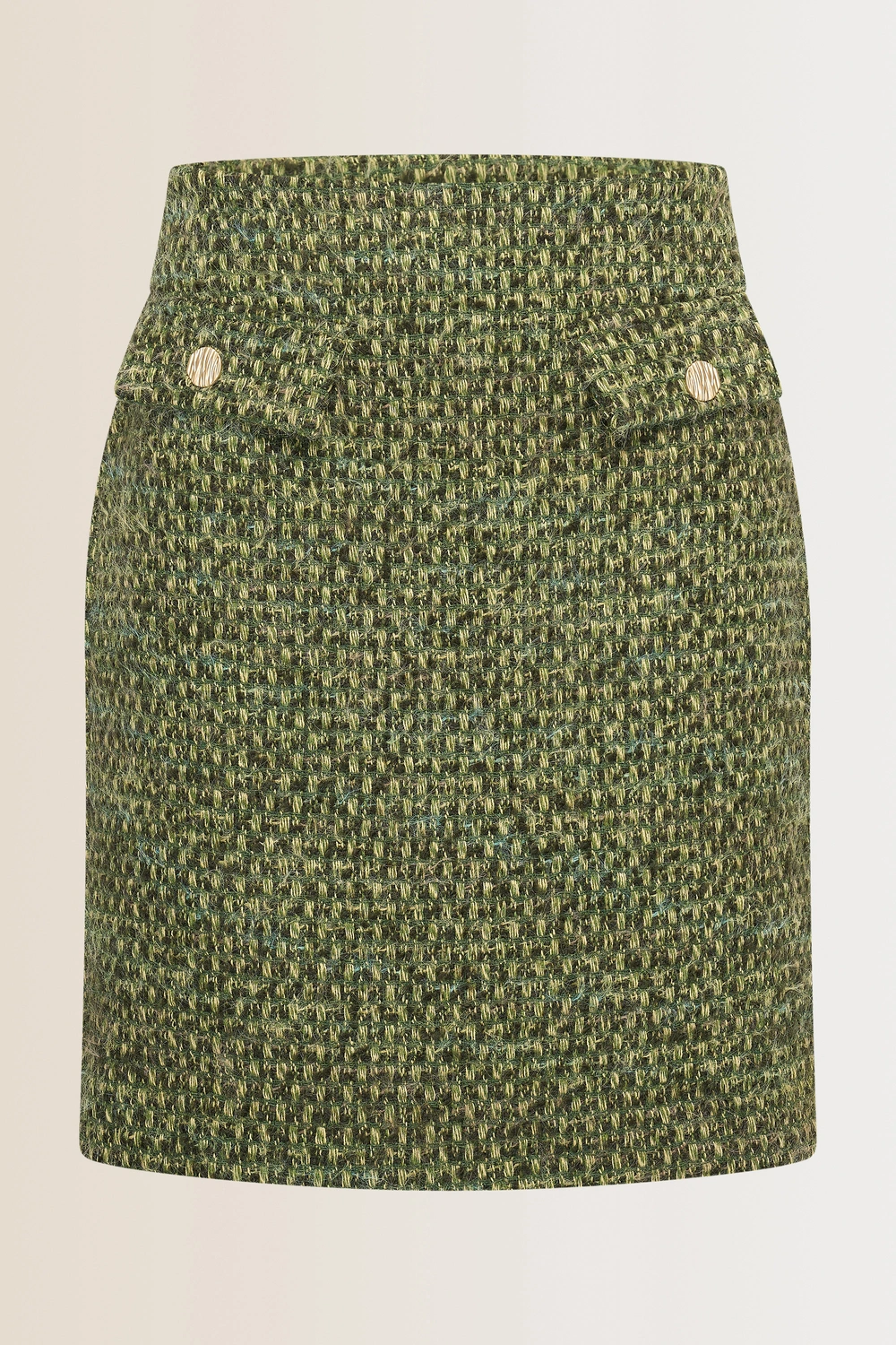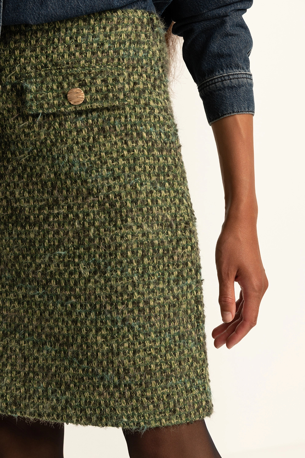 Groene bouclé rok – met een rijke structuur. Deze korte rok heeft een aangesloten pasvorm en is afgewerkt met klepzakjes en goudkleurige knopen voor een elegante, moderne touch. Het boucléweefsel geeft de rok een luxueuze uitstraling die perfect past bij het najaar.