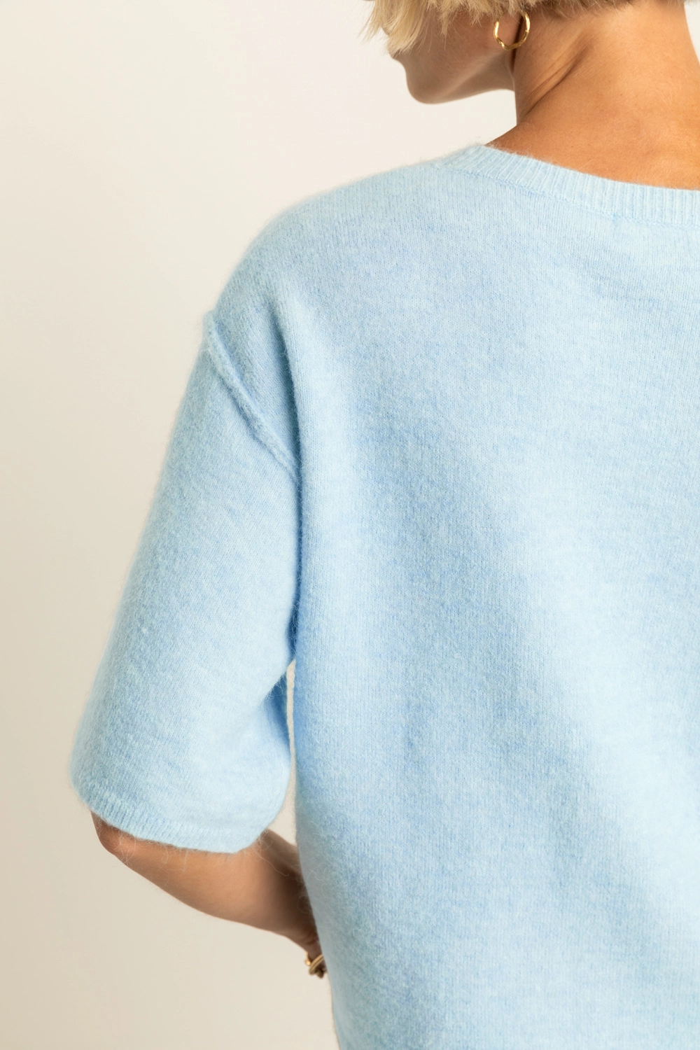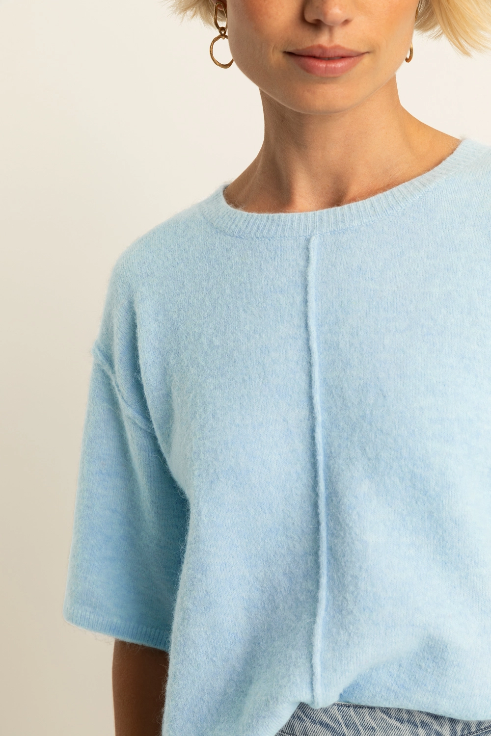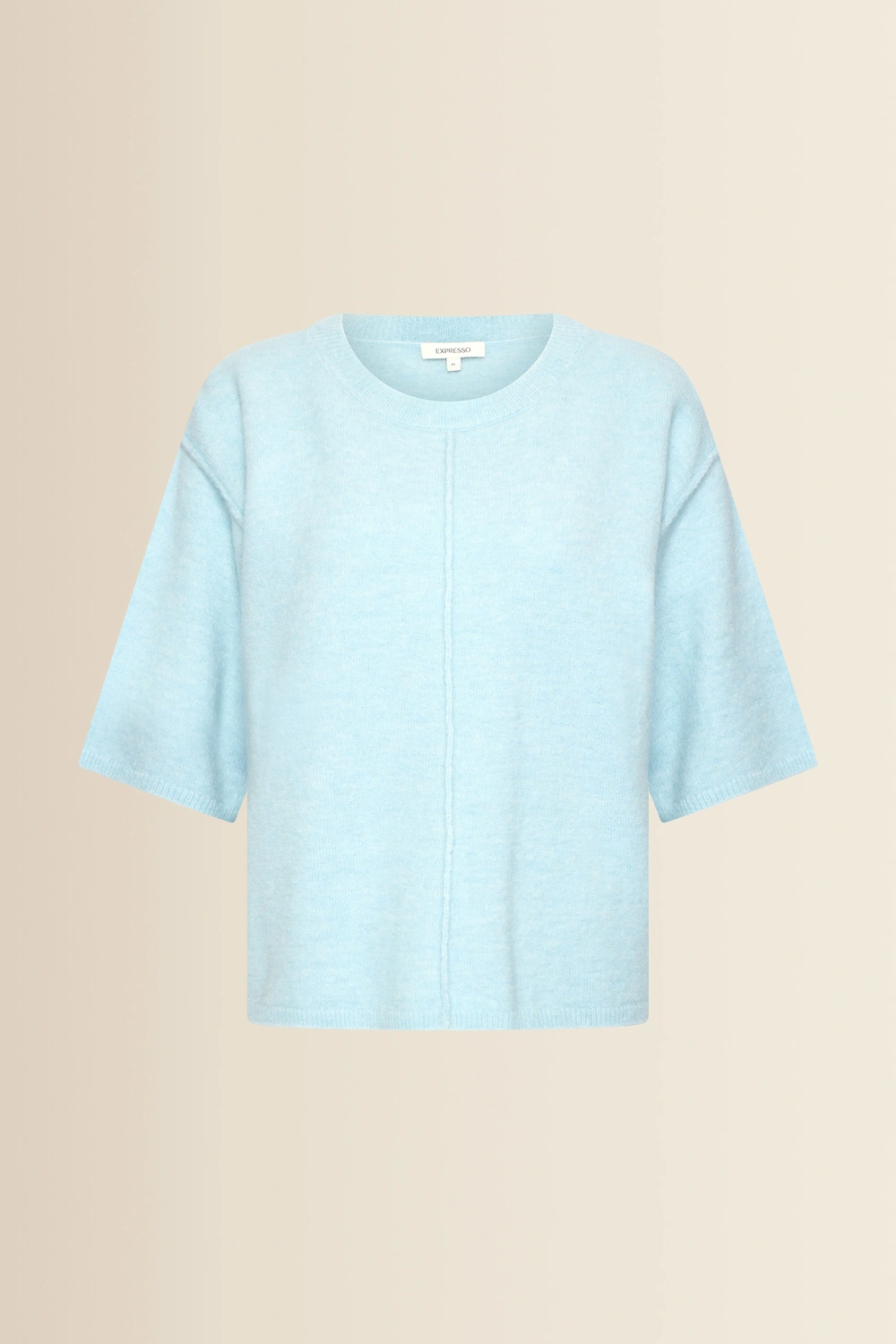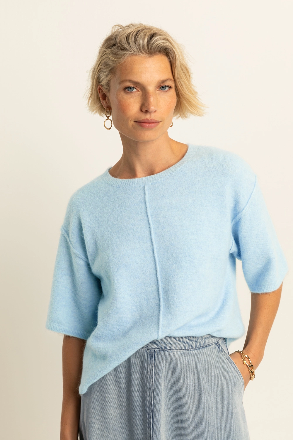 Fijngebreid T-shirt – zachte knit met een comfortabele, licht boxy fit. De korte mouwen en wijde ronde hals geven dit item een moderne, ontspannen uitstraling, terwijl de subtiele naad middenvoor zorgt voor een verfijnd detail. Een veelzijdige essential die moeiteloos meegaat van werkdag tot weekend.