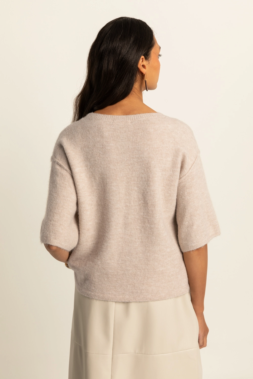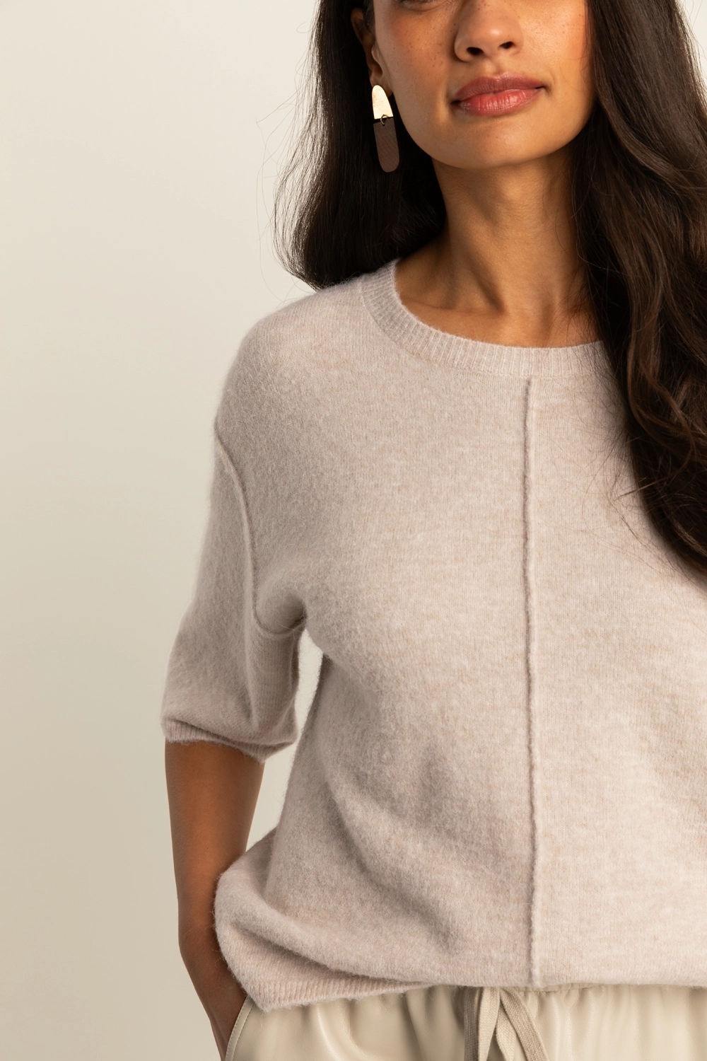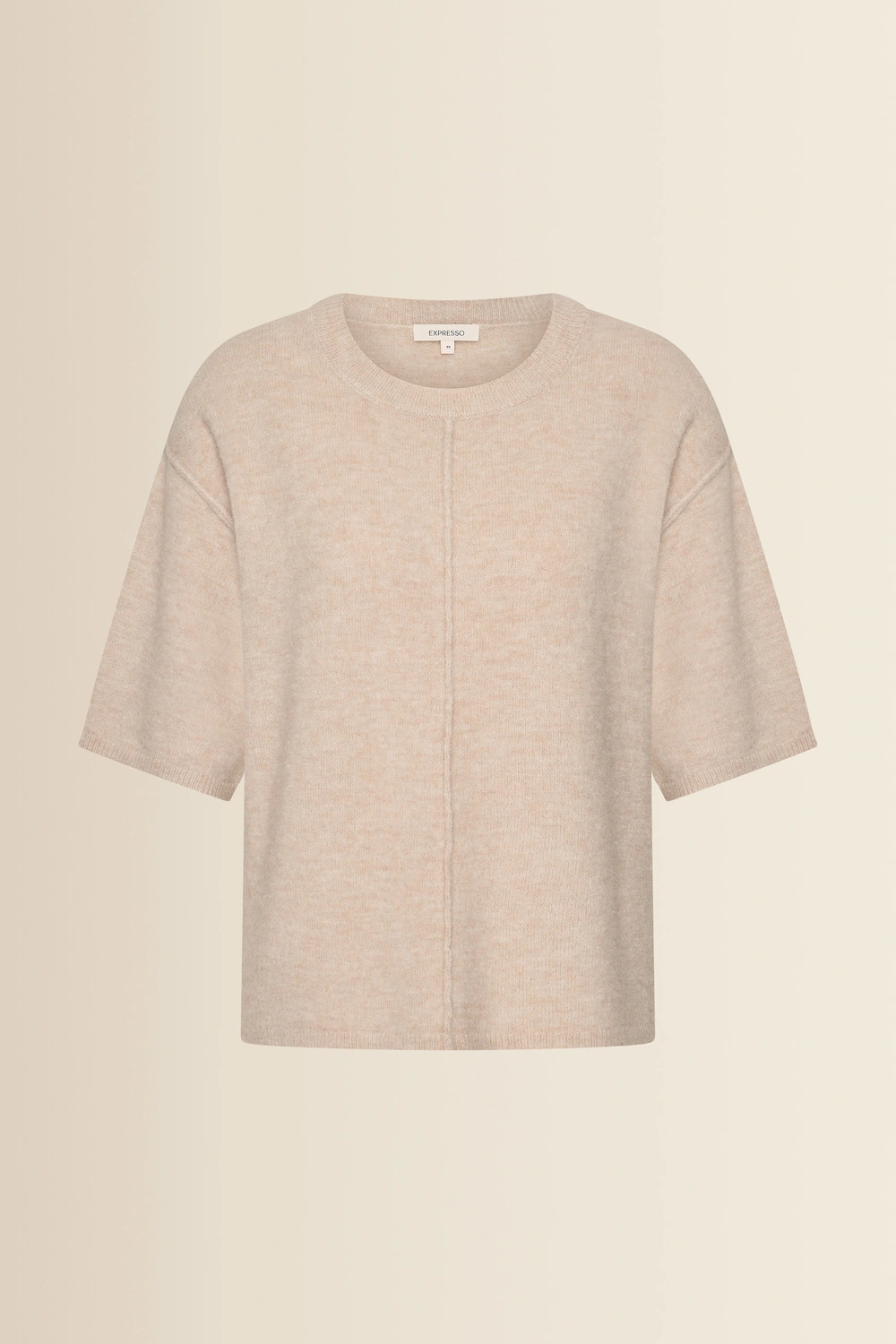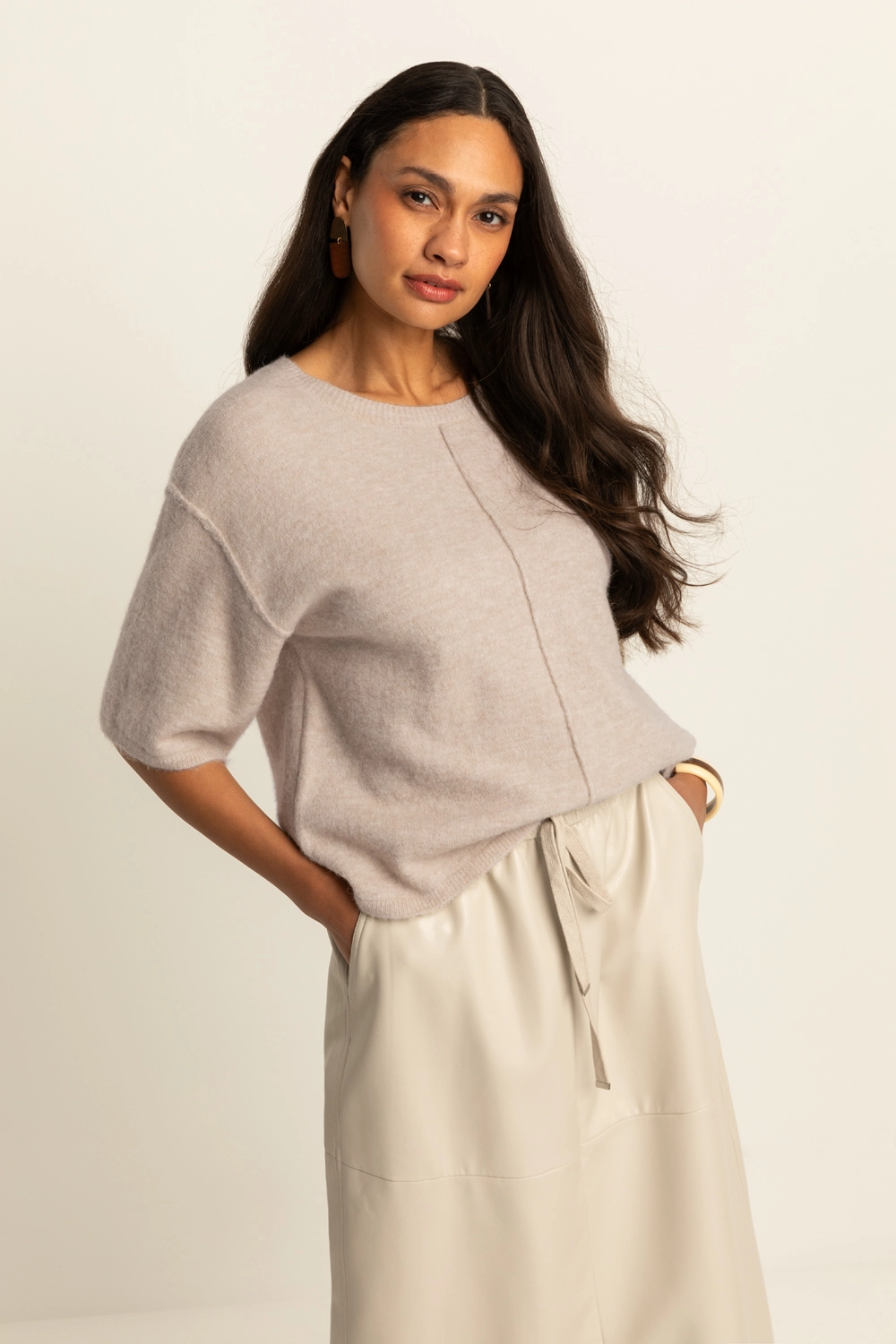 Fijngebreid T-shirt – zachte knit met een comfortabele, licht boxy fit. De korte mouwen en wijde ronde hals geven dit item een moderne, ontspannen uitstraling, terwijl de subtiele naad middenvoor zorgt voor een verfijnd detail. Een veelzijdige essential die moeiteloos meegaat van werkdag tot weekend.