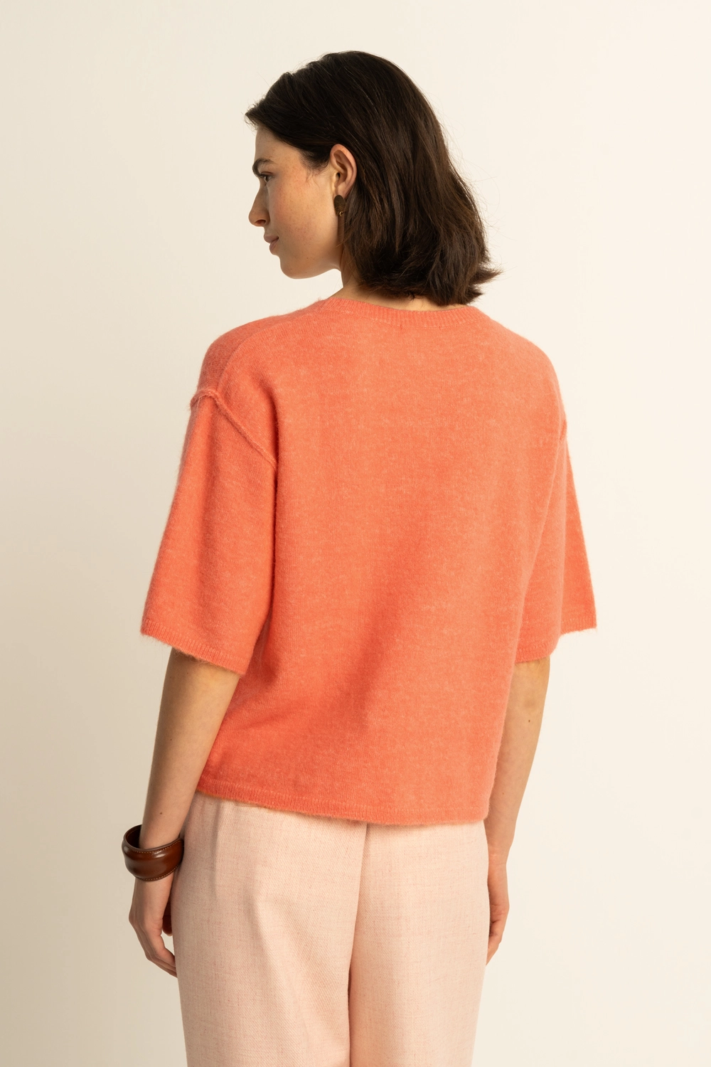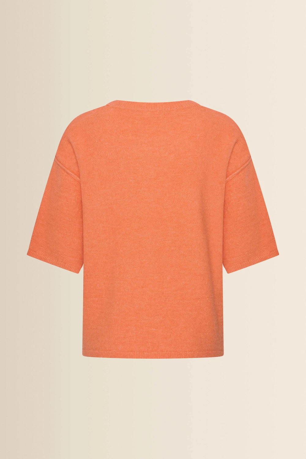 Fijngebreid T-shirt – zachte knit met een comfortabele, licht boxy fit. De korte mouwen en wijde ronde hals geven dit item een moderne, ontspannen uitstraling, terwijl de subtiele naad middenvoor zorgt voor een verfijnd detail. Een veelzijdige essential die moeiteloos meegaat van werkdag tot weekend.